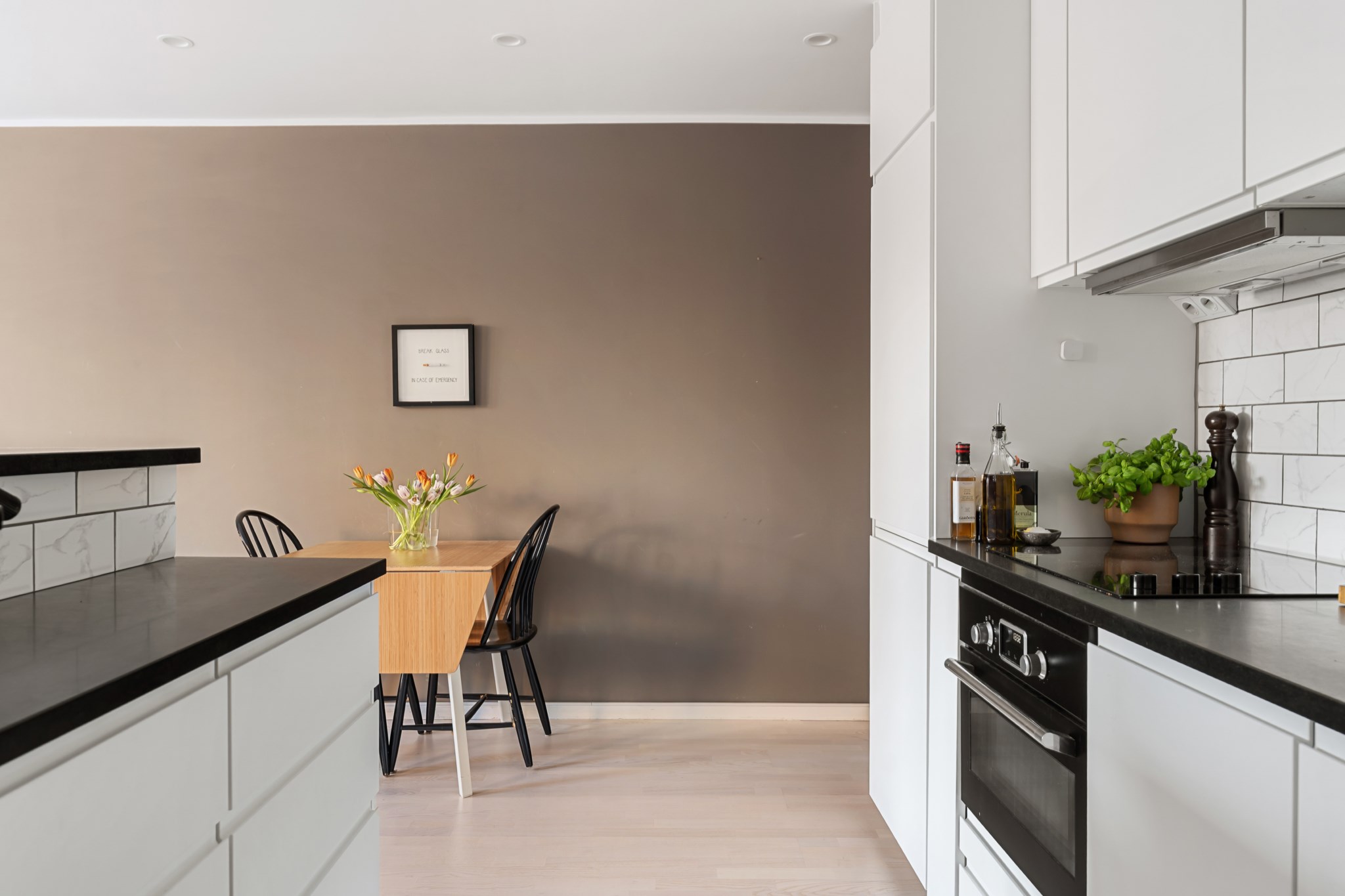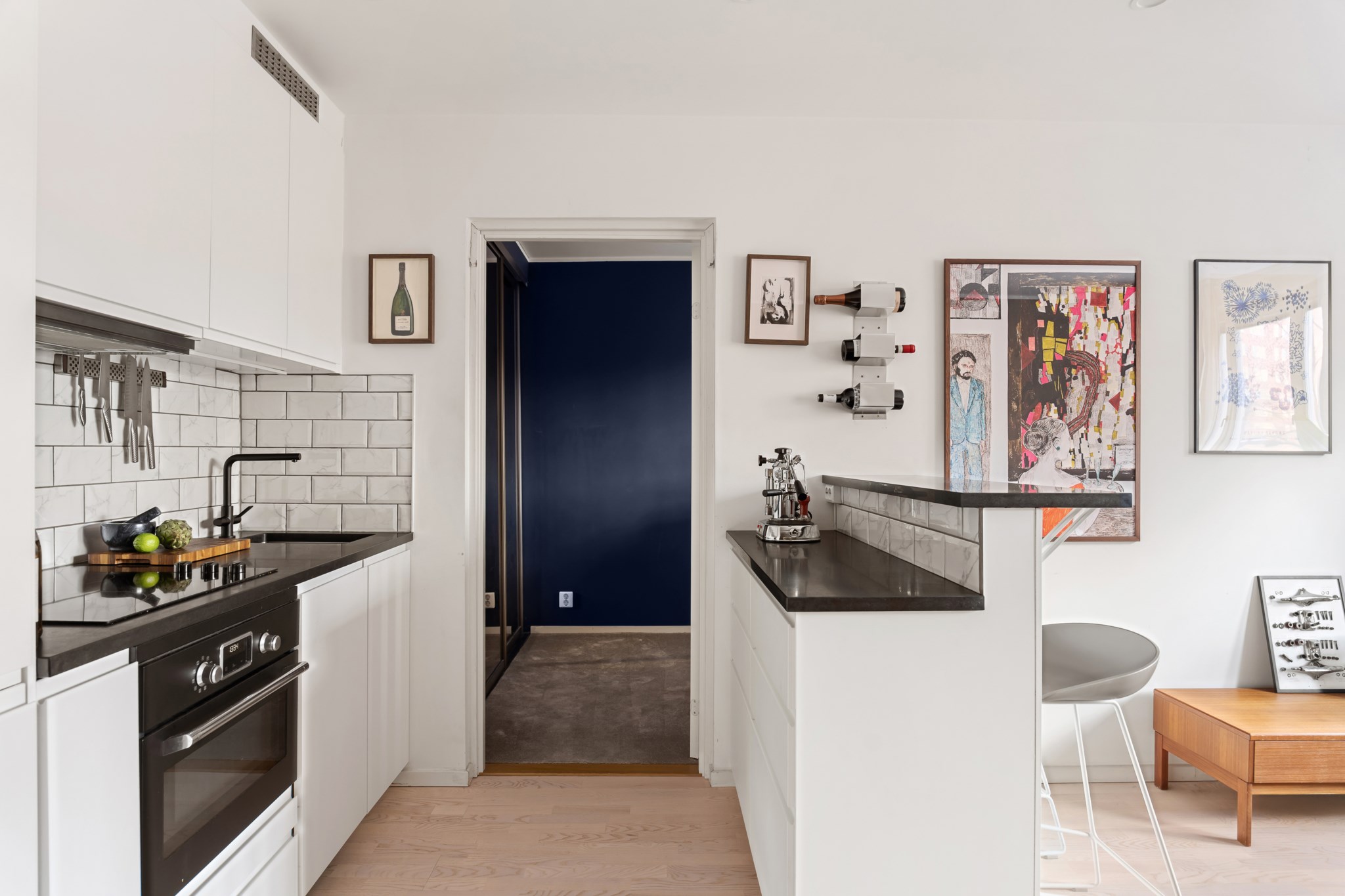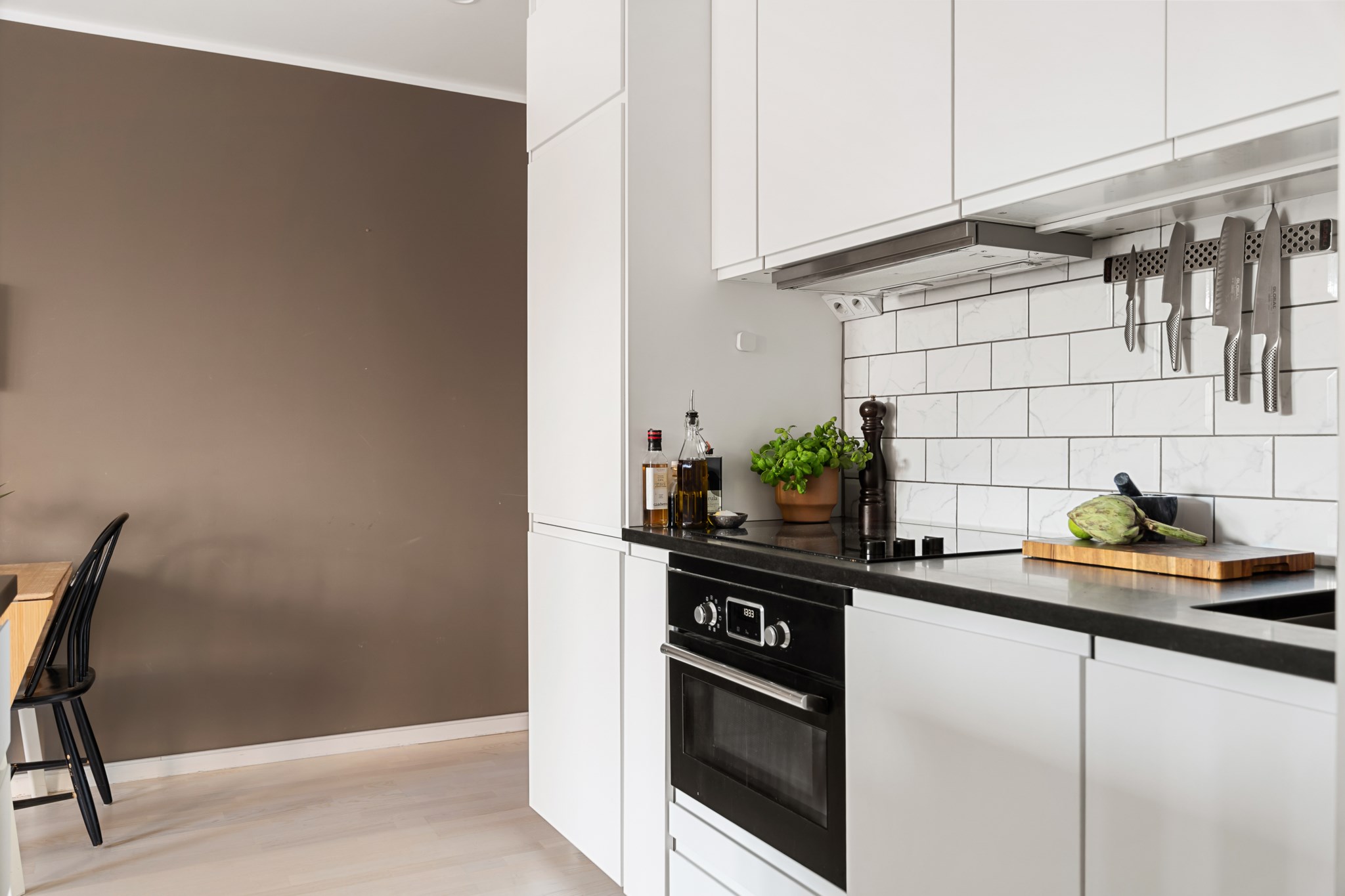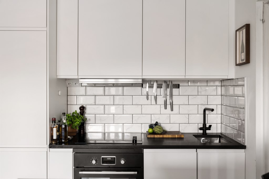 Stilrent och modernt kök i öppen planlösning mot vardagsrummet. Köket har vita skåpsluckor, svart granitskiva med semi-matt finish och kaklat stänkskydd i klassiskt utförande. Fullt utrustat med inbyggd ugn, häll, fläkt, diskmaskin samt goda arbetsytor. Köksön fungerar utmärkt som extra arbetsyta och social samlingspunkt.