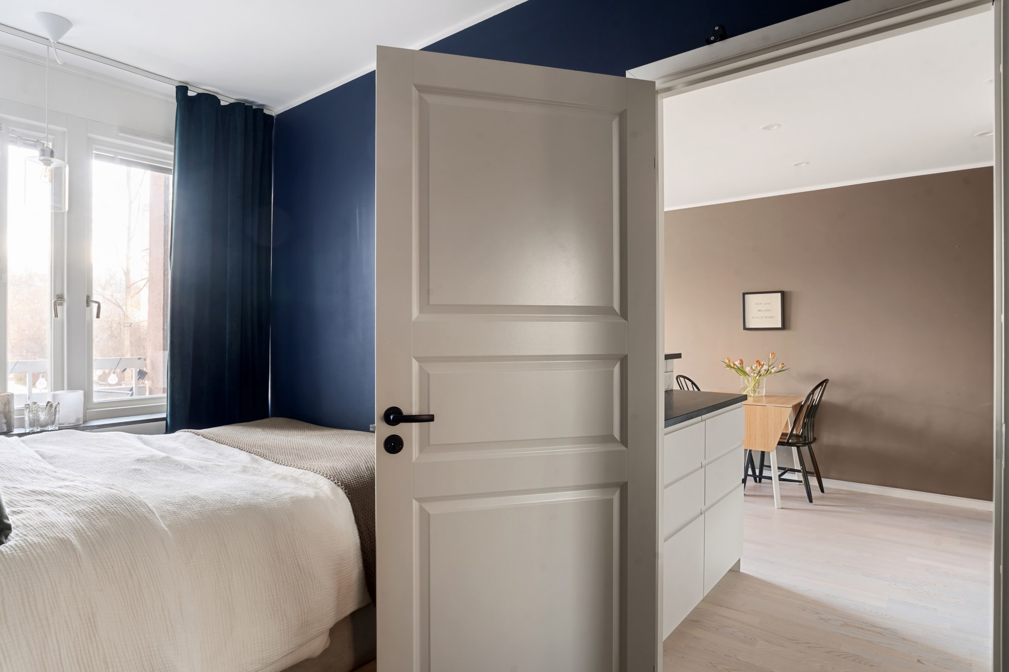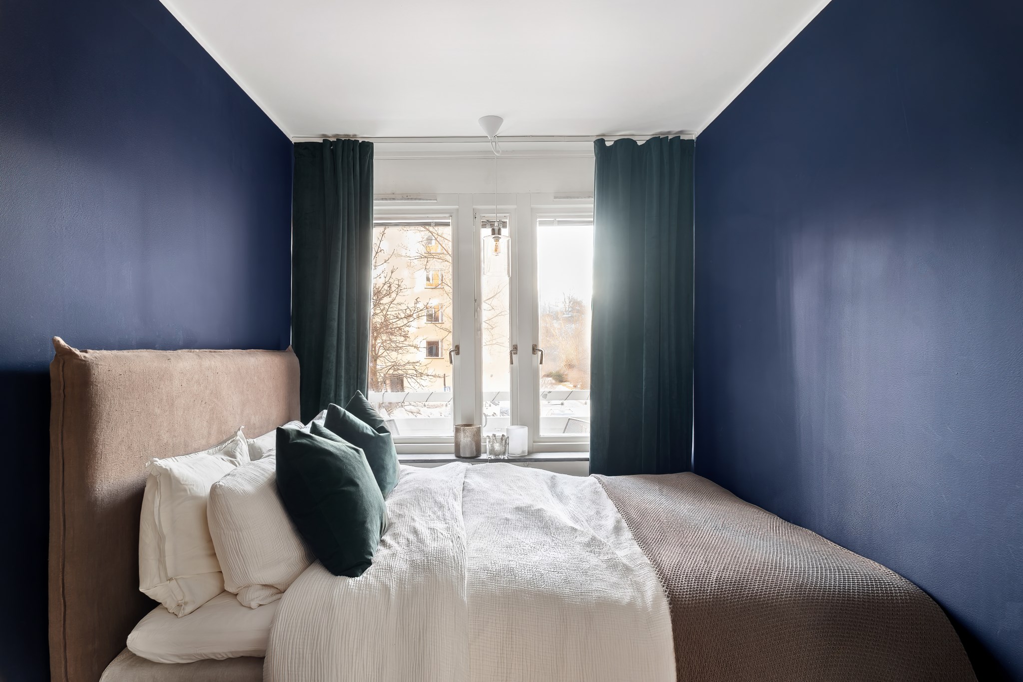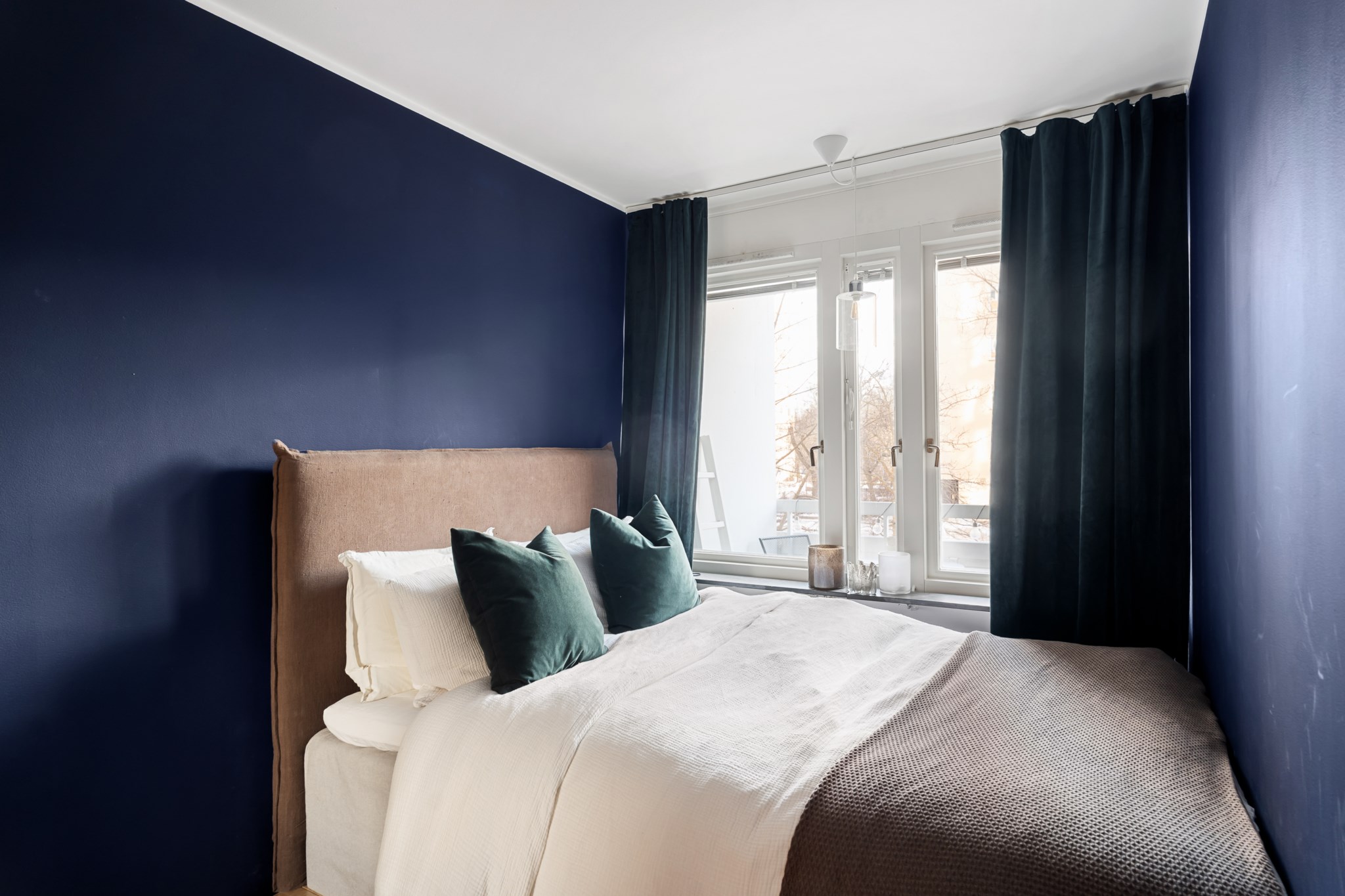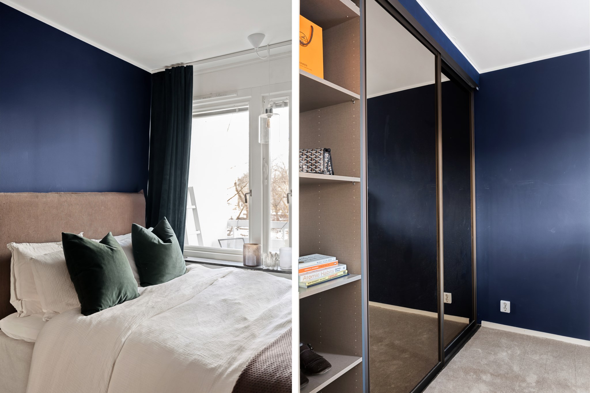 Rofyllt sovrum med plats för dubbelsäng och tillhörande möblemang. De mörkare väggtonerna ger rummet en ombonad och lugn känsla. Här finns god förvaring i garderober med skjutdörrar samt fint ljusinsläpp från fönster.