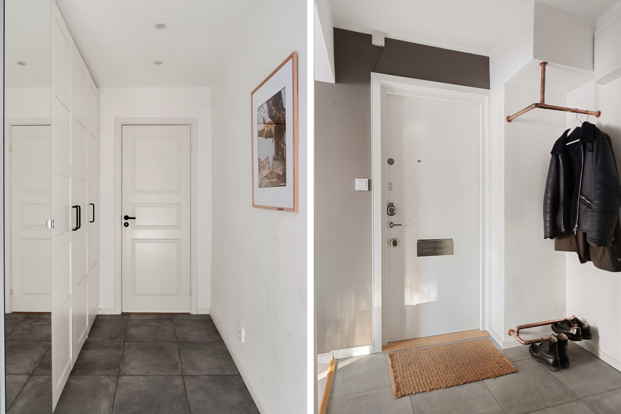 Välkomnande och funktionell hall med slitstarkt klinkergolv och goda förvaringsmöjligheter i garderober. Här finns plats för avhängning och skoförvaring. Hallen binder samman bostaden på ett naturligt sätt och ger ett trevligt första intryck.