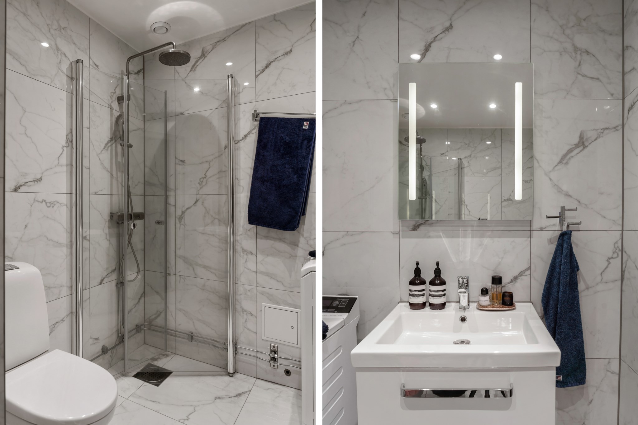 Helkaklat och stilrent badrum i marmorerat utförande. Utrustat med dusch med glasväggar, wc, handfat med kommod, spegel med belysning samt tvättmaskin. Ett modernt badrum med både komfort och funktion i fokus.