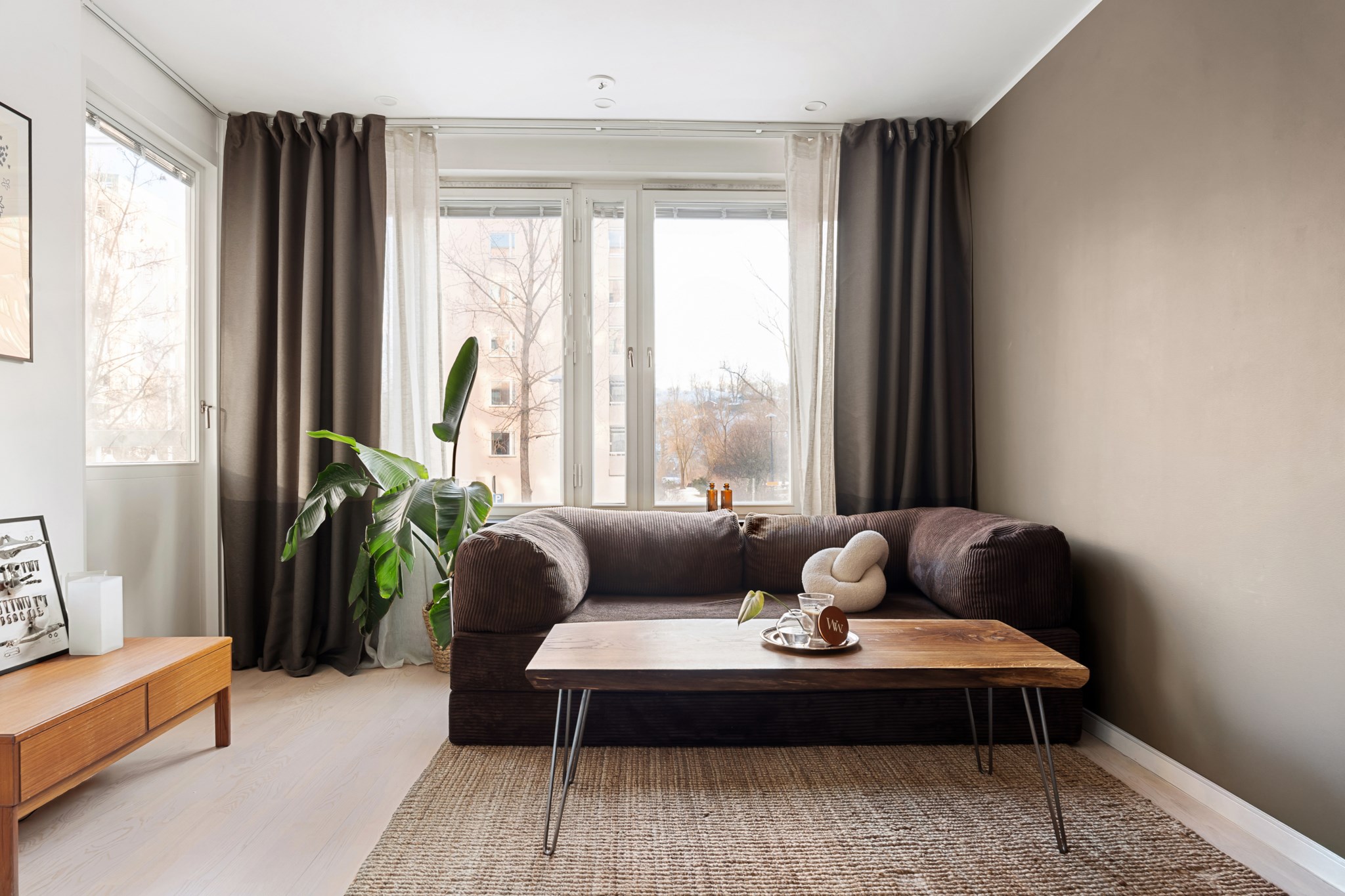 Ljust och trivsamt vardagsrum med generöst ljusinsläpp från stora fönsterpartier. Rummet erbjuder gott om plats för både soffgrupp och matplats. Harmoniska färgval och ljusa golv skapar en luftig och inbjudande atmosfär. Härifrån nås även bostadens balkong som vetter mot söder, som förlänger rummet under årets varmare månader.