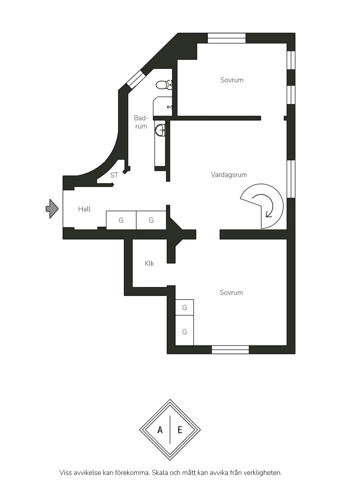 Våningsplanen binds samman av en vacker spiraltrappa med anrik historia. Den imponerande takhöjden ger en sällsynt känsla av rymd, med över sju meters fri höjd vid trappan. Entréplanet präglas av sociala ytor med rymlig hall och ett stort kök med plats för större sällskap samt utgång till balkongen. Det nedre planet har en mer privat karaktär och inrymmer sovrum, vardagsrum och arbetsplats. Badrum finns på båda våningsplanen.