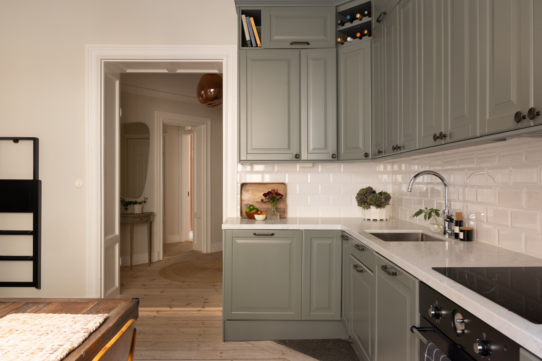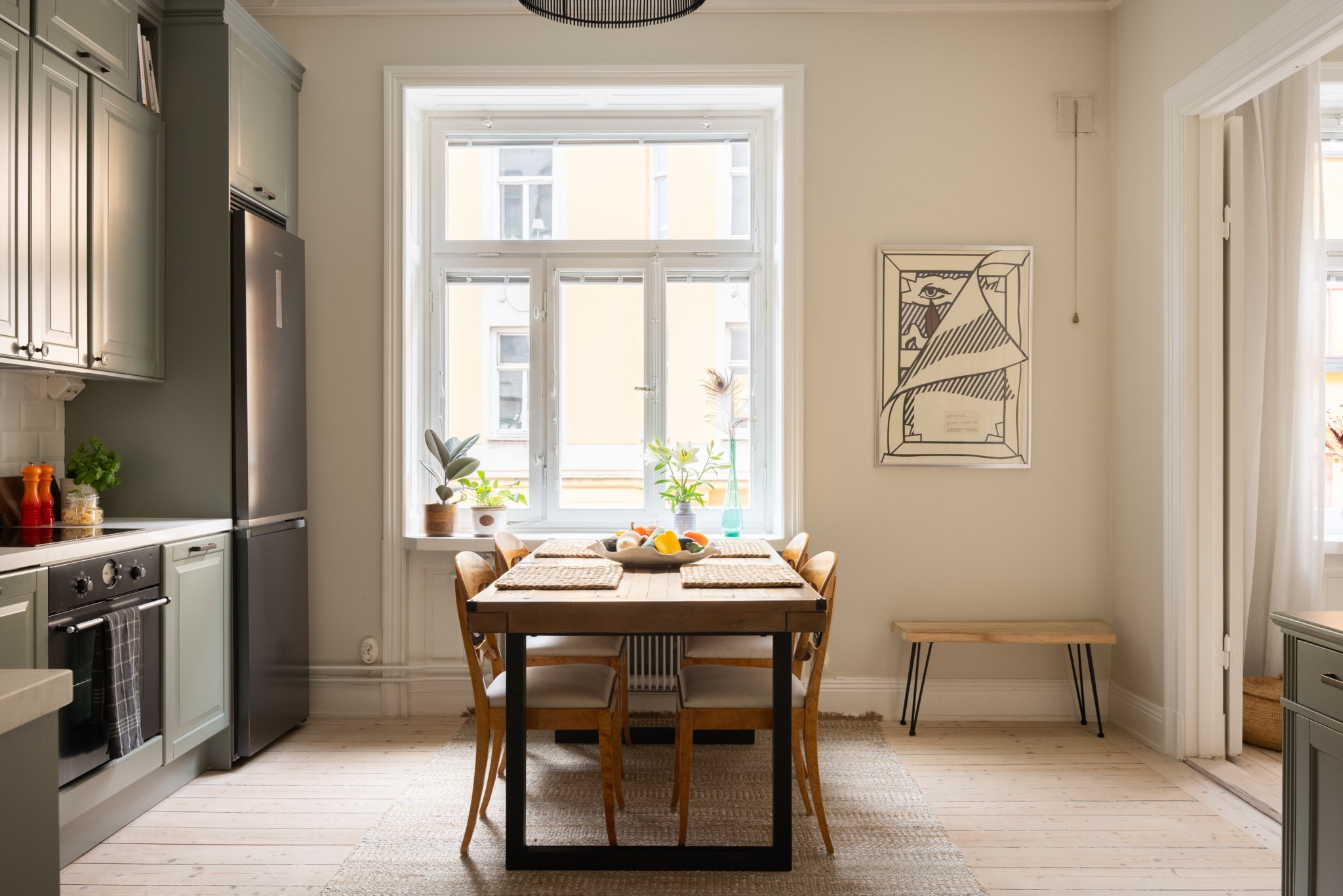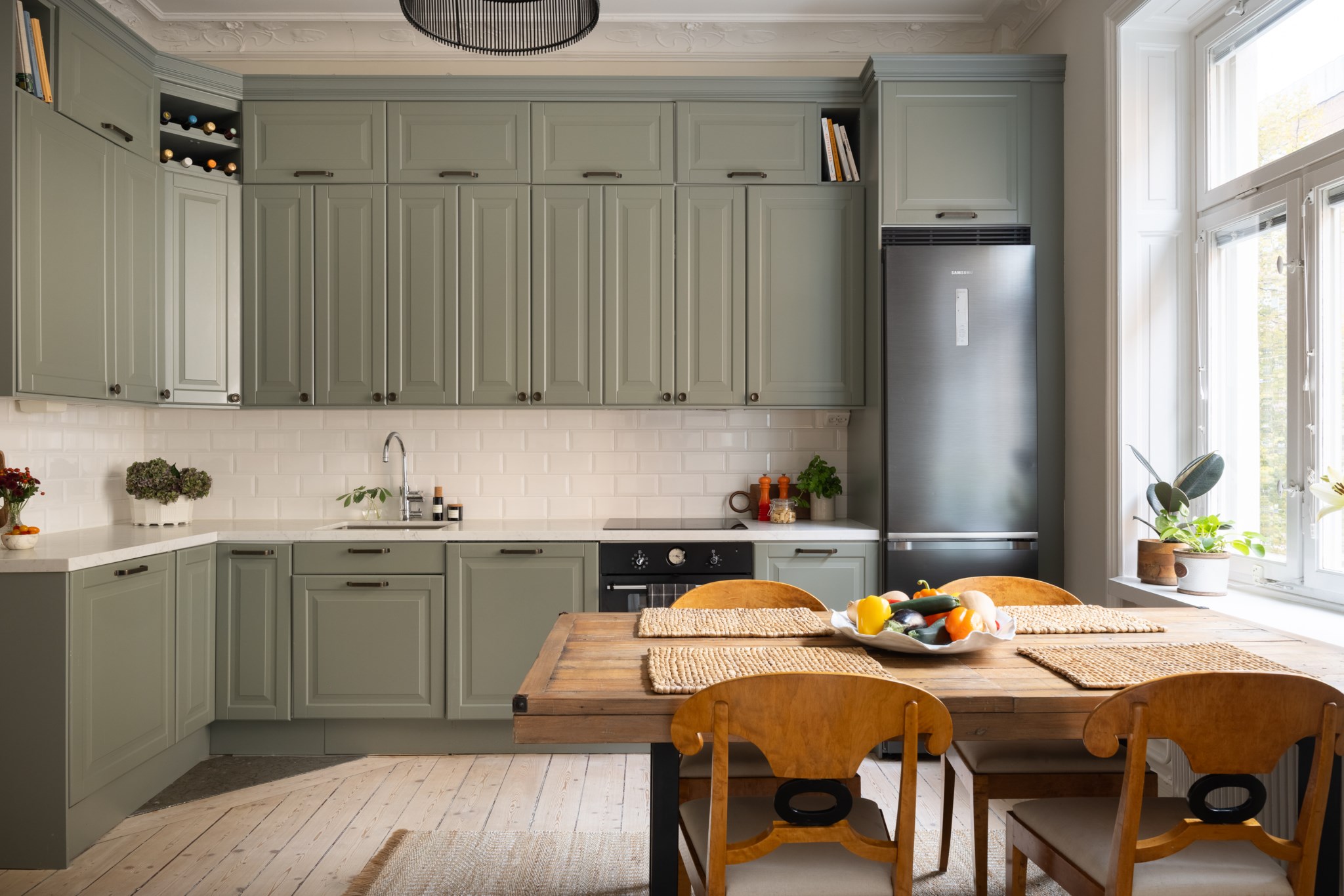 Smakfullt kök med förvaring bakom köksluckor i grön nyans och arbetsyta ovan ljus bänkskiva. Ytskikt bestående av ljusa väggar och ljust trägolv samt detaljer som takstuckatur. Den maskinella utrustningen består av diskho, häll, ugn, diskmaskin samt kyl och frys. Köket har ett härligt ljusinsläpp via fönster. Här inryms matgrupp och annat möblemang efter smak och behov.