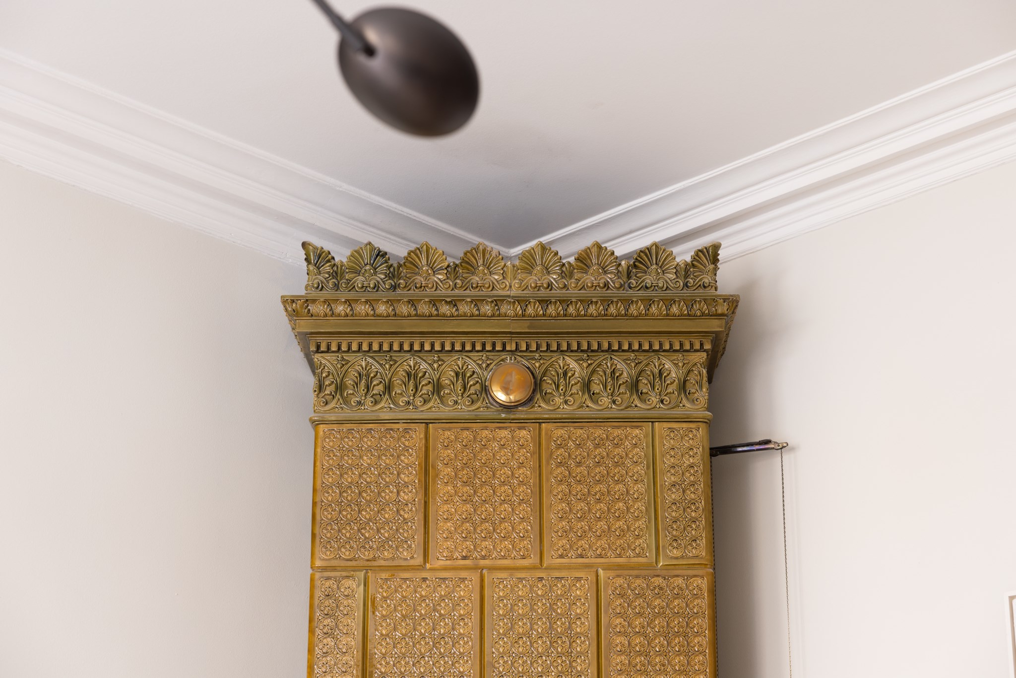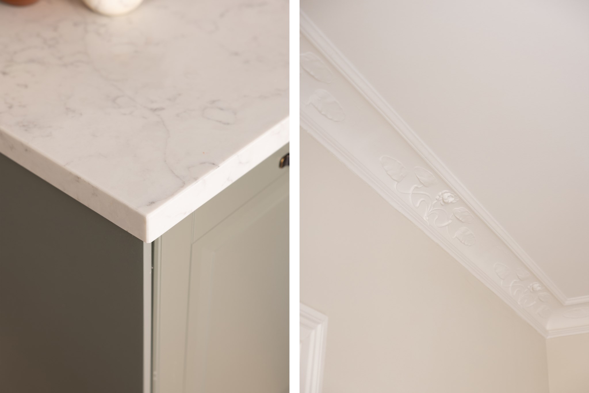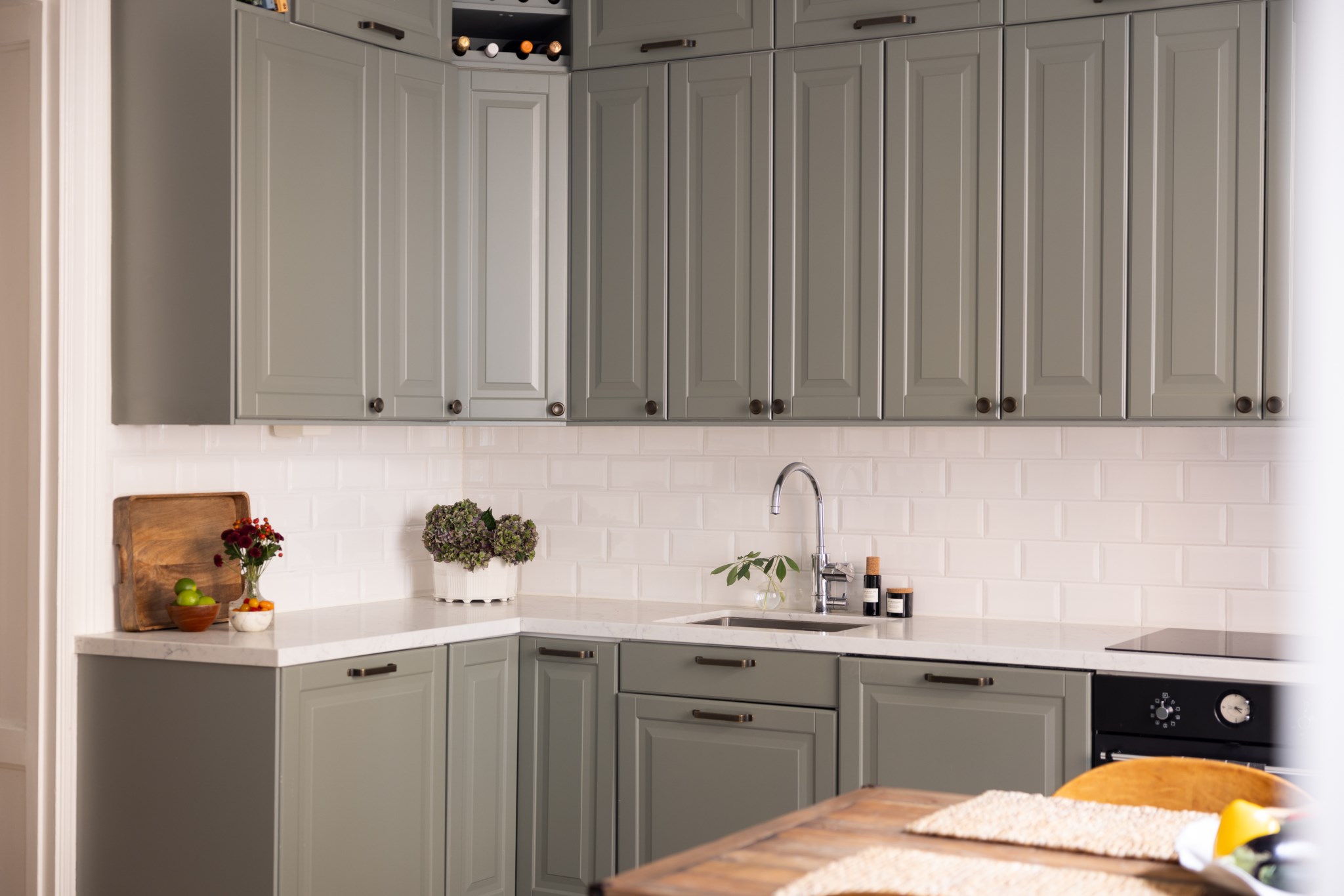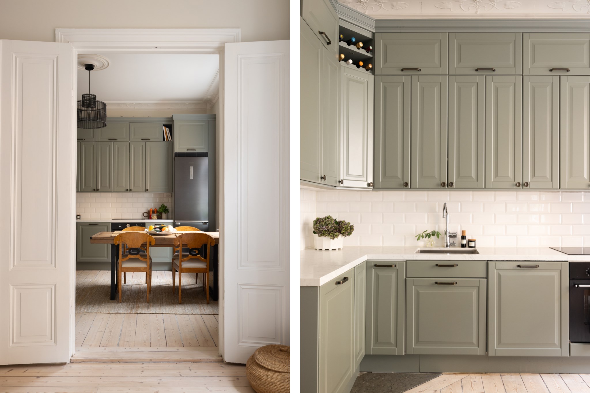 Smakfullt kök med förvaring bakom köksluckor i grön nyans och arbetsyta ovan ljus bänkskiva. Ytskikt bestående av ljusa väggar och ljust trägolv samt detaljer som takstuckatur. Den maskinella utrustningen består av diskho, häll, ugn, diskmaskin samt kyl och frys. Köket har ett härligt ljusinsläpp via fönster. Här inryms matgrupp och annat möblemang efter smak och behov.
