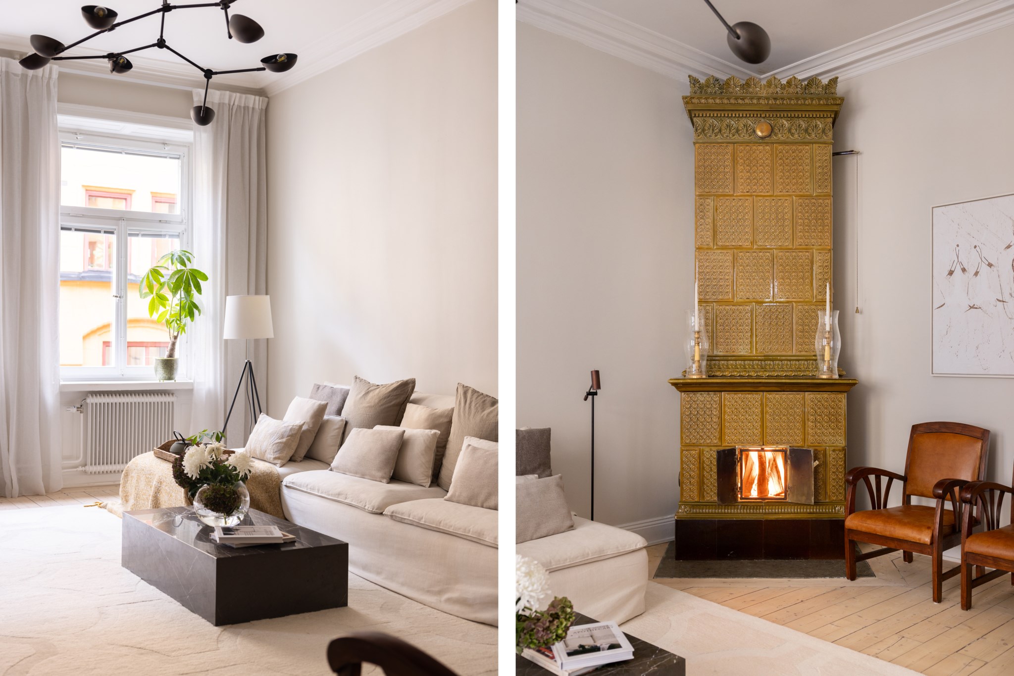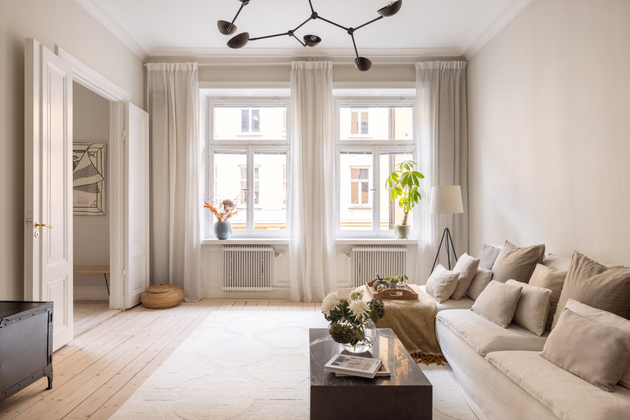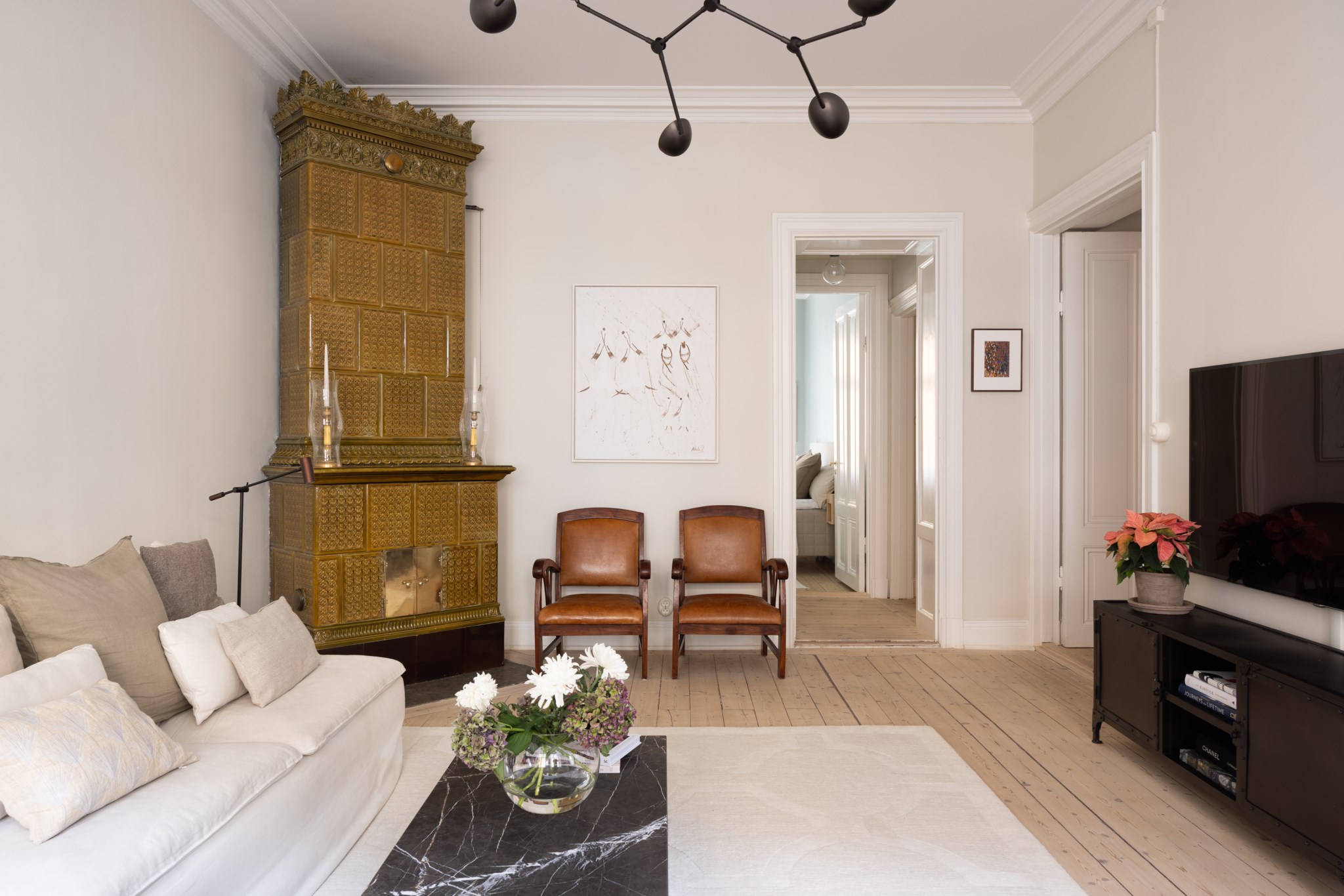 I vardagsrummet möts du av ett härligt ljusinsläpp via stort fönster med spröjs. Ytskikten består av ljusa väggar och ljust trägolv samt detaljer som takstuckatur och kakelugn. Här inryms soffa, soffbord, TV-möbel och annat möblemang efter smak och behov.