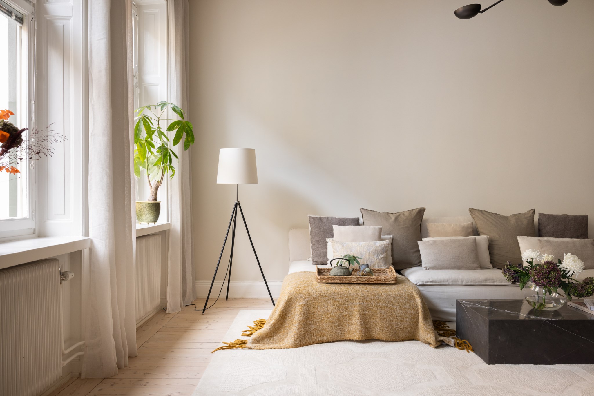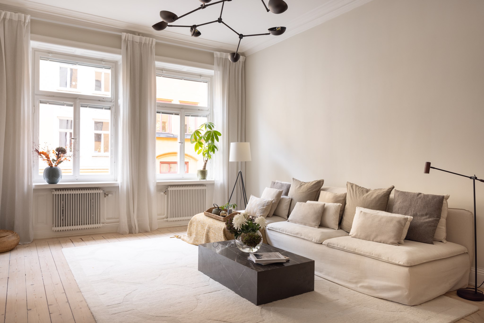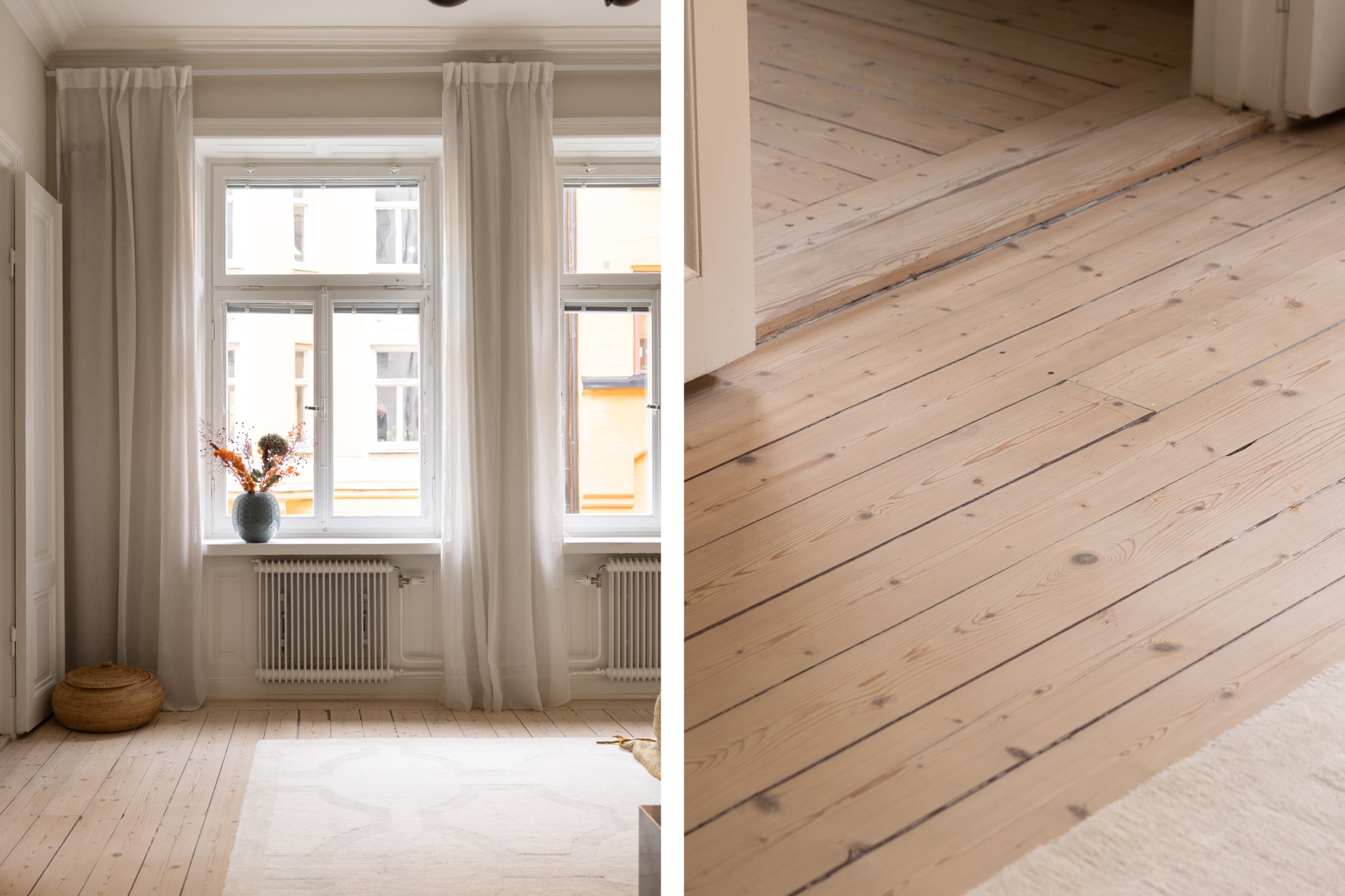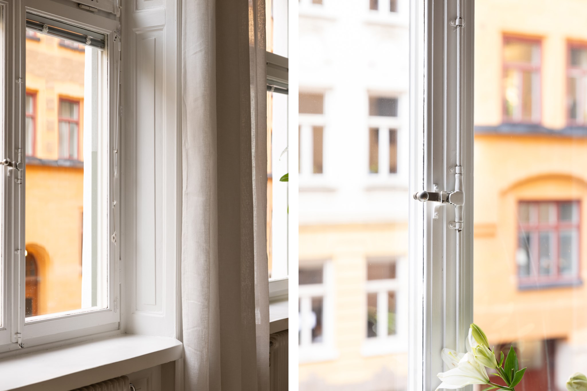 I vardagsrummet möts du av ett härligt ljusinsläpp via stort fönster med spröjs. Ytskikten består av ljusa väggar och ljust trägolv samt detaljer som takstuckatur och kakelugn. Här inryms soffa, soffbord, TV-möbel och annat möblemang efter smak och behov.