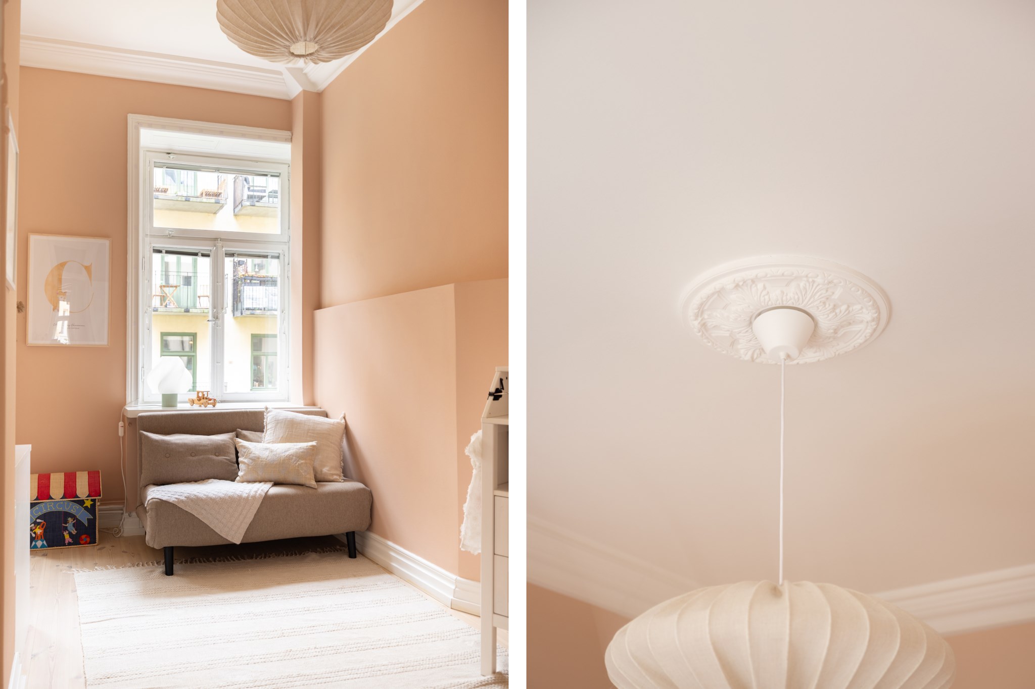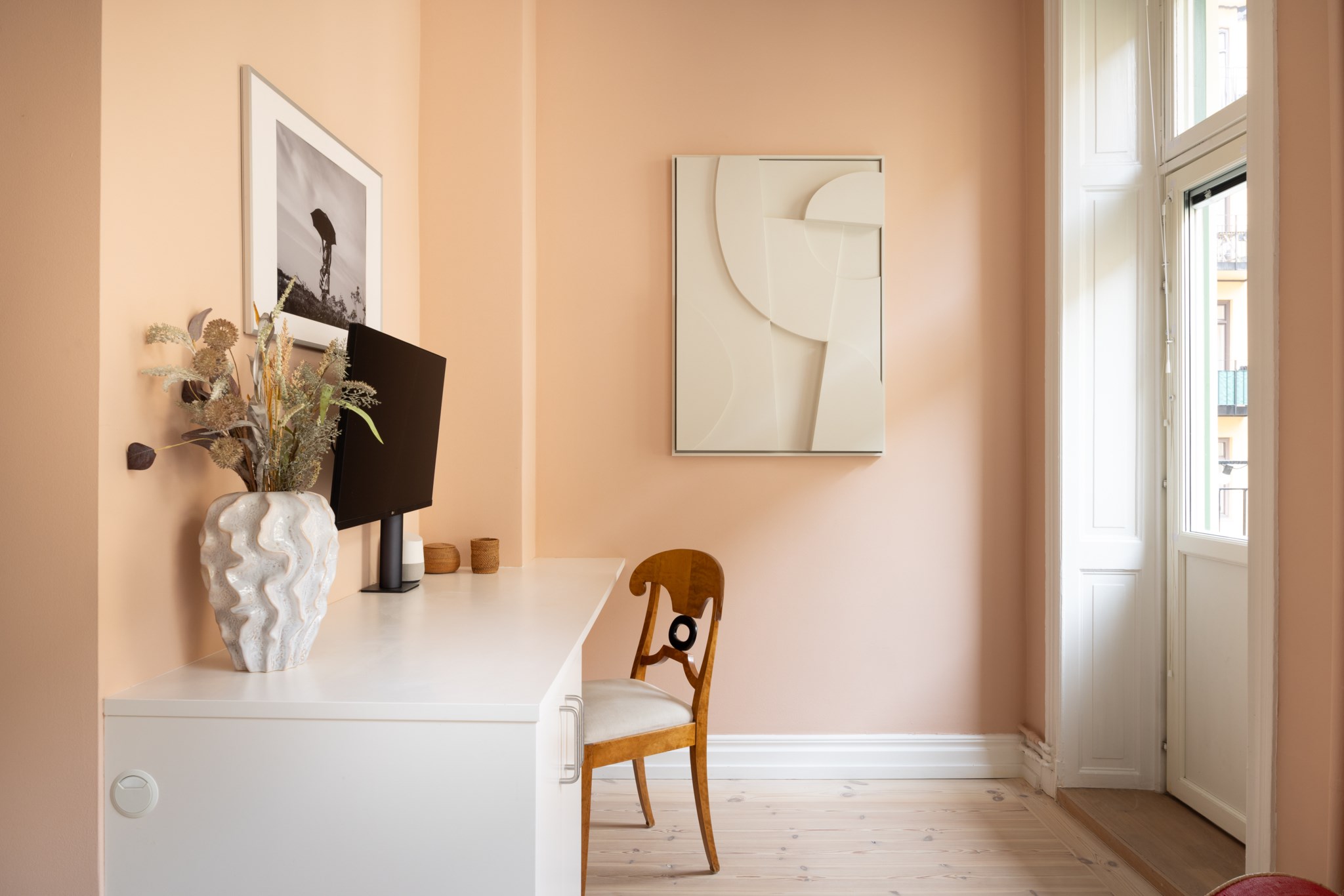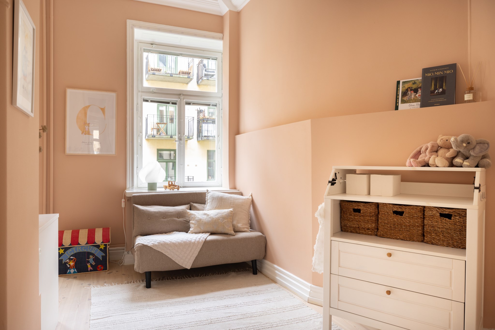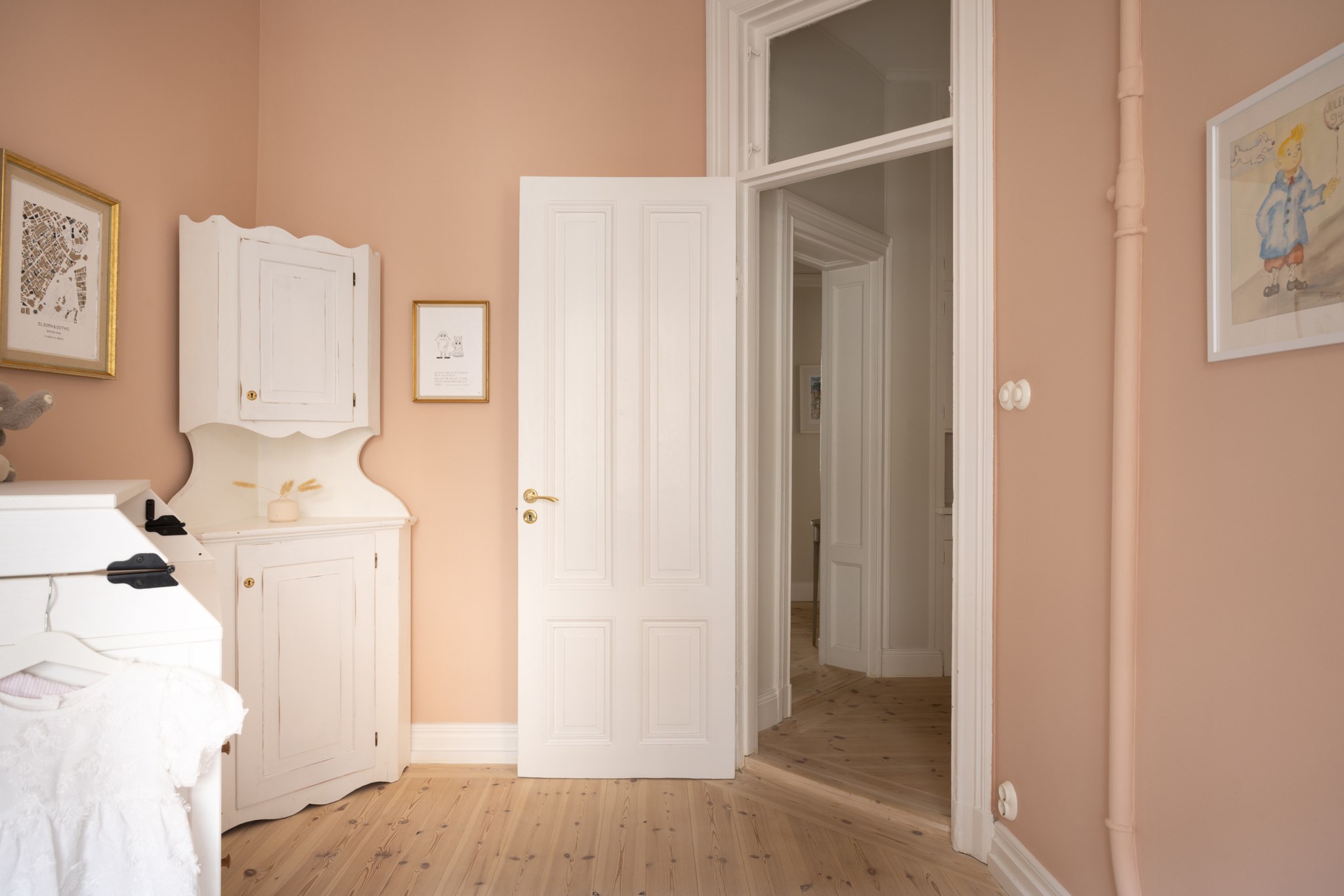 Luftigt sovrum med plats för säng och tillhörande sängbord samt annat möblemang efter smak och behov. Tidlösa ytskikt bestående av ljusa väggar i rosa nyans och ljust trägolv. Utgång till lägenhetens mysiga balkong.