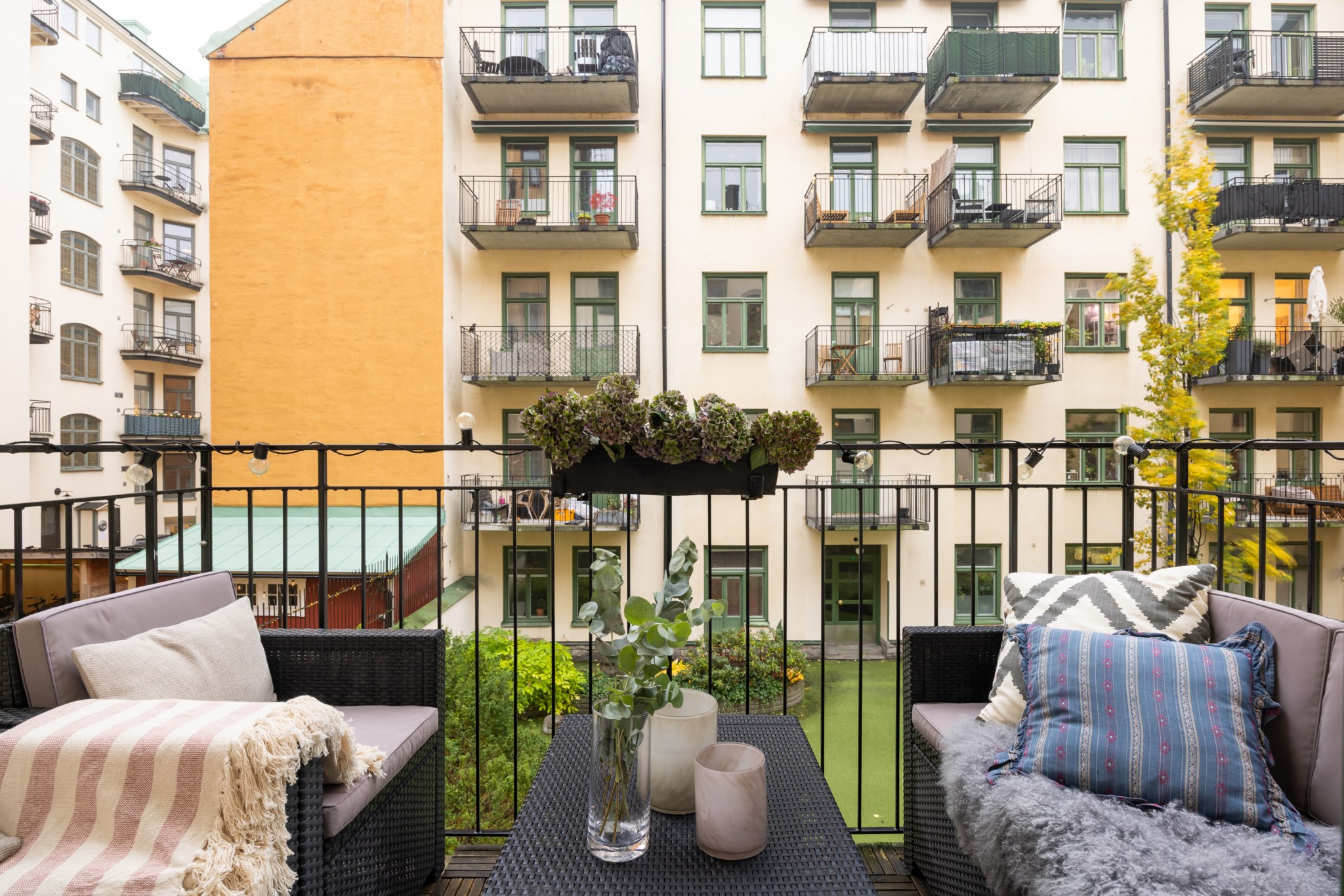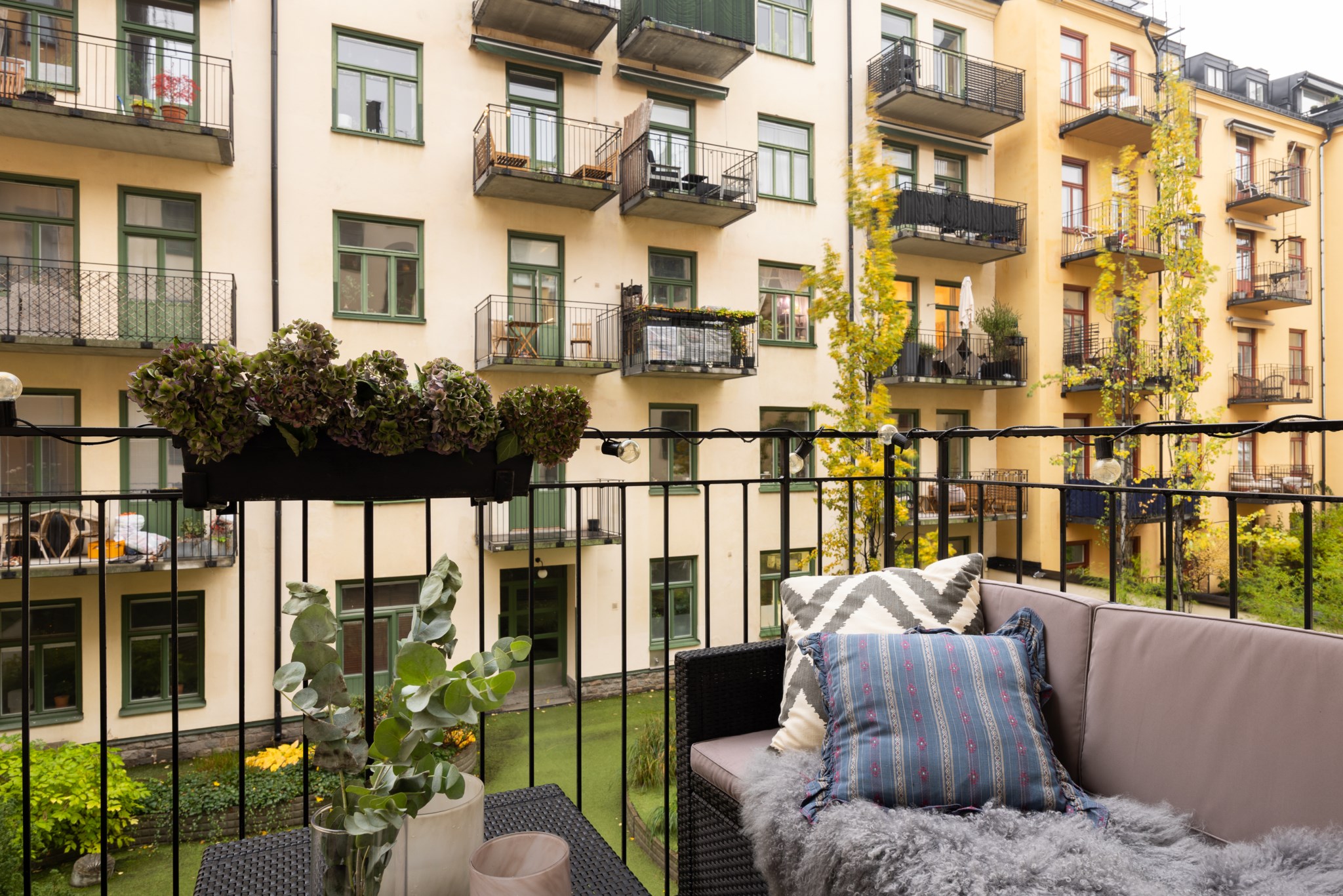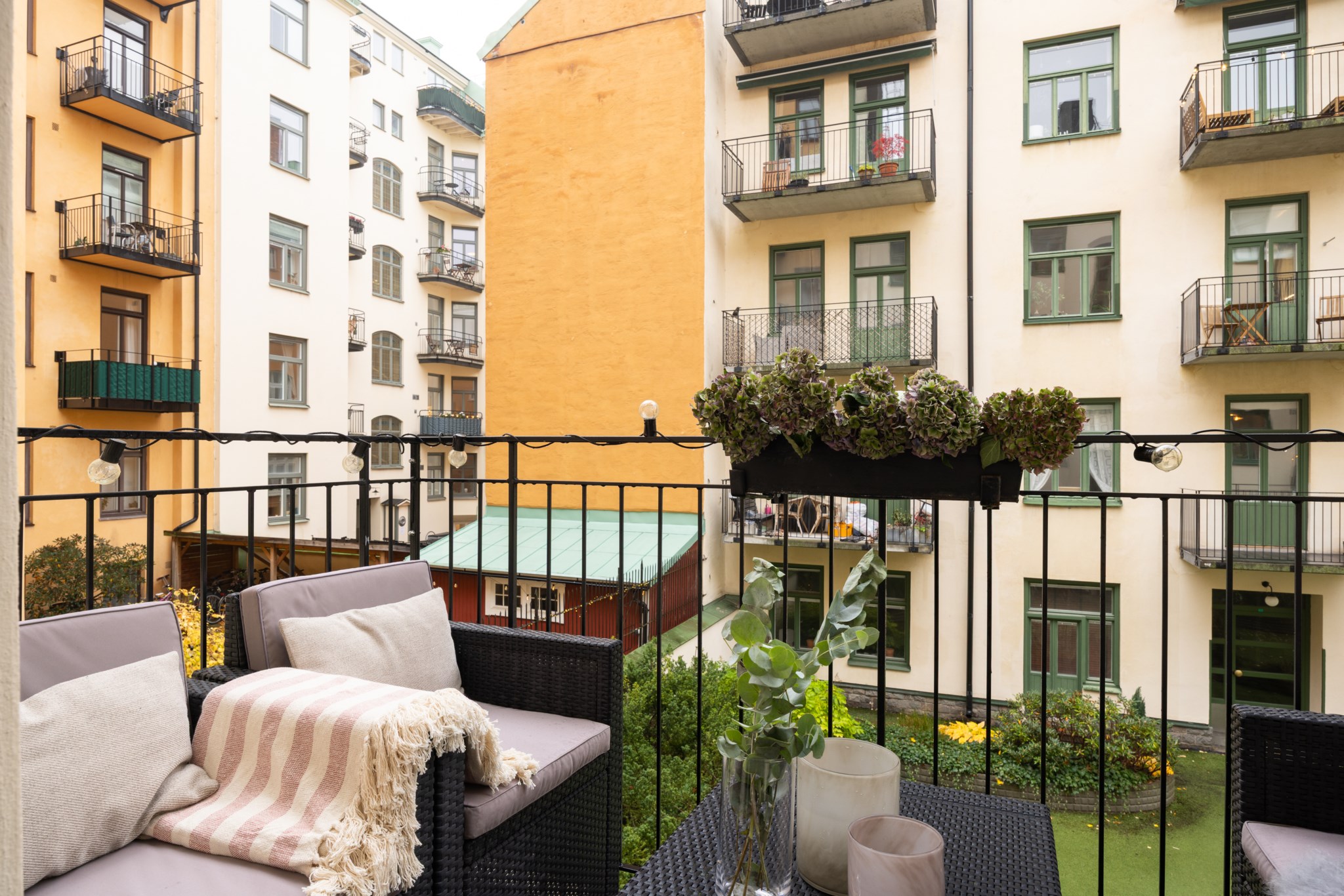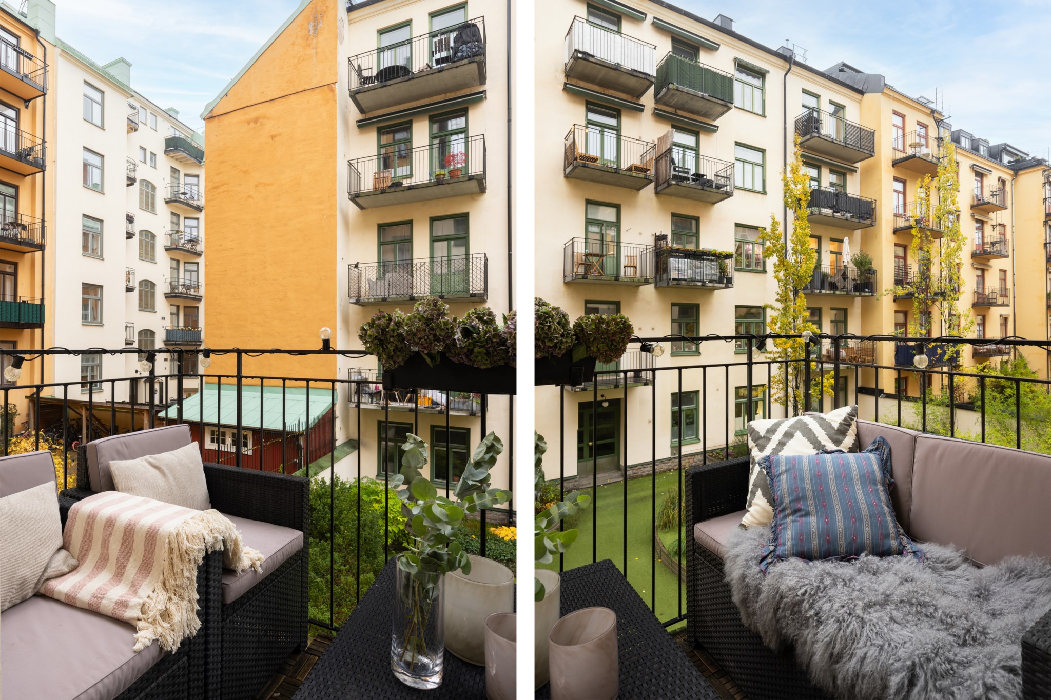 Luftigt sovrum med plats för säng och tillhörande sängbord samt annat möblemang efter smak och behov. Tidlösa ytskikt bestående av ljusa väggar i rosa nyans och ljust trägolv. Utgång till lägenhetens mysiga balkong.
