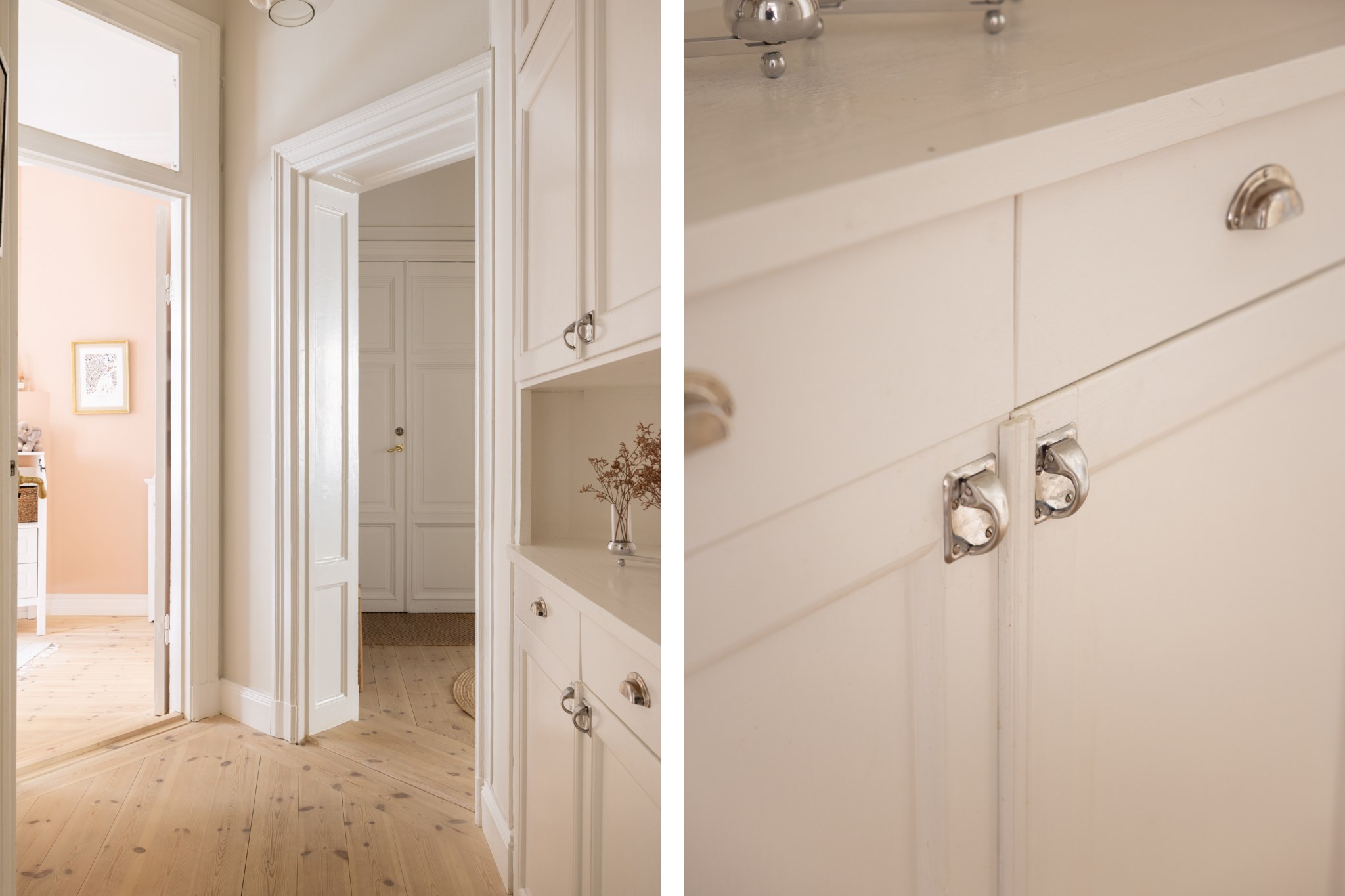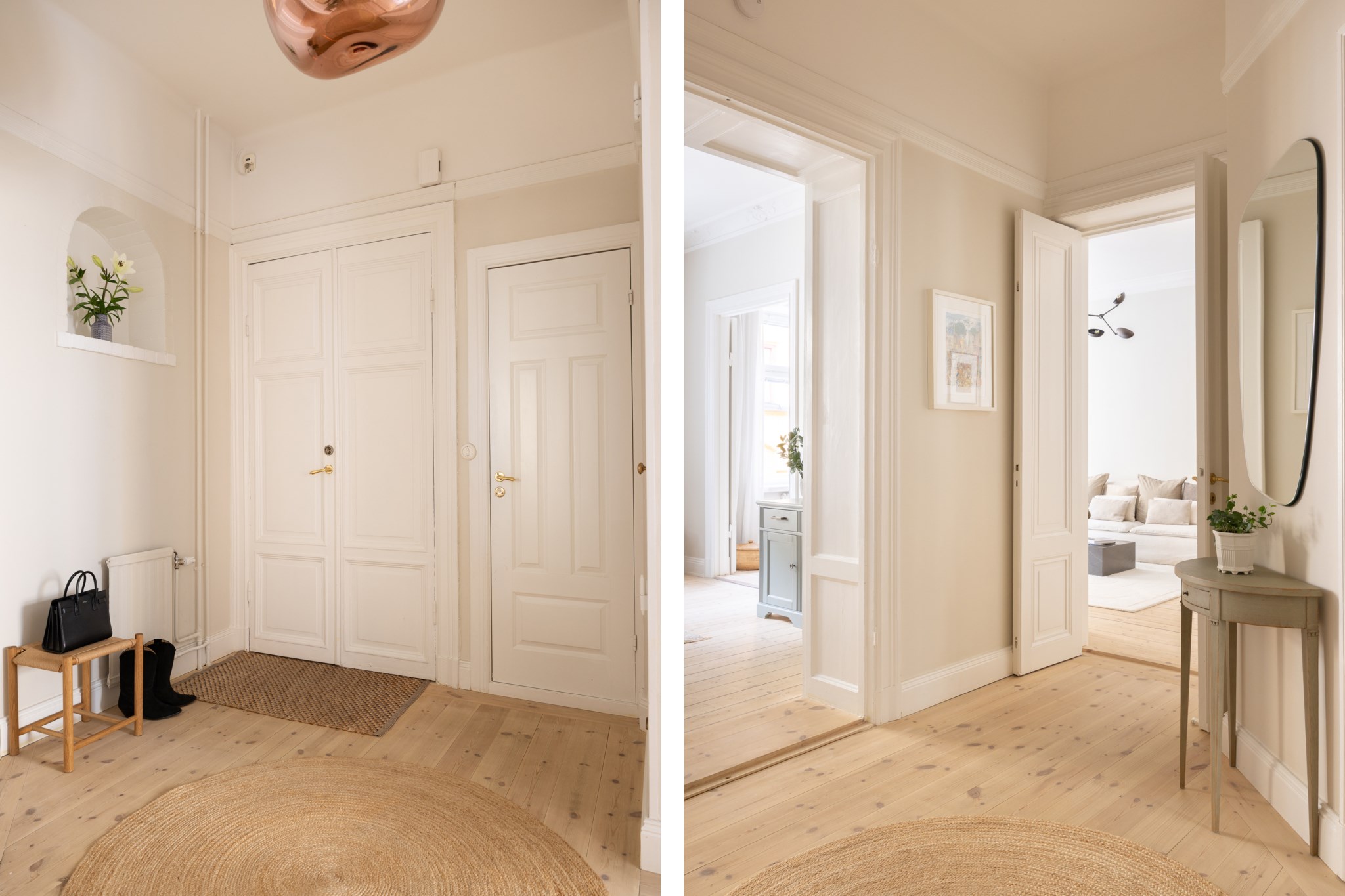 Rymlig och välkomnande hall med plats för avhängning, skoställ och avlastningsmöbel efter önskemål. Ytskikten består av ljusa väggar och ljust trägolv.