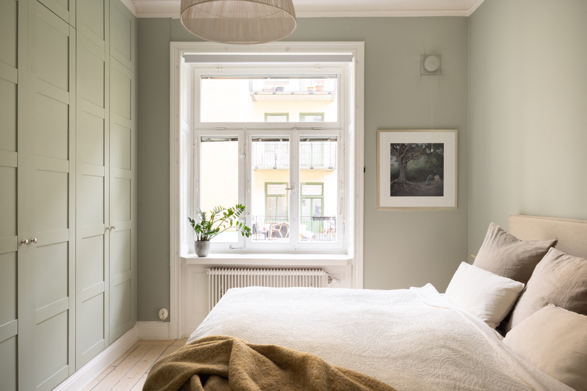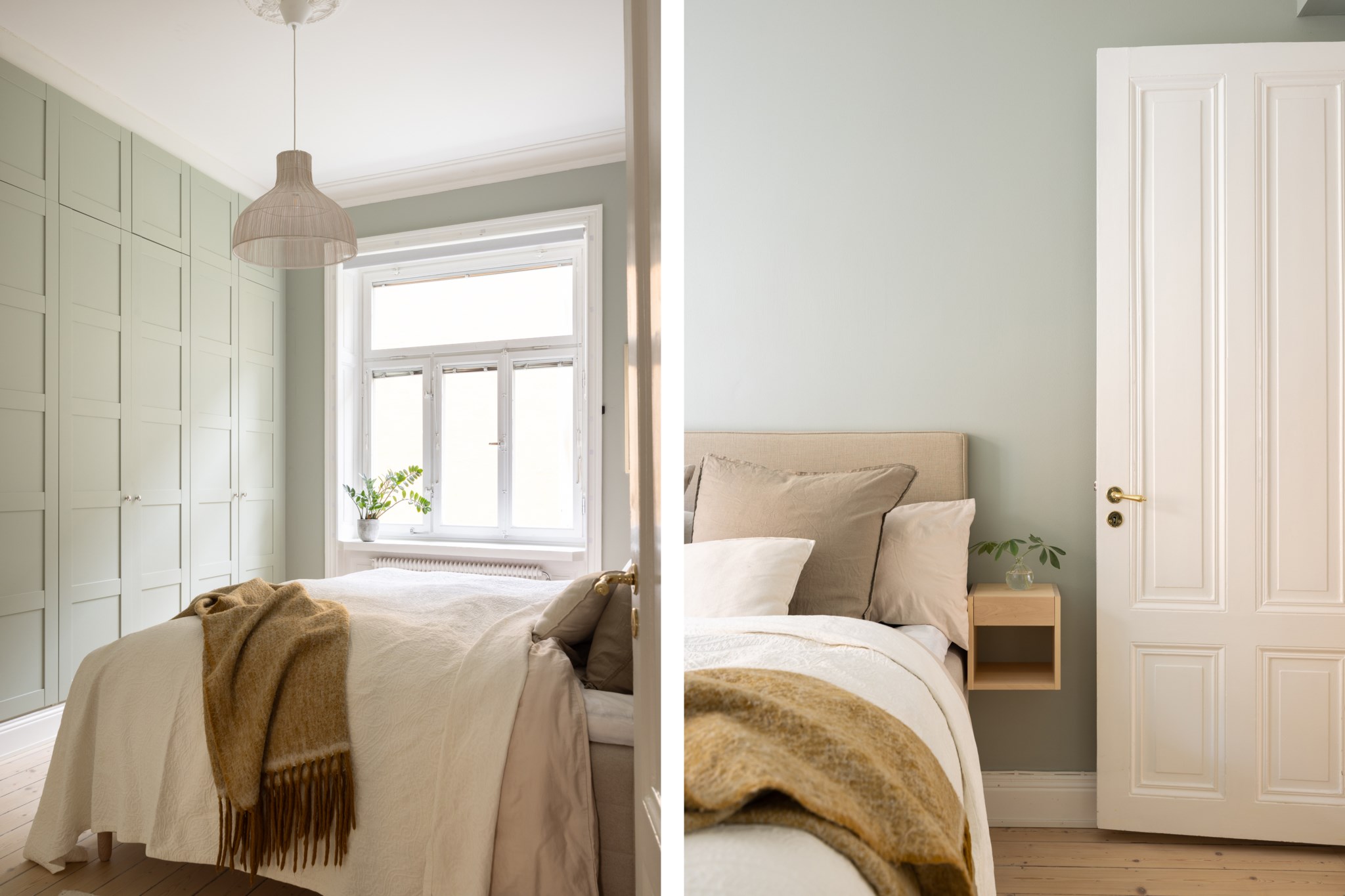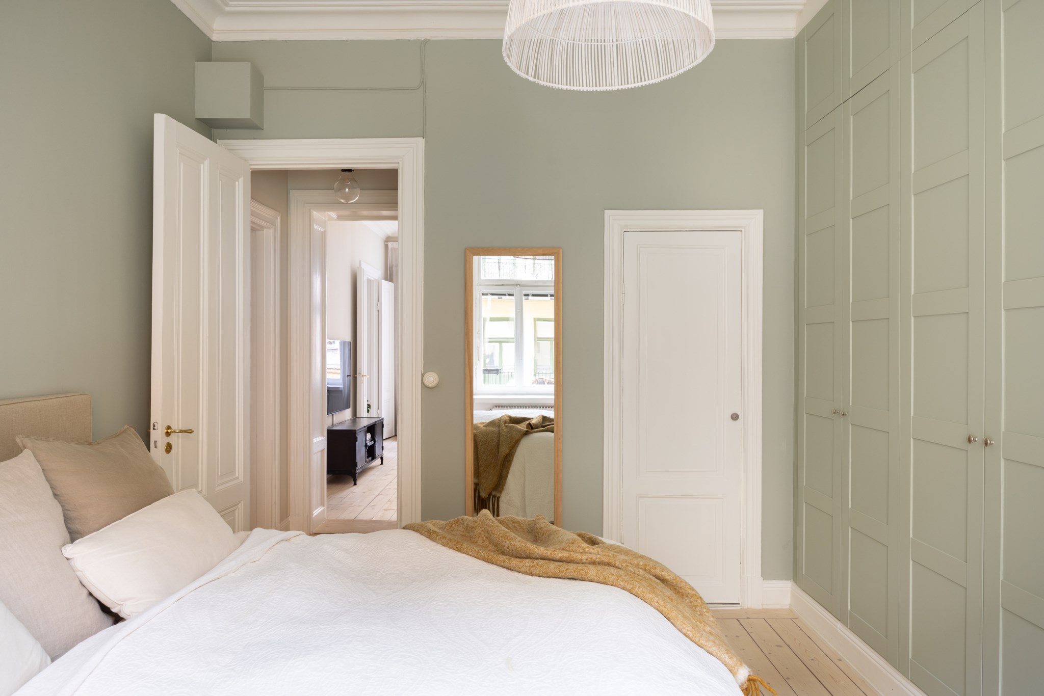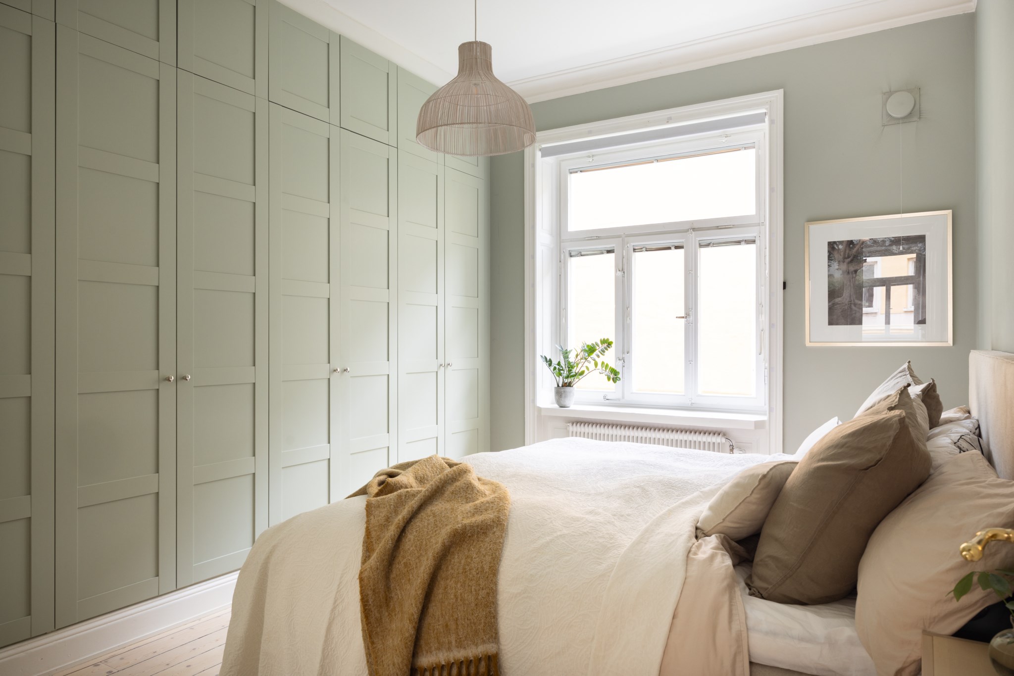 Luftigt sovrum med gott om plats för dubbelsäng och tillhörande sängbord samt annat möblemang efter smak och behov. Tidlösa ytskikt bestående av ljusa väggar i grön nyans och ljust trägolv. Sovrummet erbjuder generöst med förvaring via garderobsparti.