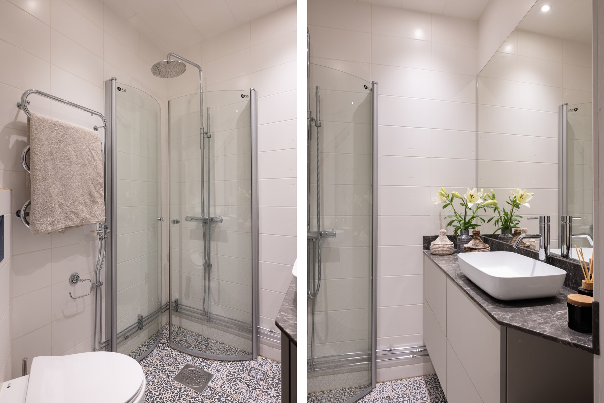 Stort badrum med vitt kakel och ljust klinker i fint mönster. Badrummet är utrustat med WC, handfat ovan kommod, stor spegel, handdukstork, dusch med glasväggar.