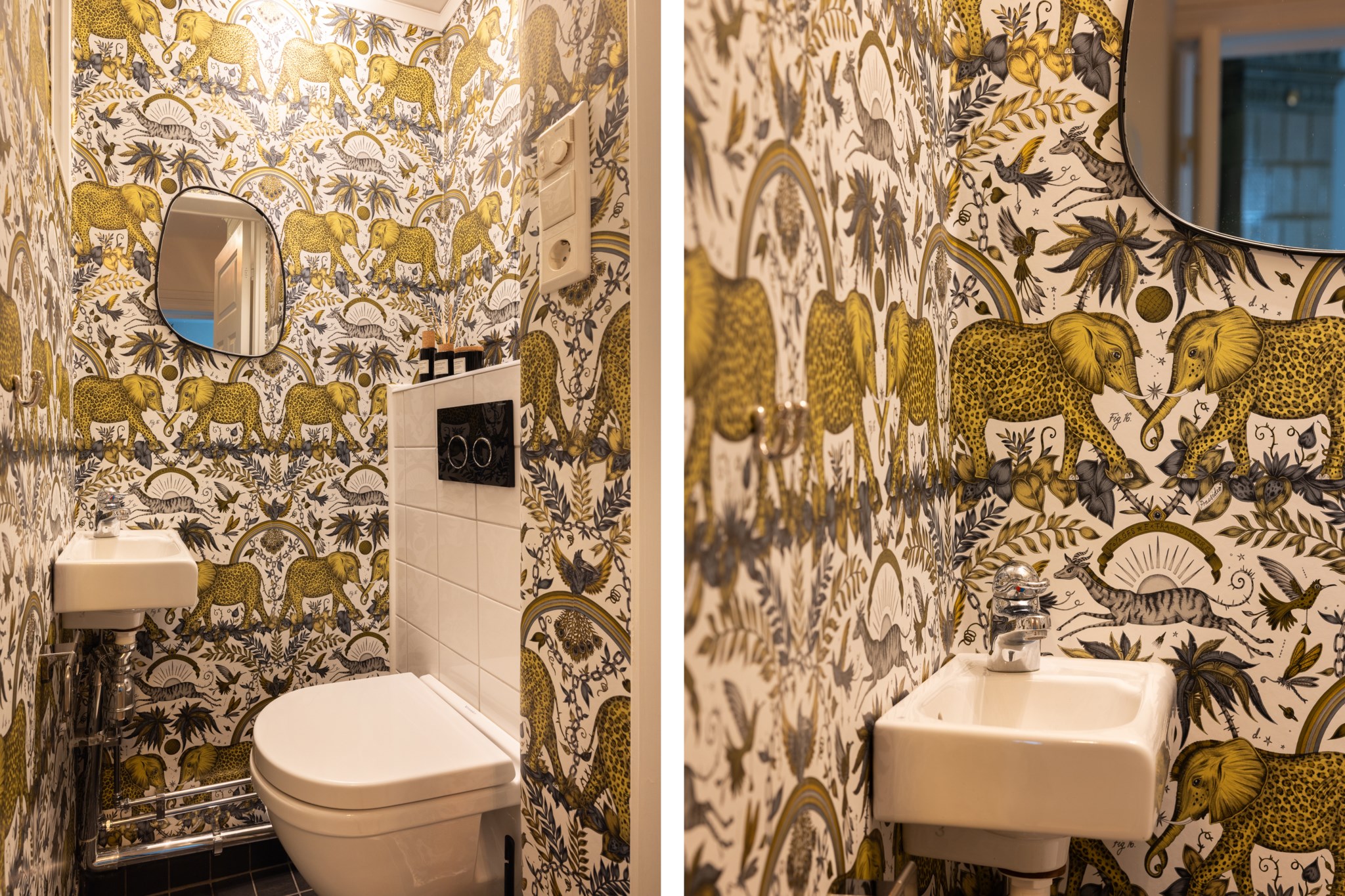Praktisk WC med tapetserade väggar i fint mönster och mörkt klinker. Utrustat med WC, handfat och en spegel.