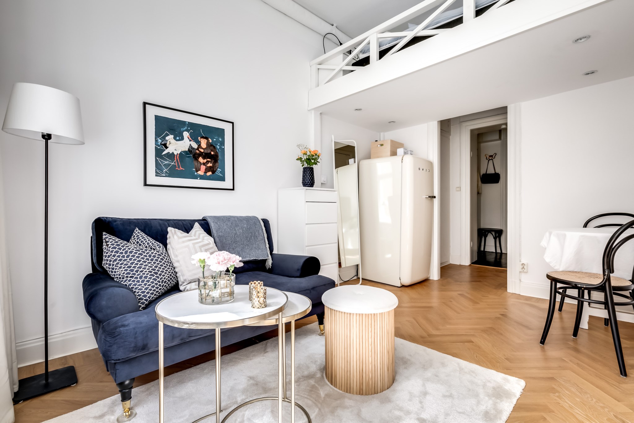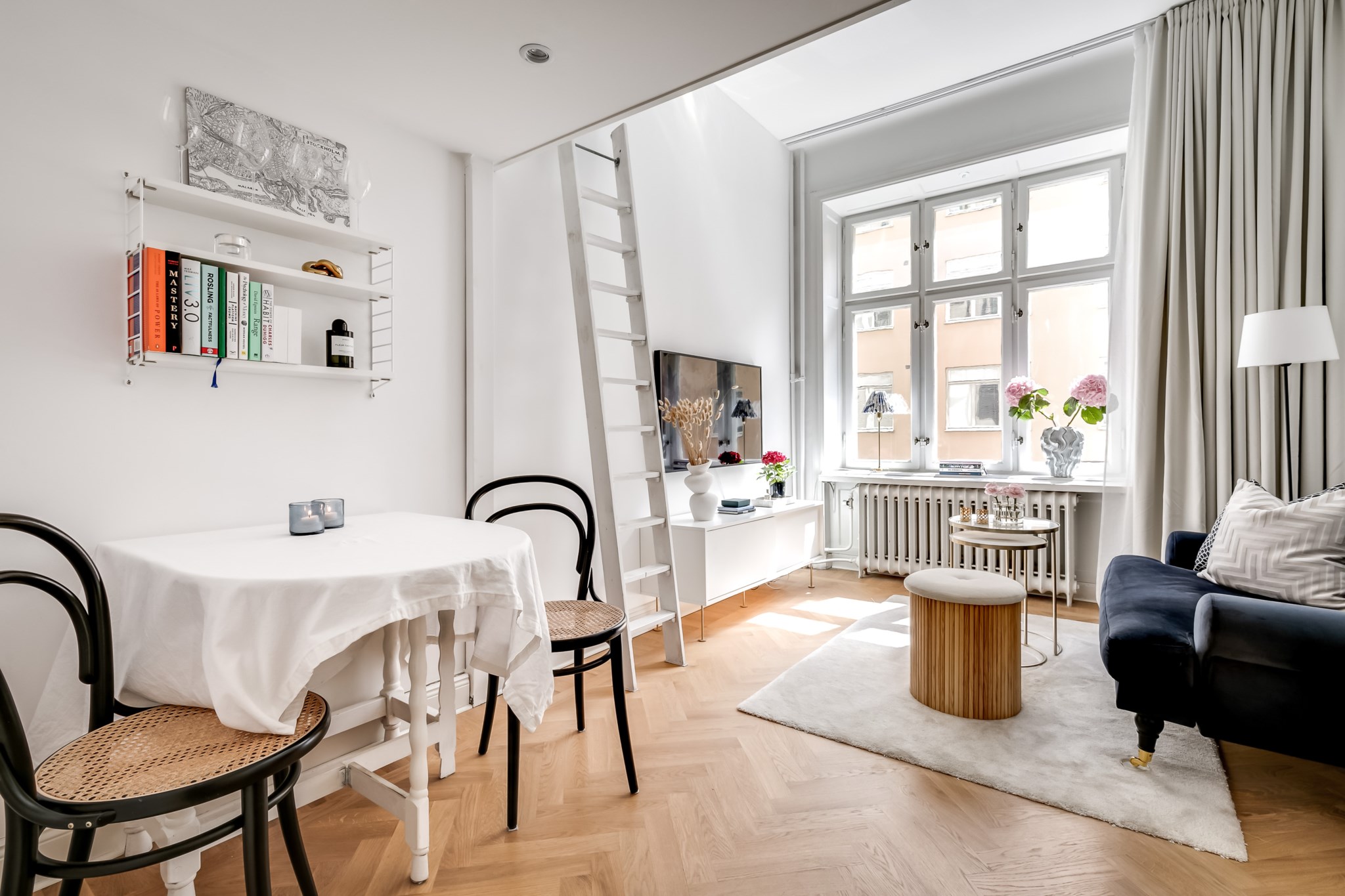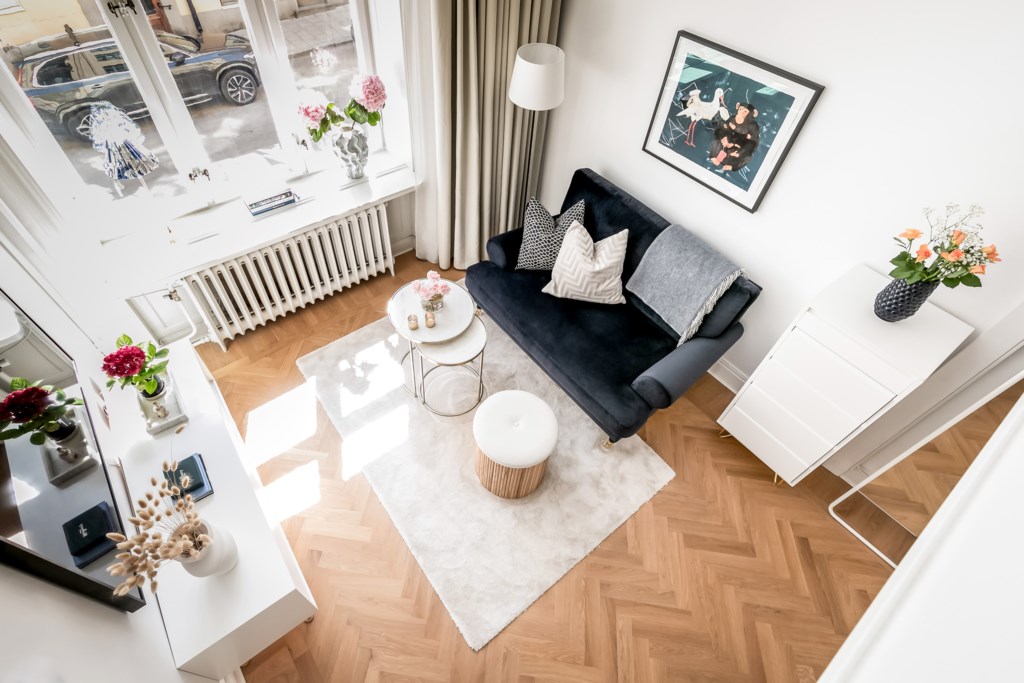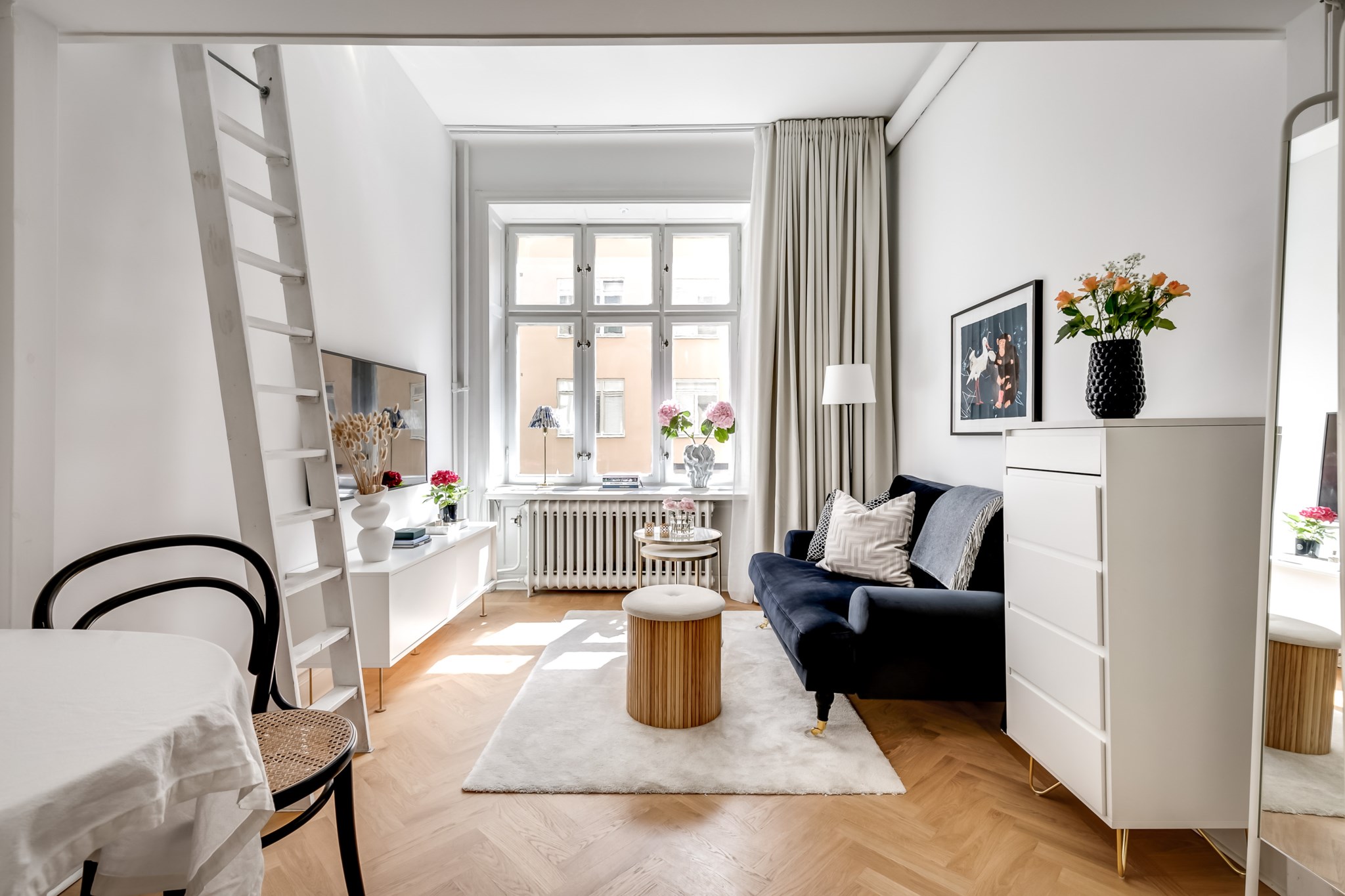 Rymligt vardagsrum med fiskbensparkett och ljusa väggar. Plats för soffmöblemang, soffbord, mediabänk, matbord och uppgång till sovloftet. Ett stort fönster för fantastiskt ljusinsläpp.