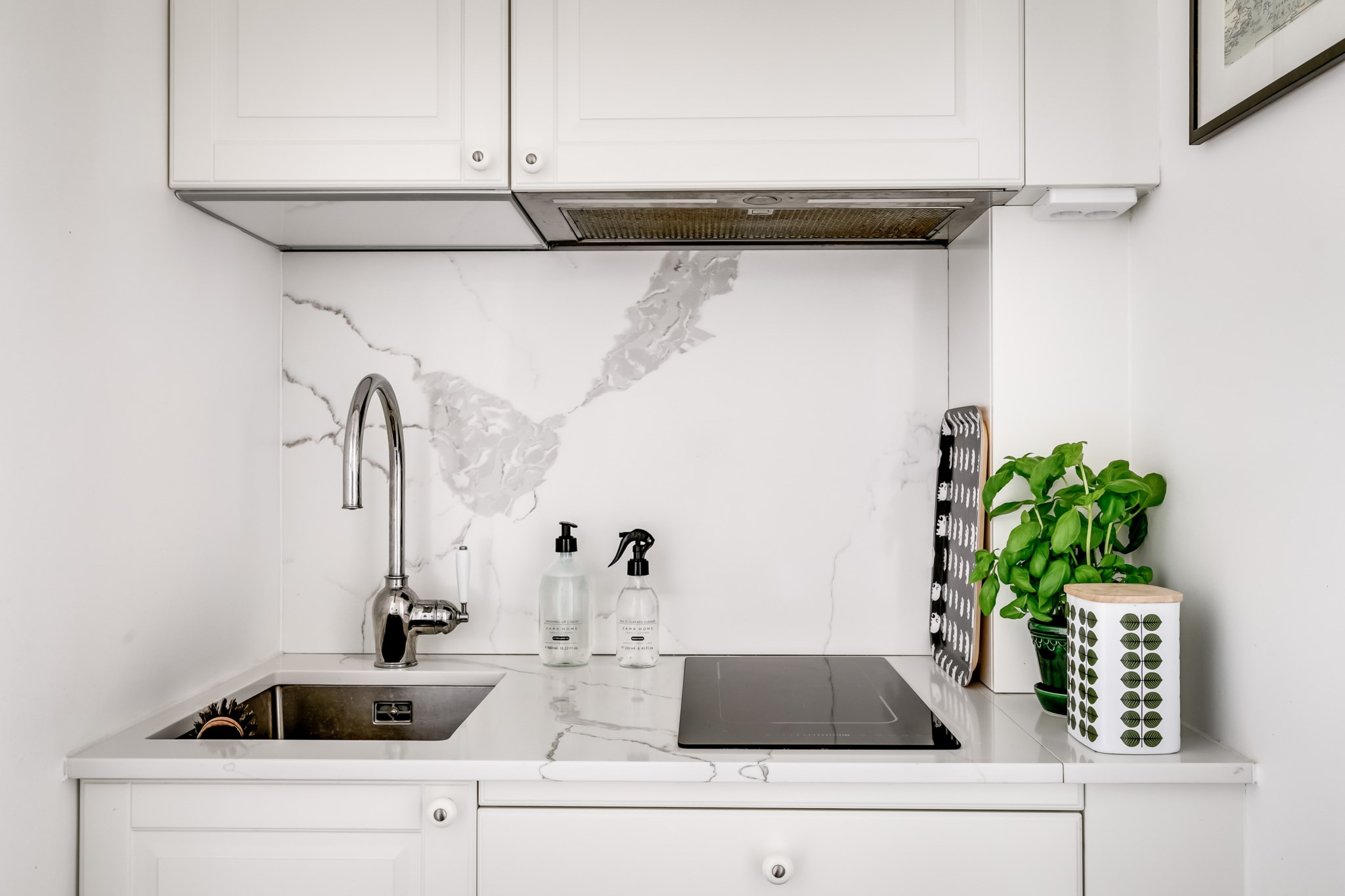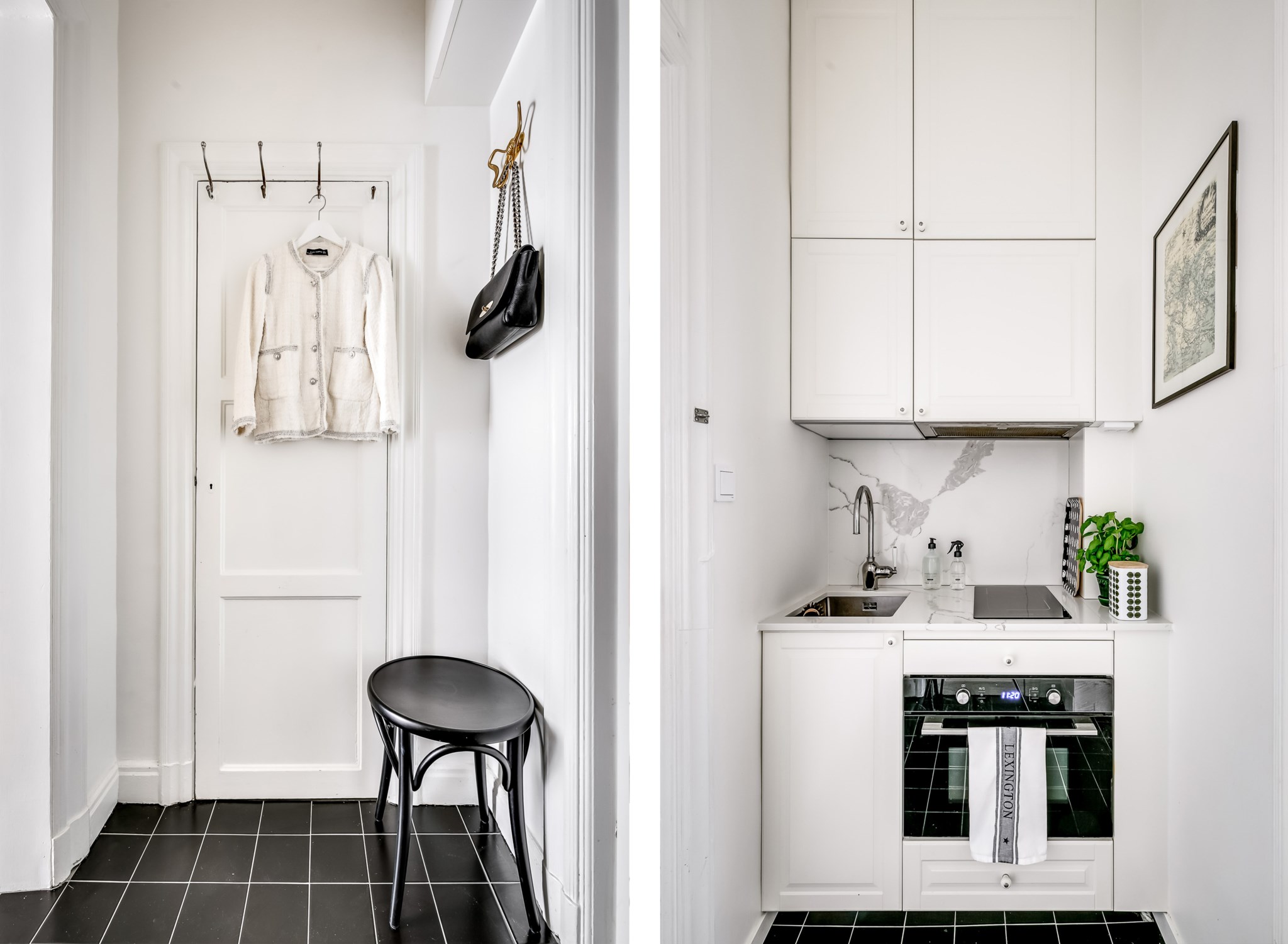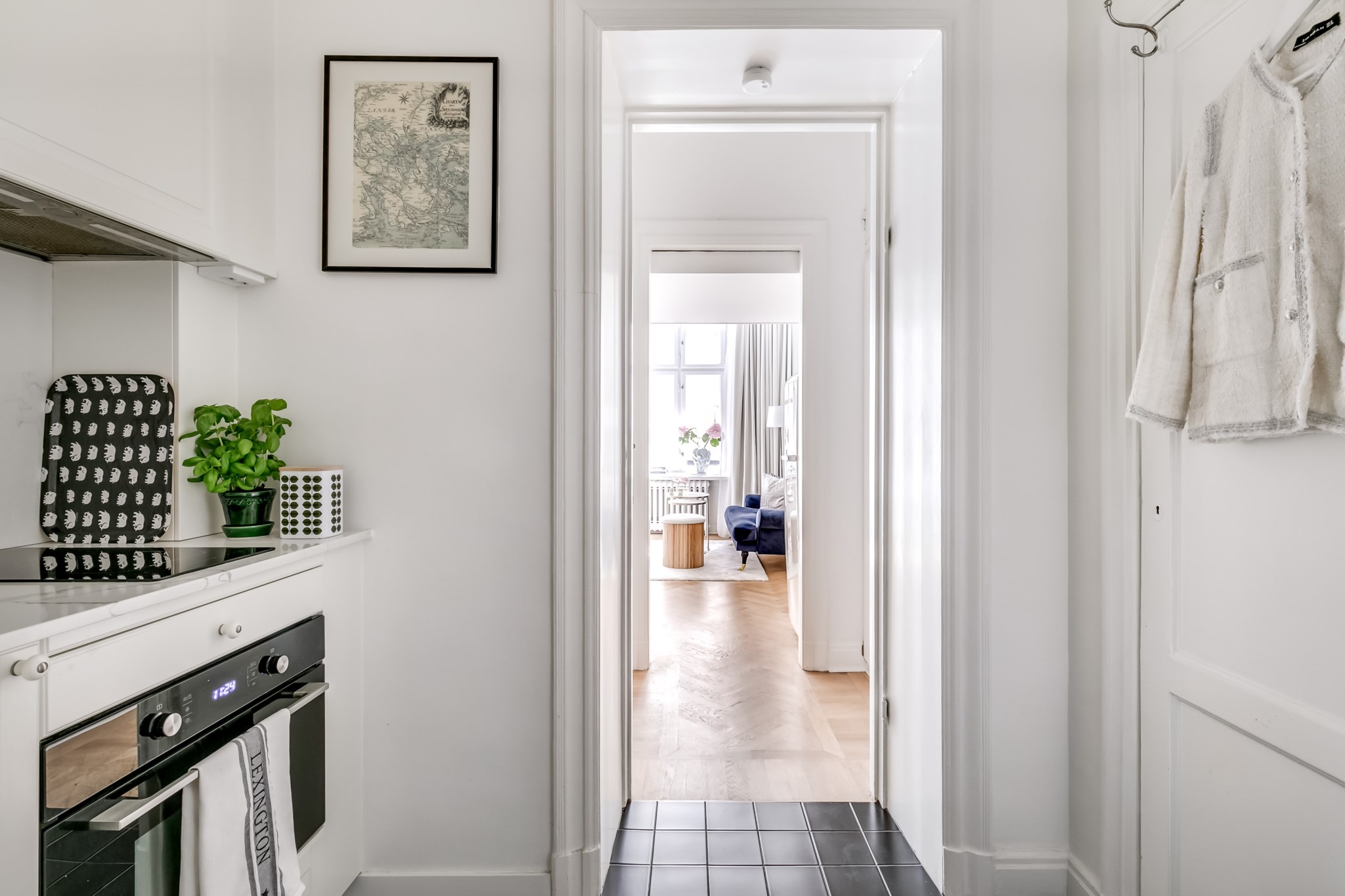 Stilrent kök med mörkt klinkergolv och vita väggar. Utrustat med häll, kombiugn och fläkt. Påkostat med bänkskiva i sten.