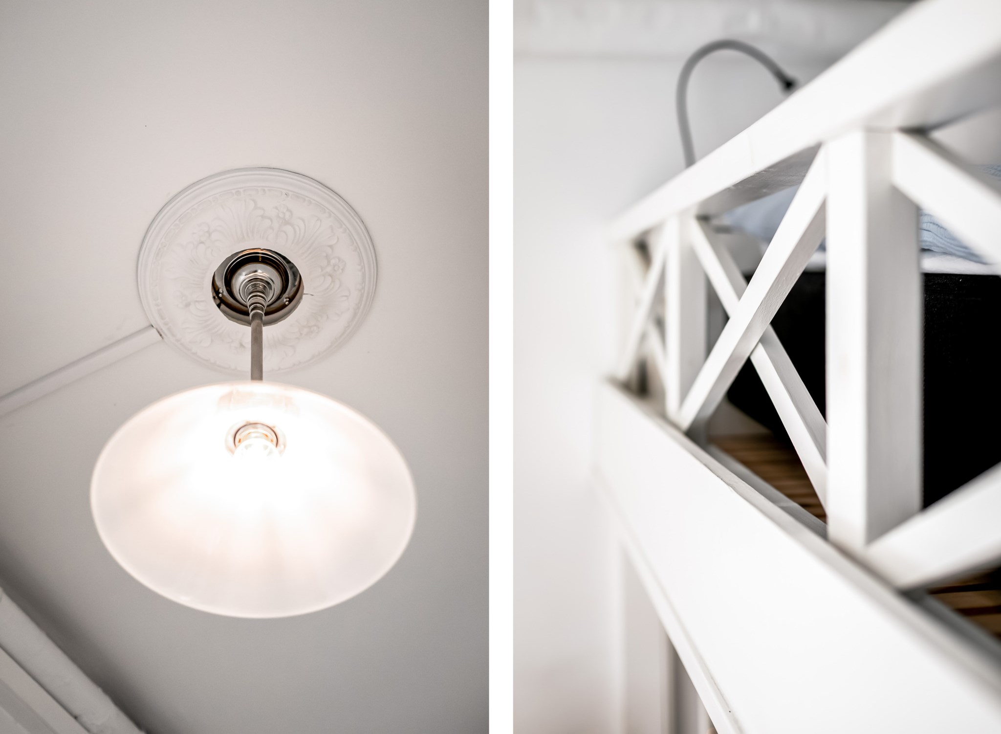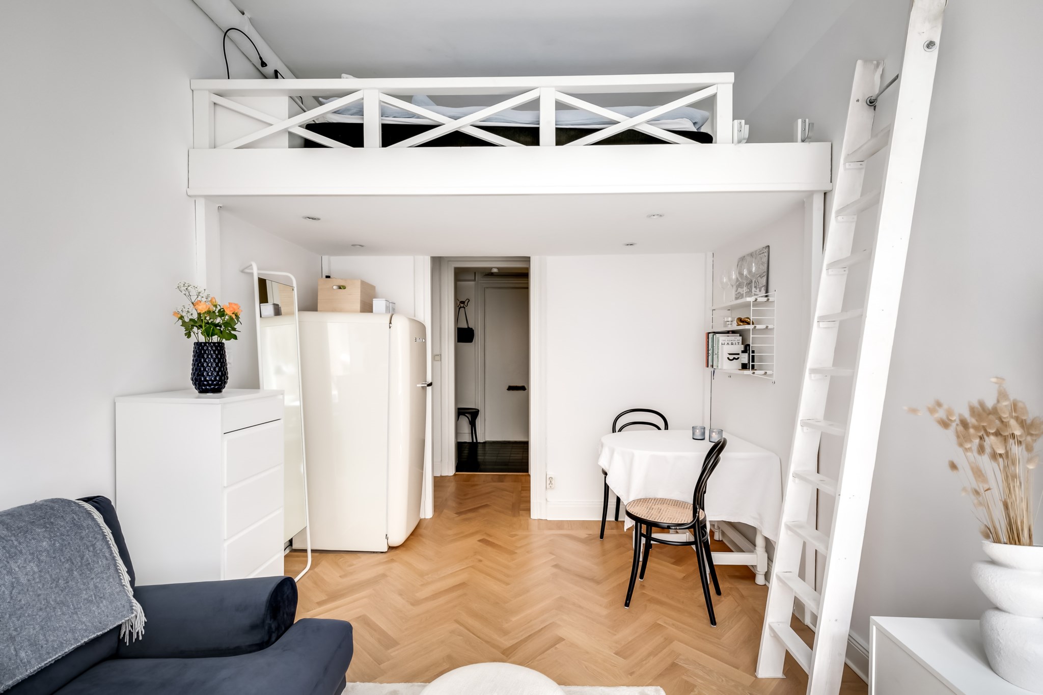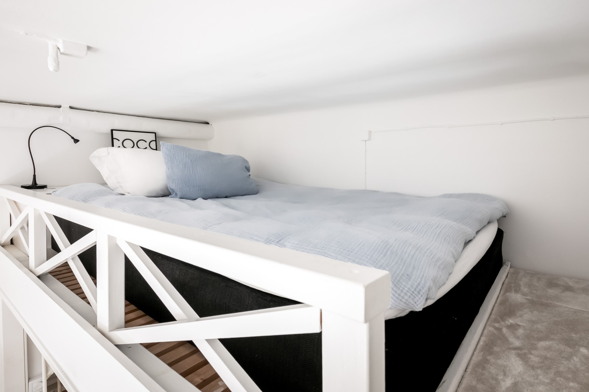 Mysigt sovloft med vita väggar och plats för både säng och förvaring.