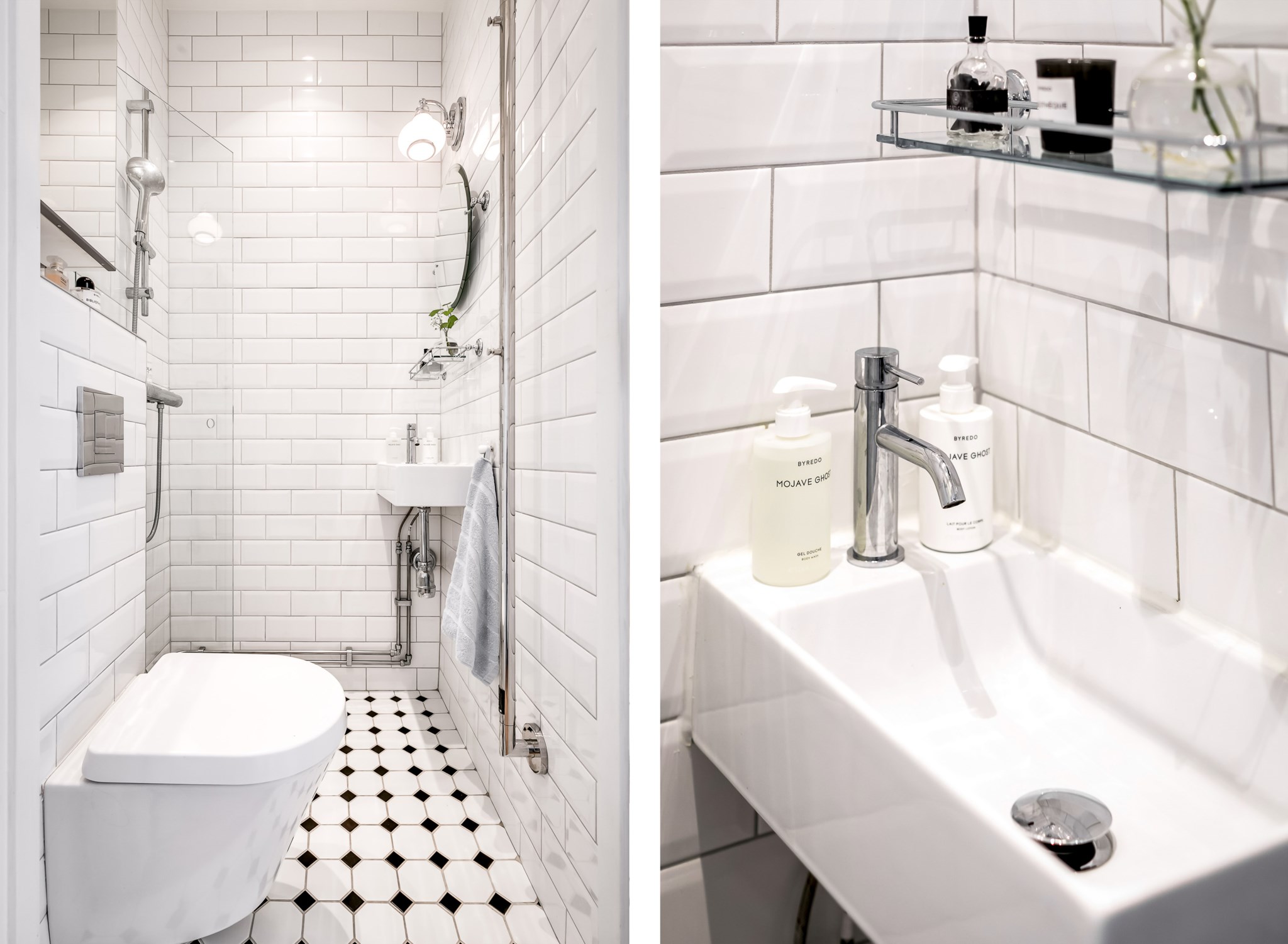 Fräscht badrum med klinkergolv och helkaklade väggar. Vägghängd WC, handfat, handdukstork, spegel och dusch med vikbar glasvägg. Påkostat med golvvärme.