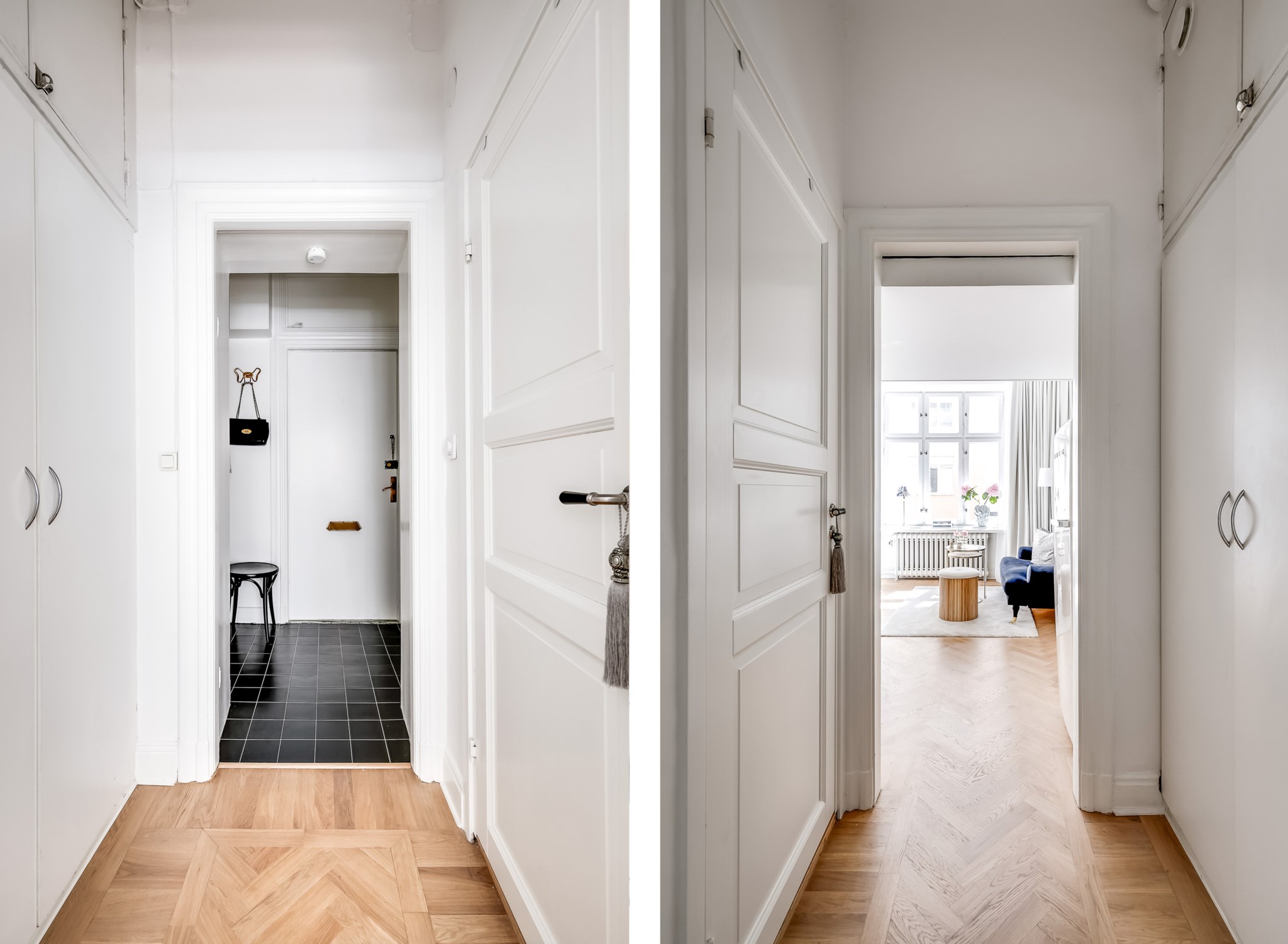 Välkomnande hall med mörkt klinkergolv och vita väggar. Plats för avhängning och skoställ samt förvaring i garderob.