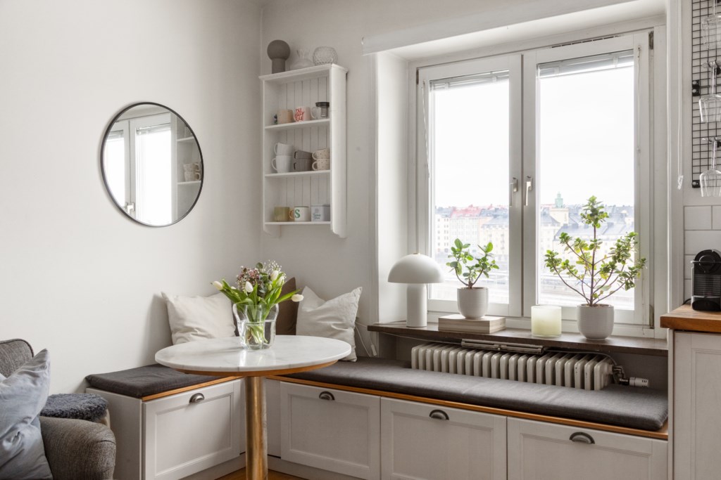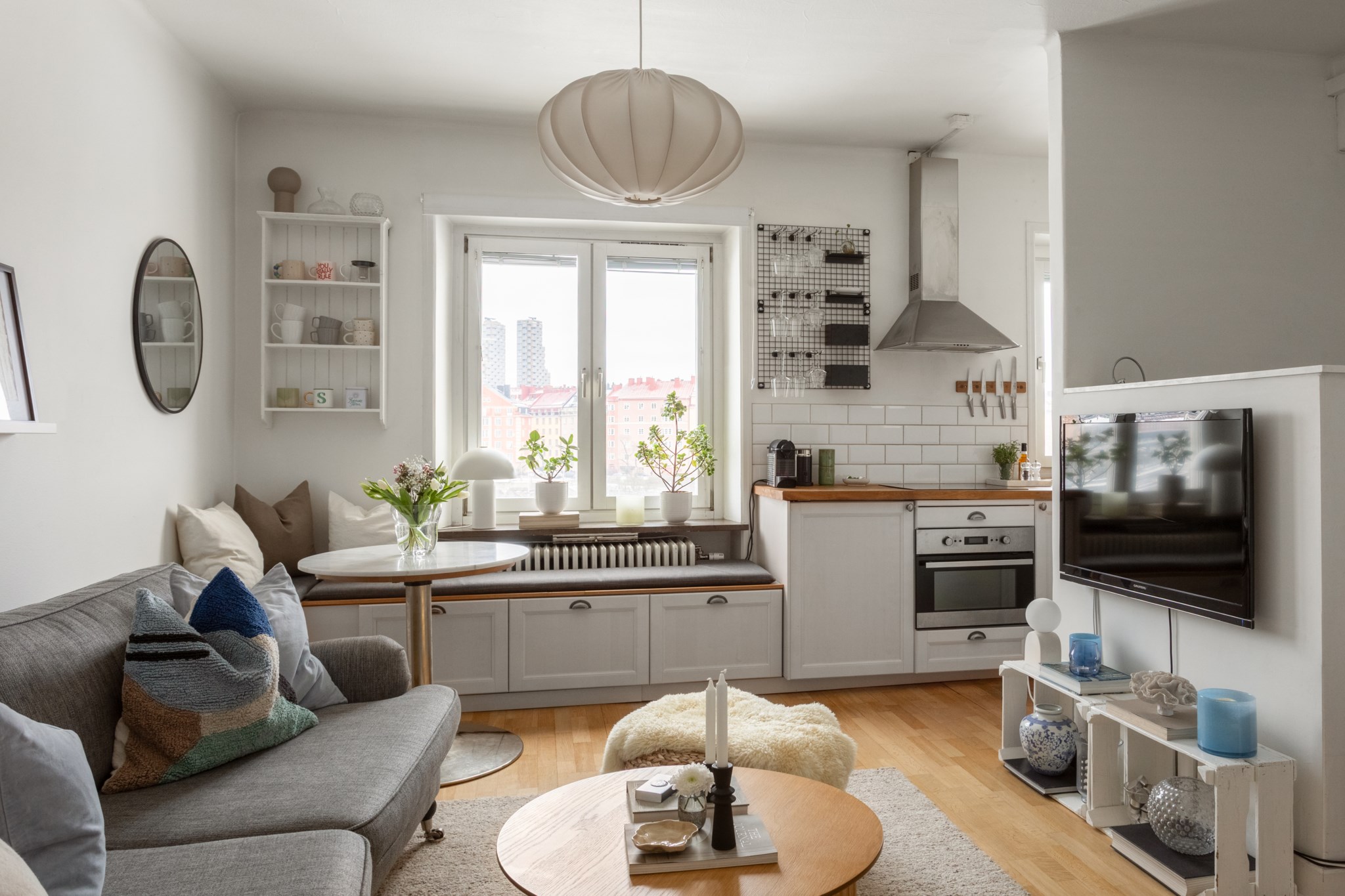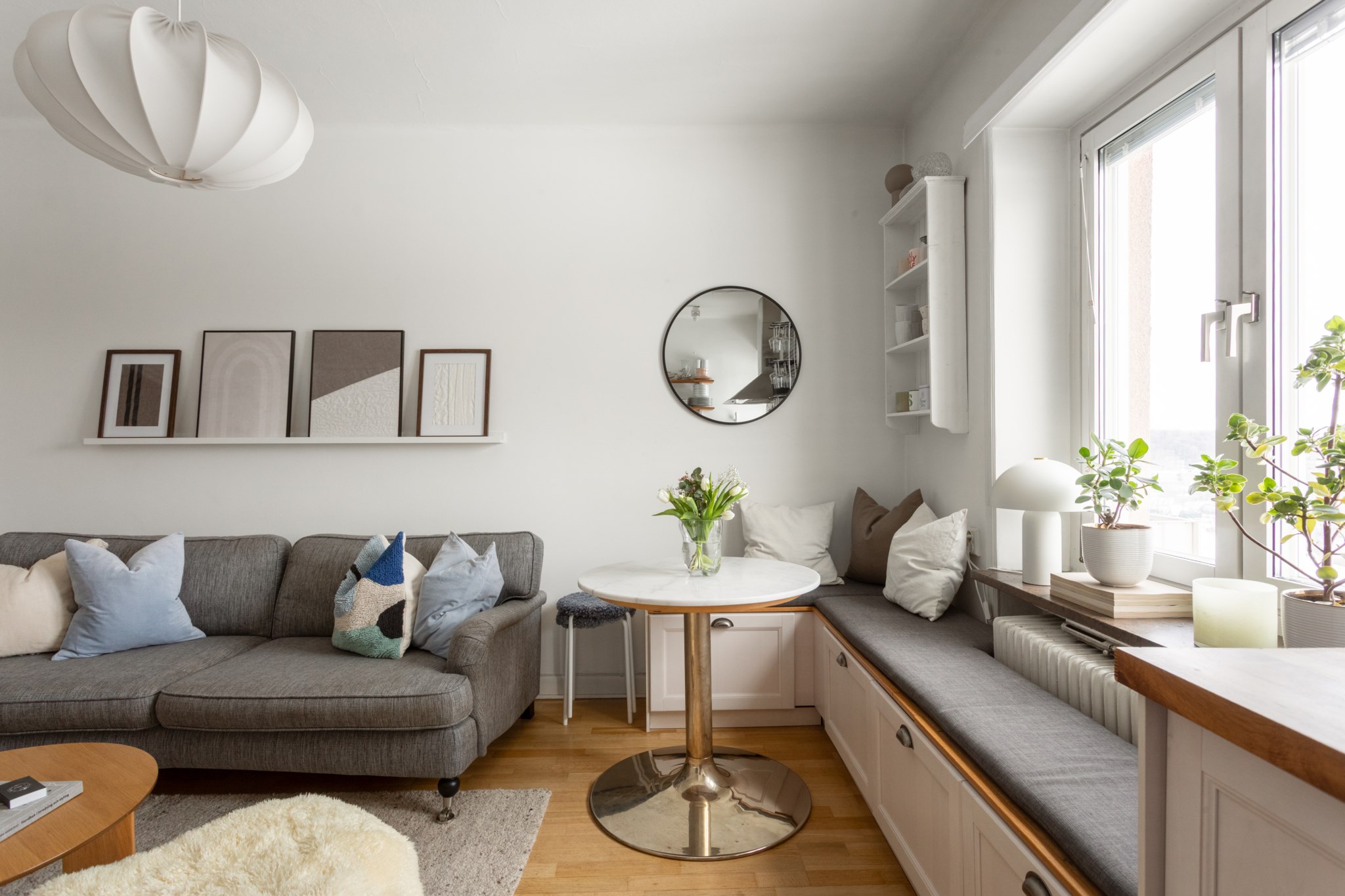 Ljust och trevligt allrum med parkettgolv som ger en hemtrevlig känsla. Fönsterpartiet släpper in rikligt med dagsljus och den inbyggda kökssoffan med förvaring bidrar till både funktion och trivsel. Rummet erbjuder plats för önskat möblemang och bjuder på fin utsikt.