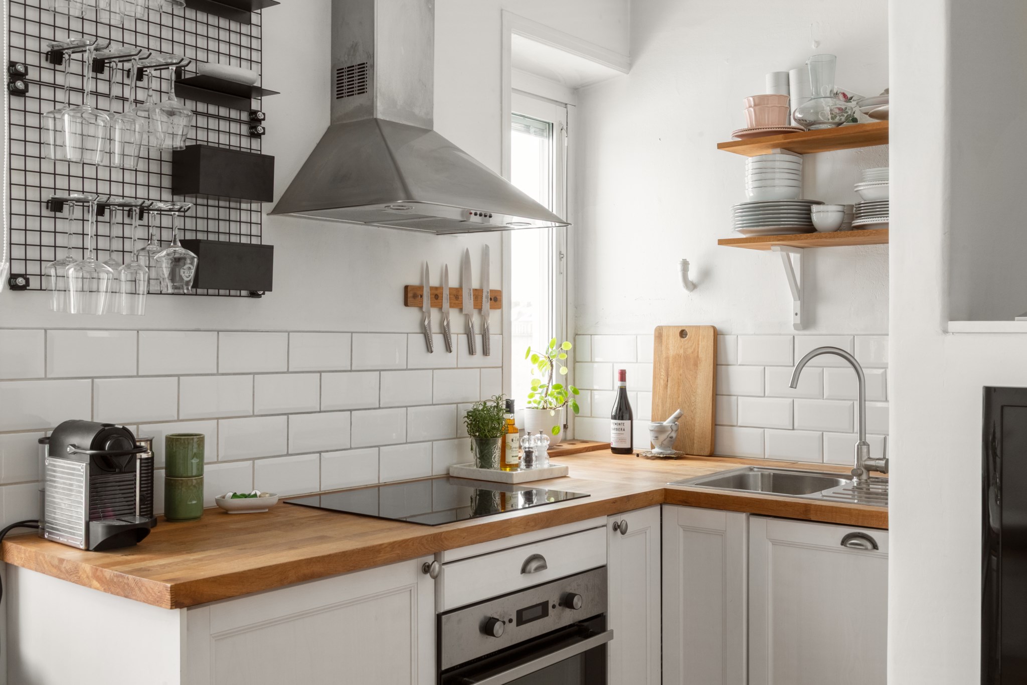 Fint och ljusmålat kök med ljus parkett och kaklat stänkskydd ovan arbetsytorna. Generöst ljusinsläpp från fönster. Köket är utrustat med spis, vägghängd fläkt, kombinationsugn, kyl med frysfack och diskmaskin.