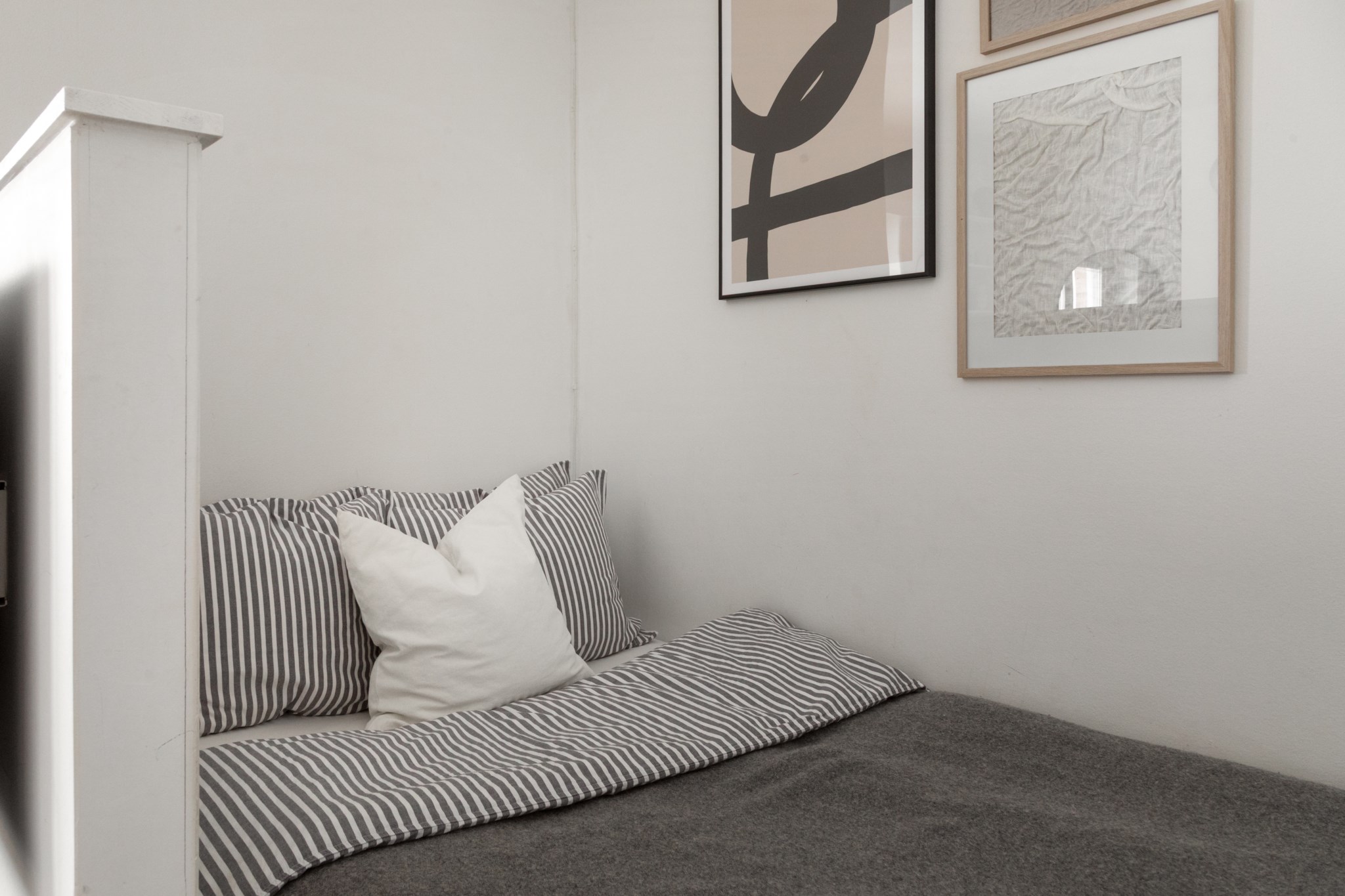 Mysig sovalkov med delvis avskild vägg som skapar en ombonad och lugn sovhörna.
