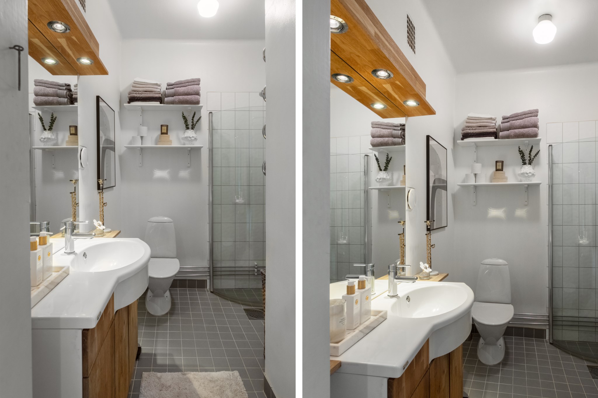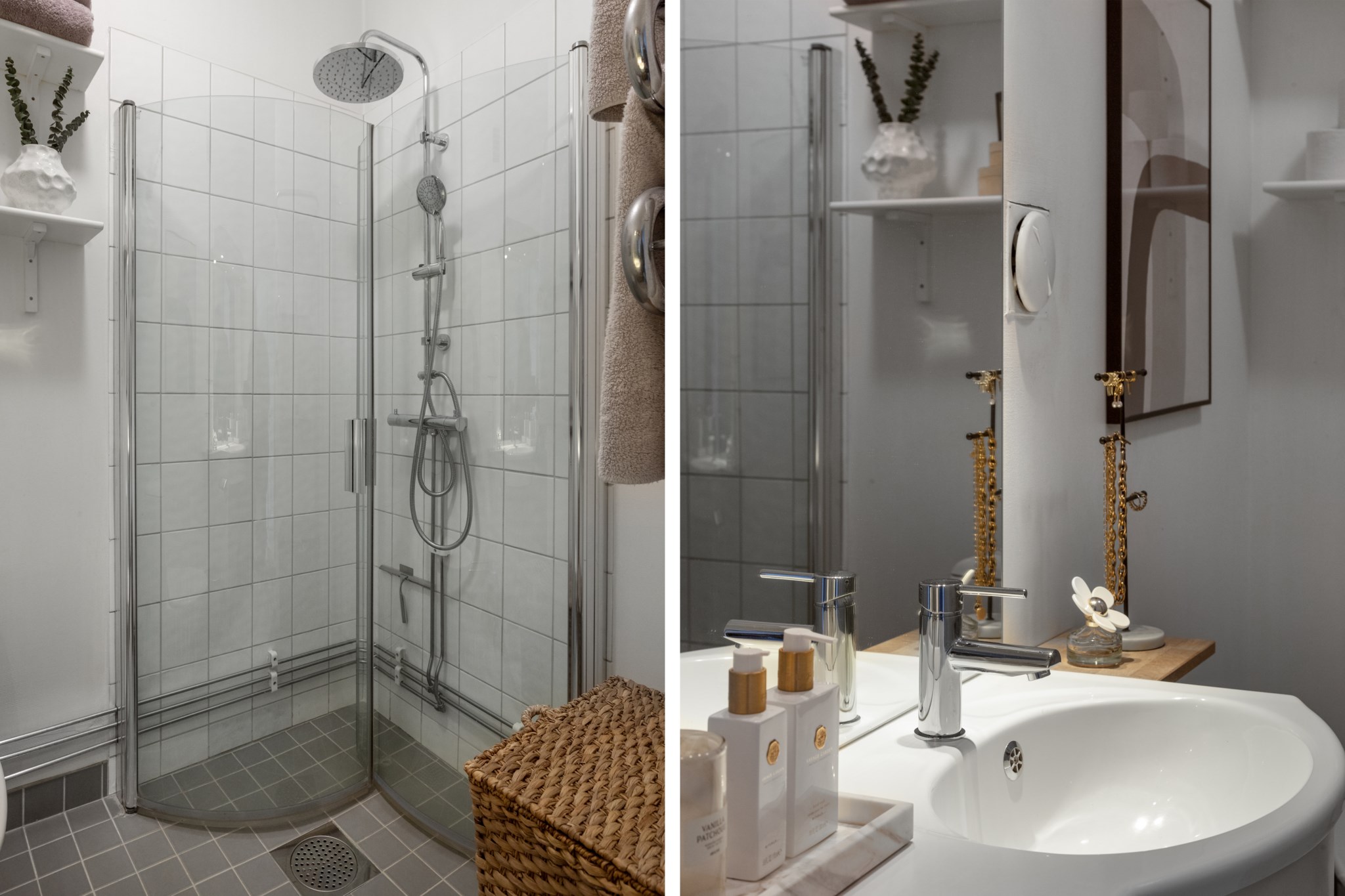 Köket är smakfullt och funktionellt med goda arbetsytor, bra förvaring samt utrustat med diskmaskin för extra bekvämlighet. Stort och lyxigt badrum med klinker, utrustat med dusch med glasdörrar, stor spegel samt goda förvaringsmöjligheter.
