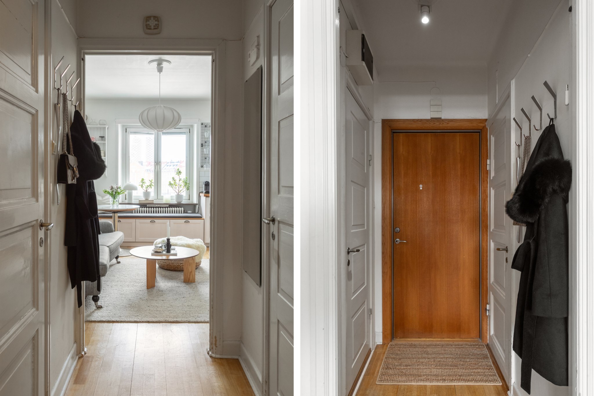 Välkomnande och ljus hall med ljust parkettgolv. Hallen gränsar till en garderob som ger goda möjligheter till extra förvaring och får ett fint ljusinsläpp från kökets fönsterparti.
