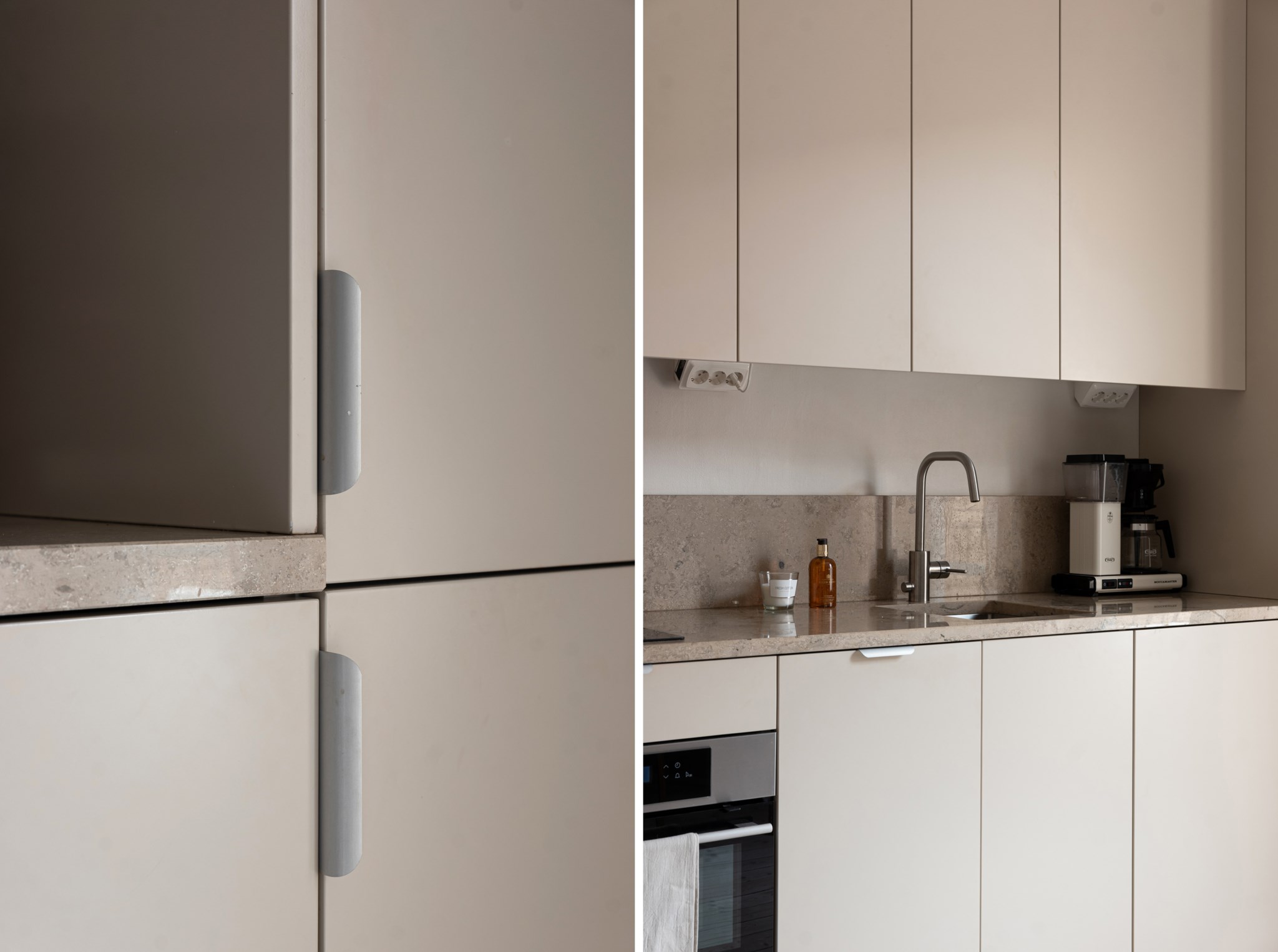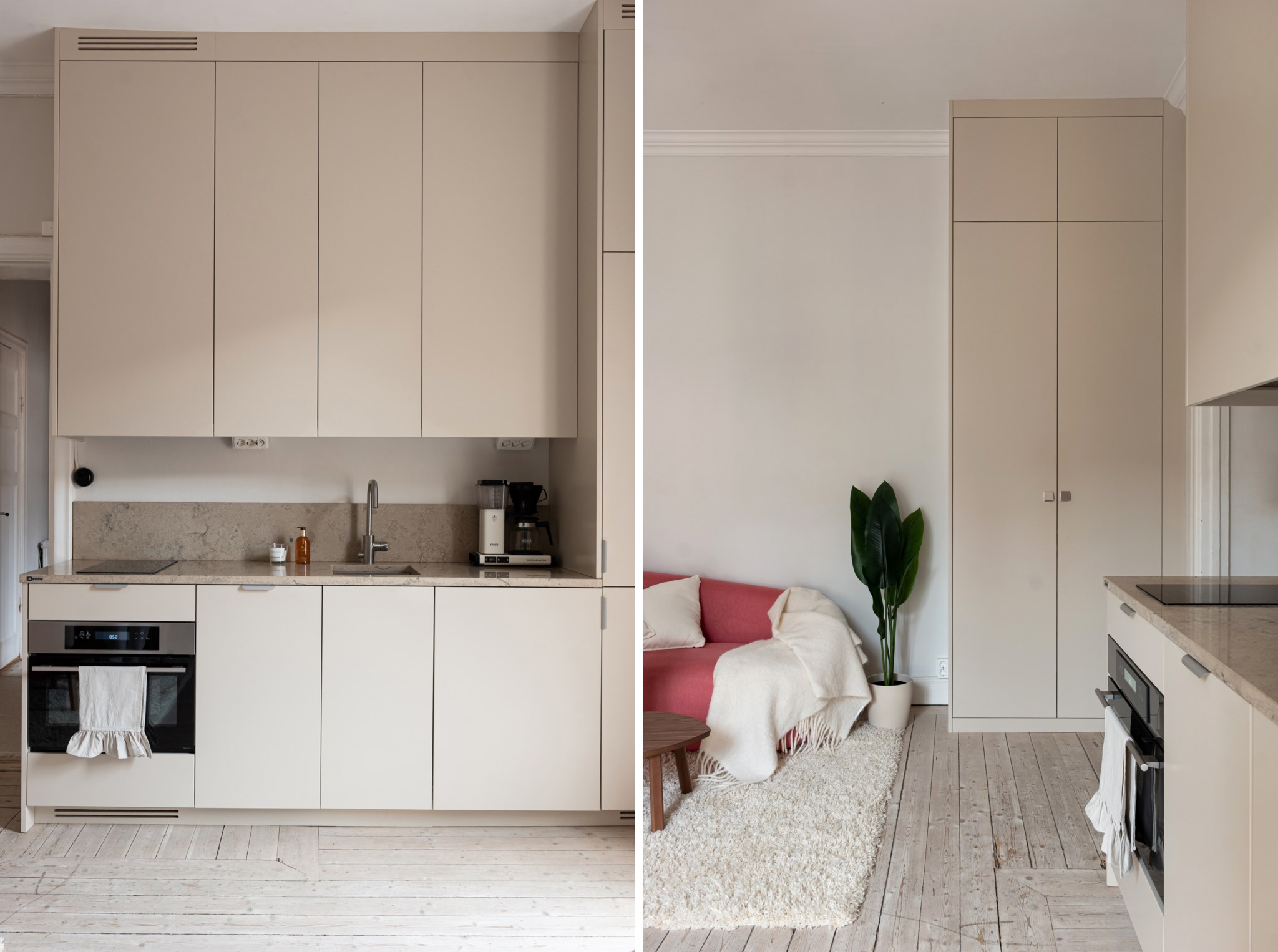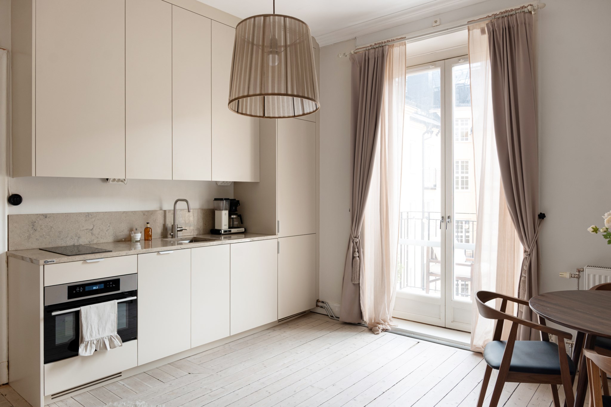 Kök i öppen planlösning med allrummet. Smakfulla och moderna materialval bestående av specialdesignade köksluckor i beige nyans och bänkskiva i kalksten. Köket är utrustat med diskho, spishäll, köksfläkt, kombinerad ugn/mikro, diskmaskin, integrerad kyl och frys samt tvättmaskin.