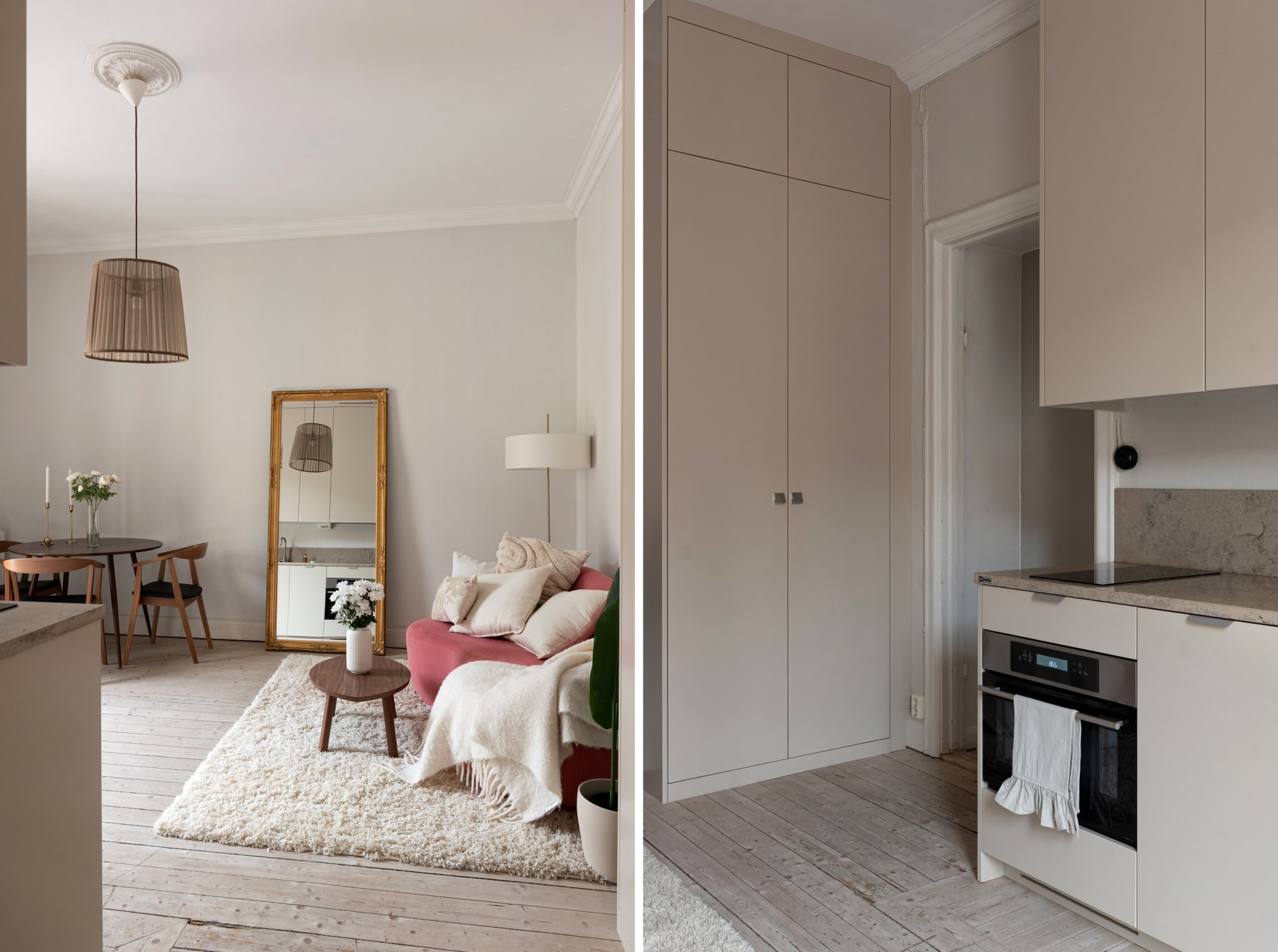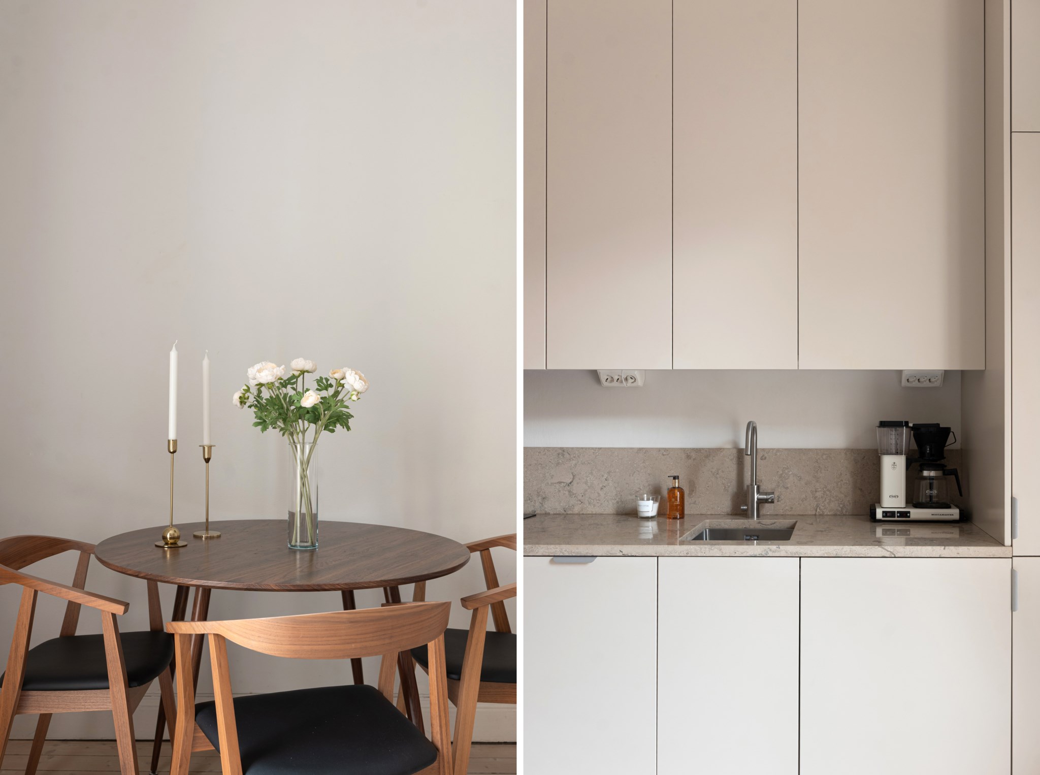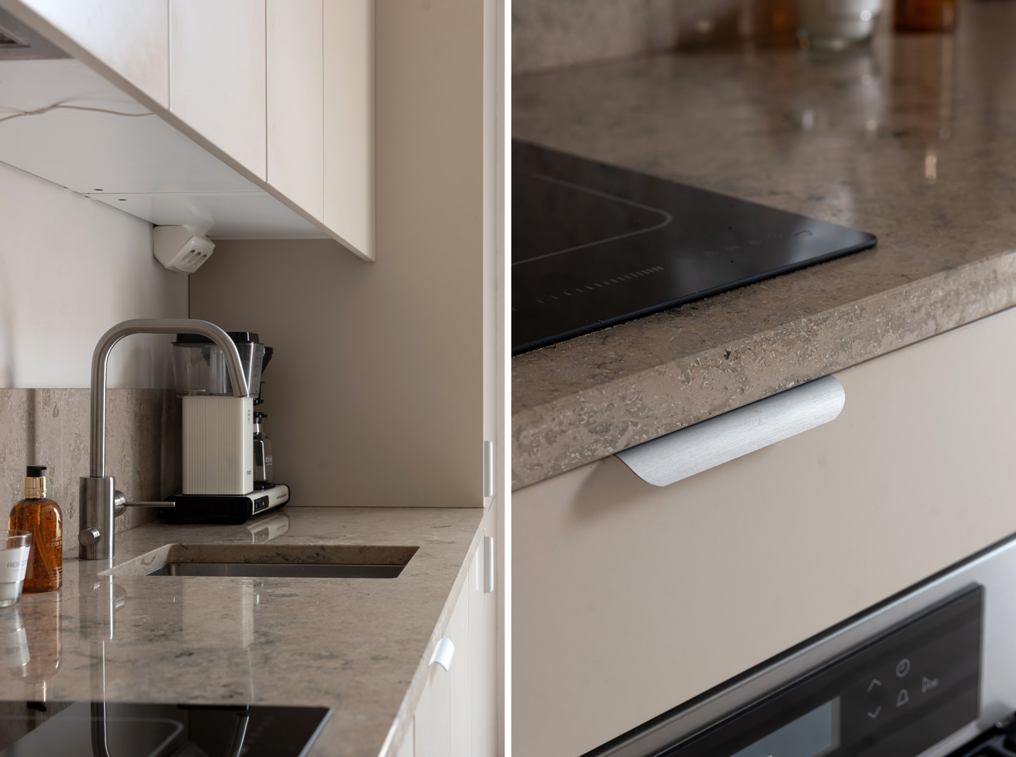 Kök i öppen planlösning med allrummet. Smakfulla och moderna materialval bestående av specialdesignade köksluckor i beige nyans och bänkskiva i kalksten. Köket är utrustat med diskho, spishäll, köksfläkt, kombinerad ugn/mikro, diskmaskin, integrerad kyl och frys samt tvättmaskin.