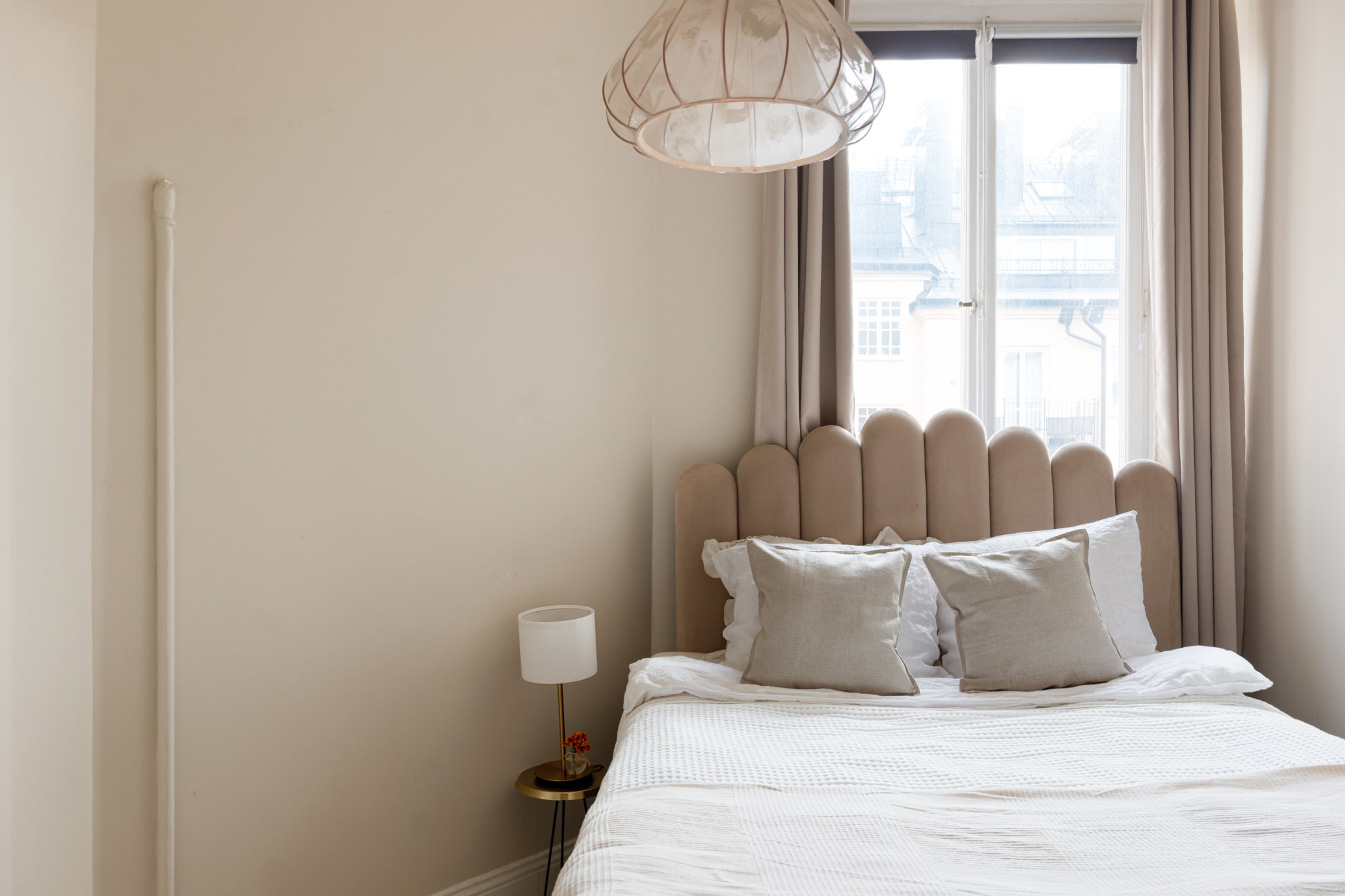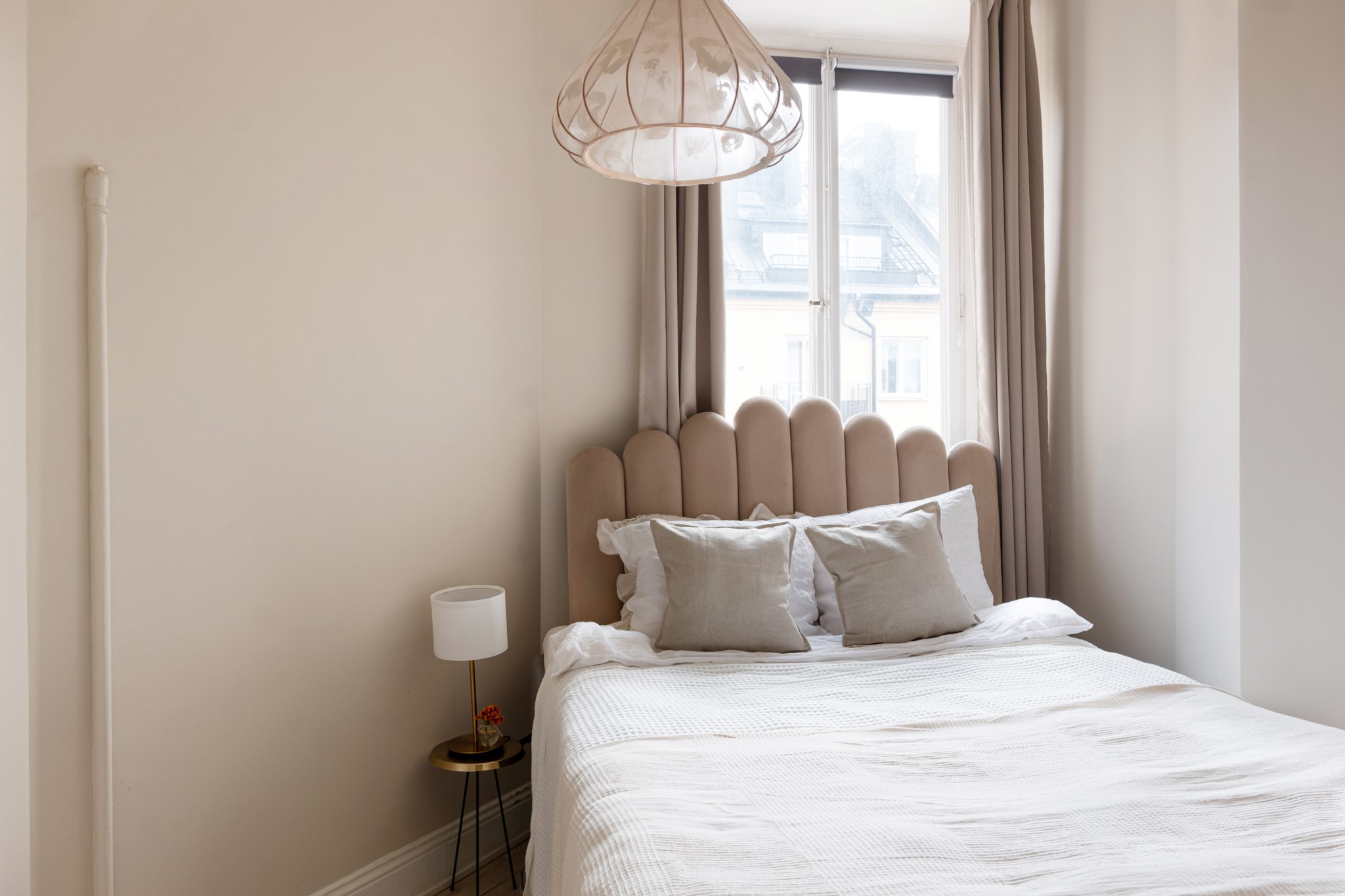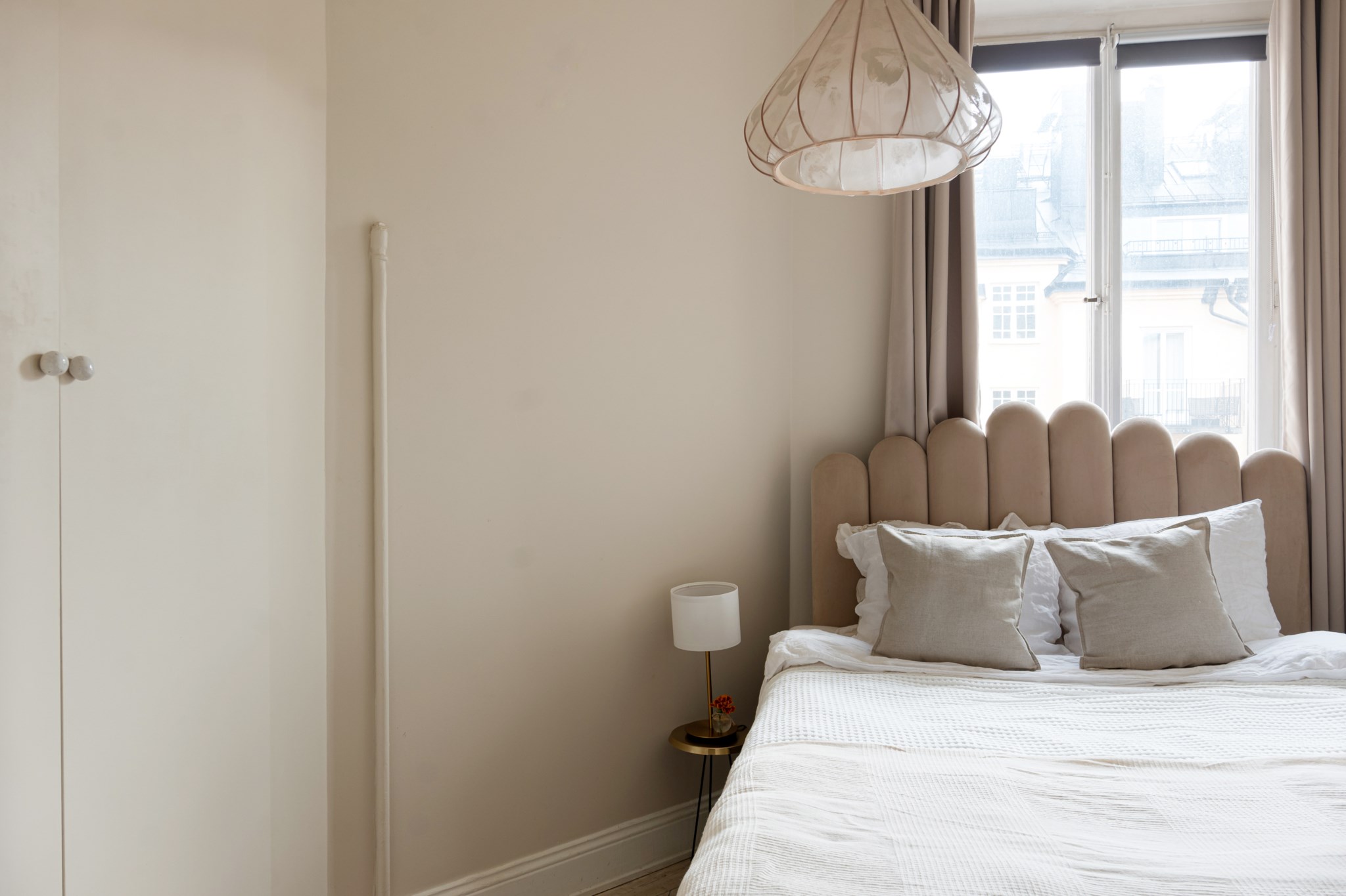 Trivsamt sovrum med smakfulla ytskikt bestående av beige nyans väggar och ljust golv. Här inryms säng och sängbord. Generöst med förvaringsmöjligheter via garderob. Ett härligt ljusinsläpp tar sig in via stort fönster.