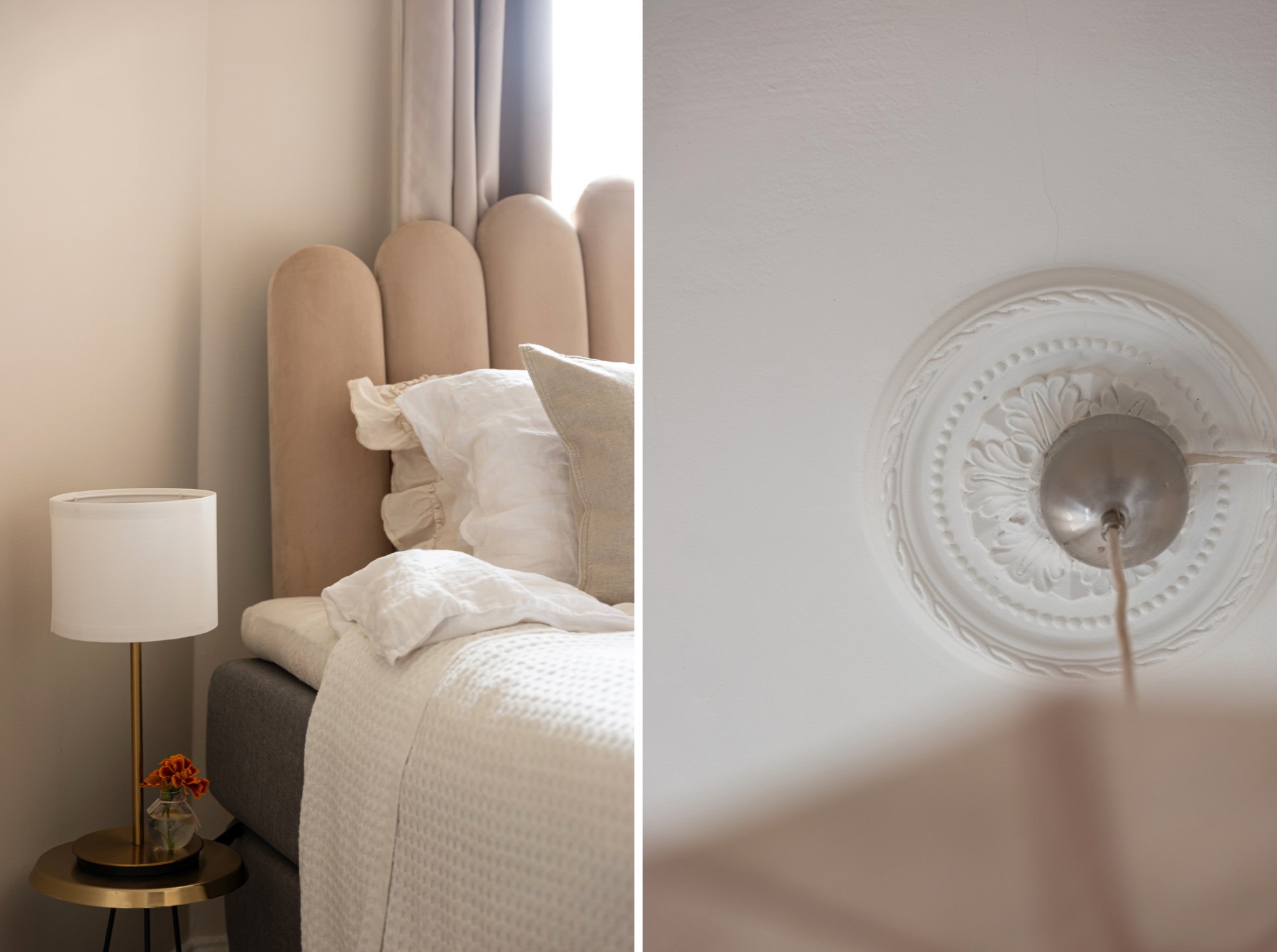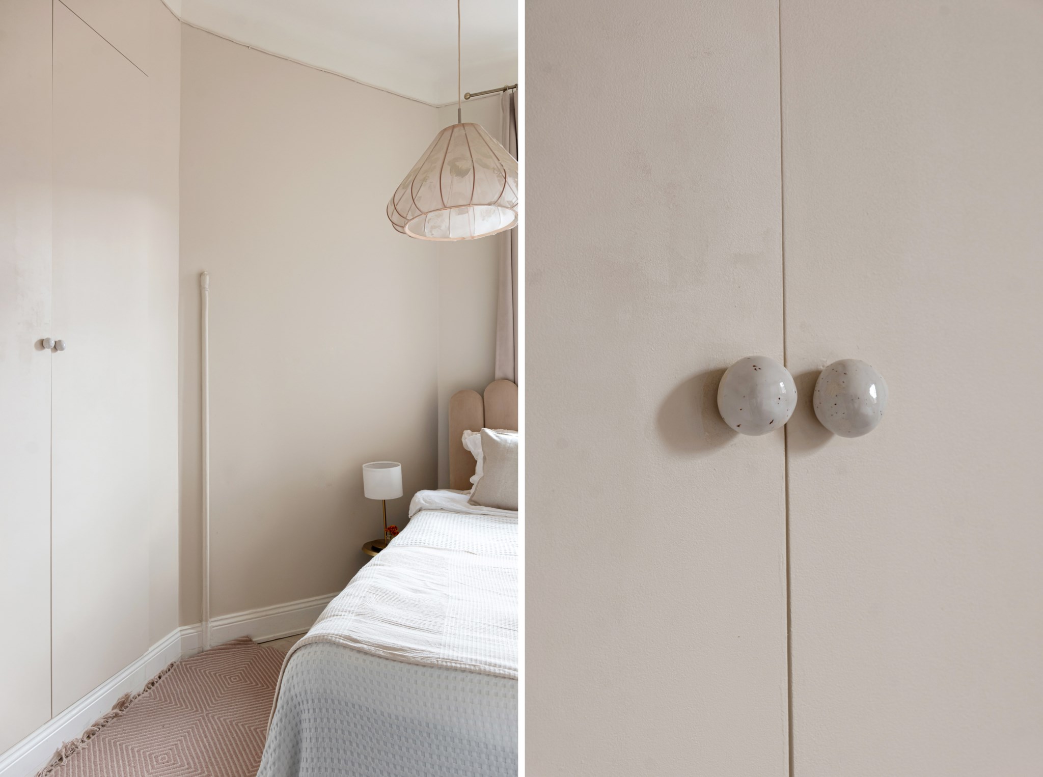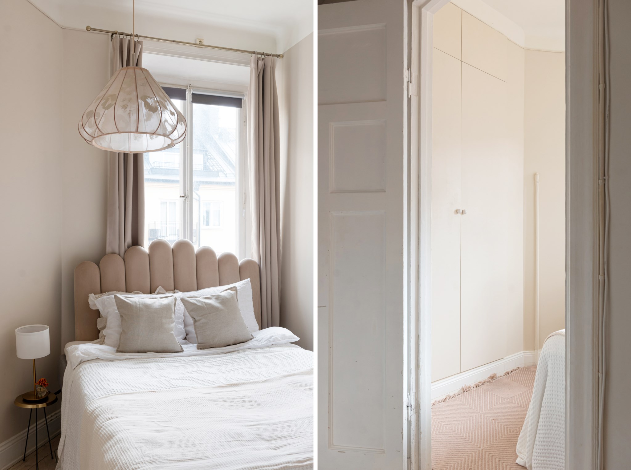 Trivsamt sovrum med smakfulla ytskikt bestående av beige nyans väggar och ljust golv. Här inryms säng och sängbord. Generöst med förvaringsmöjligheter via garderob. Ett härligt ljusinsläpp tar sig in via stort fönster.