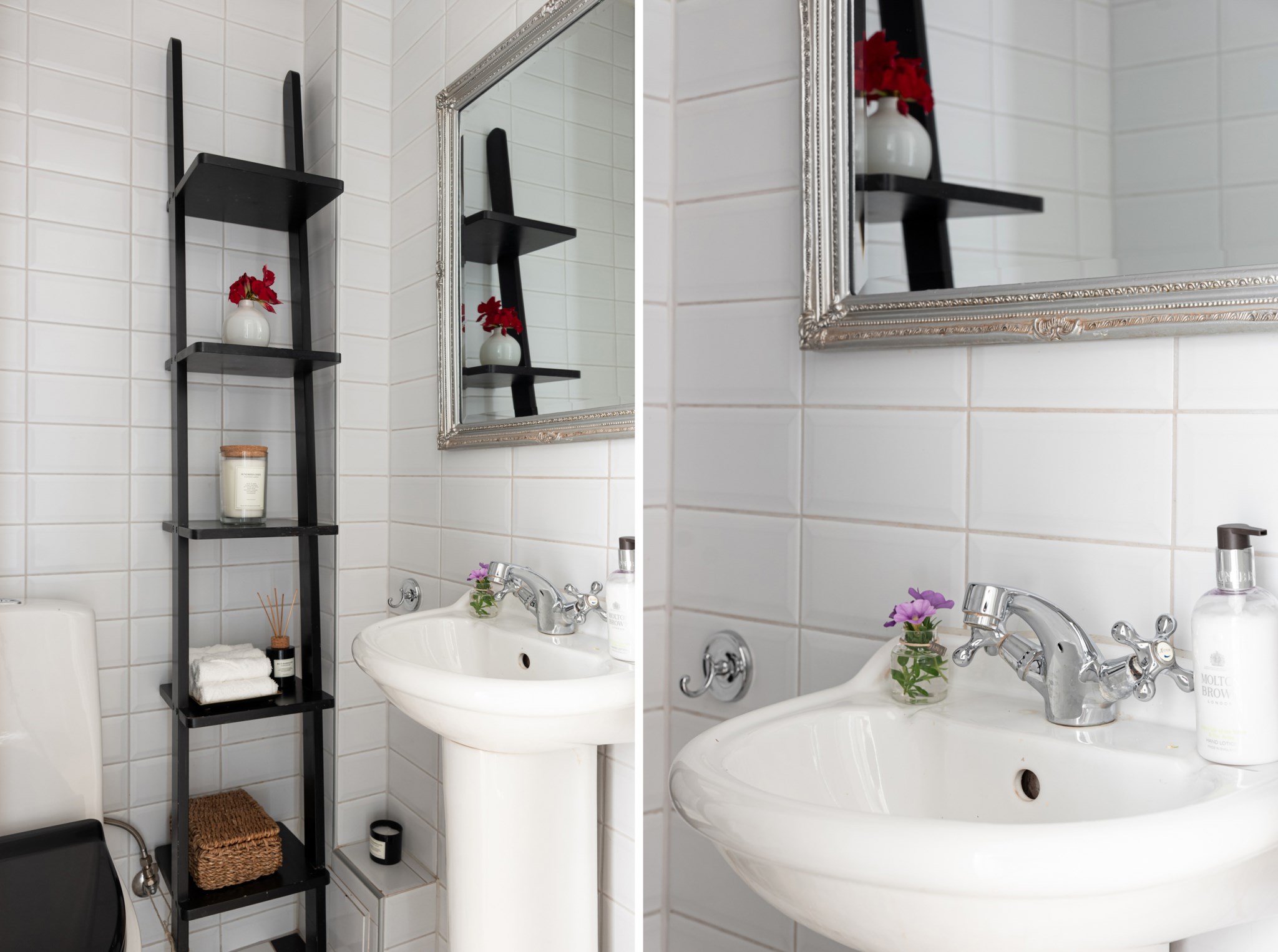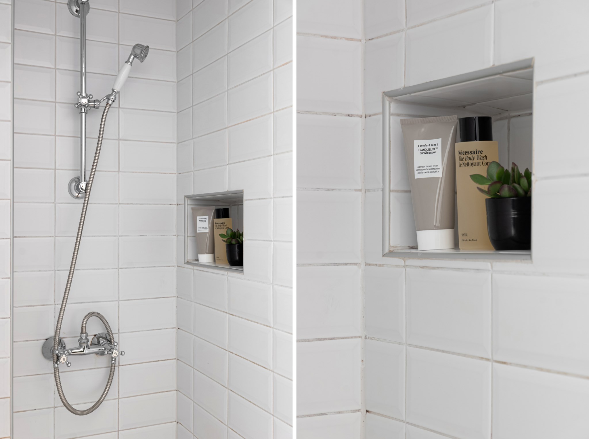 Separat WC och duschrum med matchande ytskikt bestående av ljust kakel och schackrutigt klinker. Duschrummet är rymligt med inbyggt hyllplan. WC med handfat och plats för förvaringsmöjligheter.