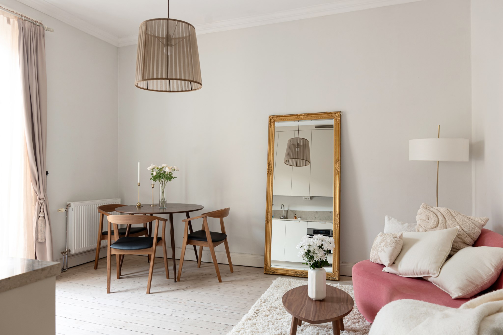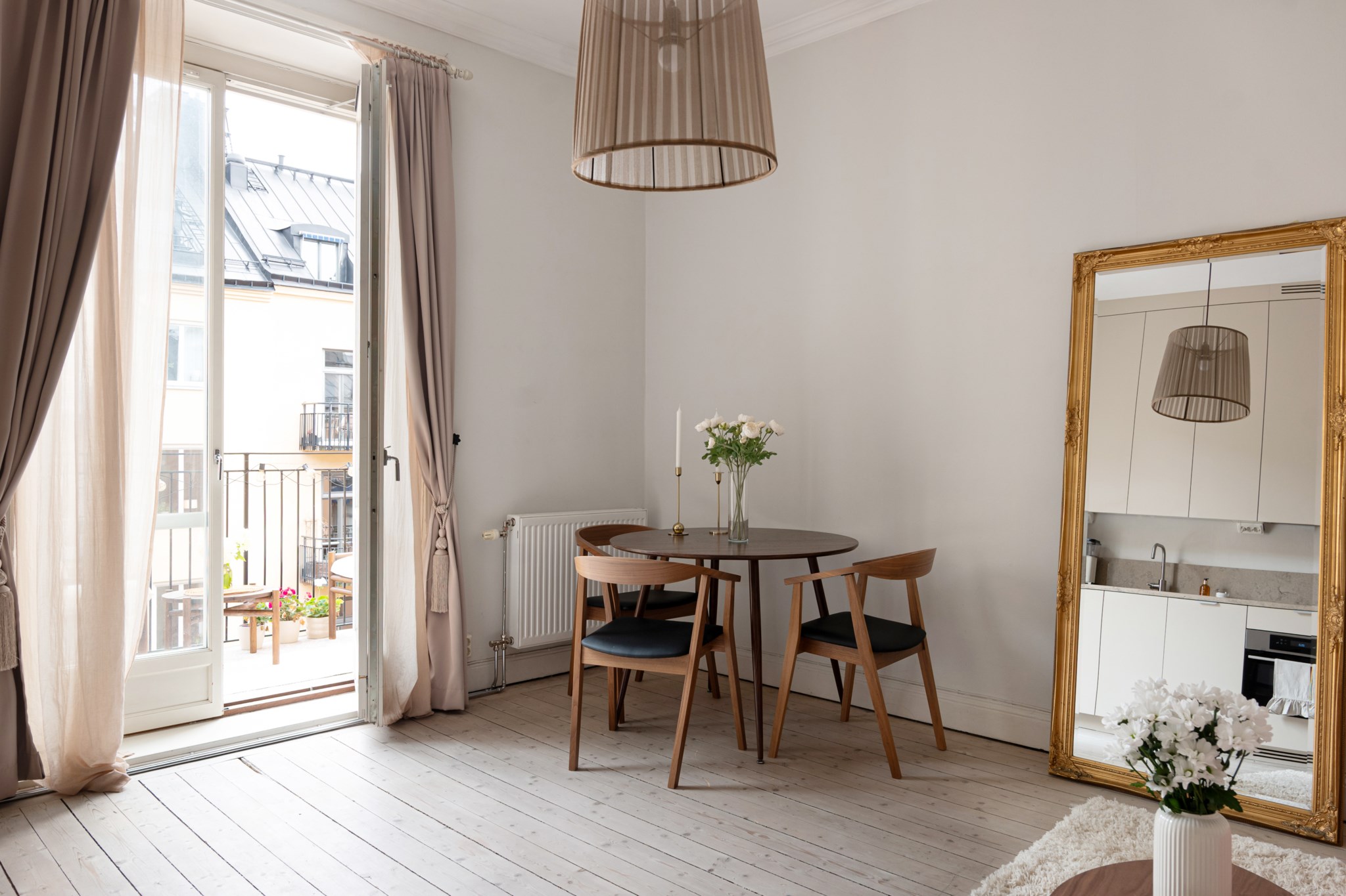 Luftigt allrum i öppen och social planlösning med kök. Ytskikten består av ljusa väggar och ljust trägolv. Här inryms soffa, soffbord, matgrupp och annat möblemang efter smak och behov. Härifrån nås den mysiga balkongen via dubbeldörrar vilket bidrar till ett härligt ljusinsläpp.