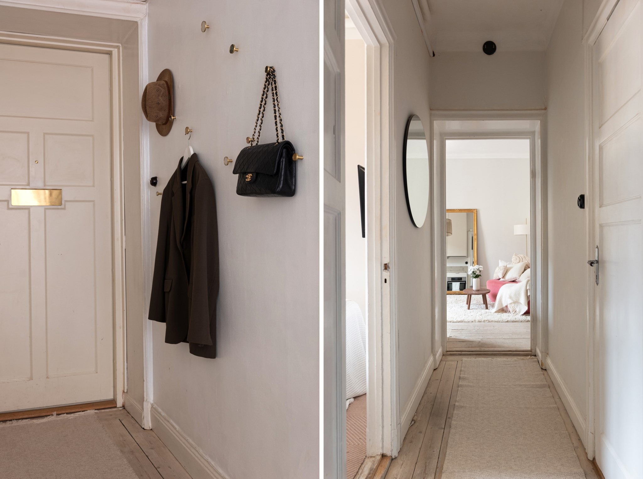 Välkomnande hall med plats för avhängning och mindre avlastningsmöblemang efter önskemål. Ytskikten består av ljusa väggar och ljust trägolv.