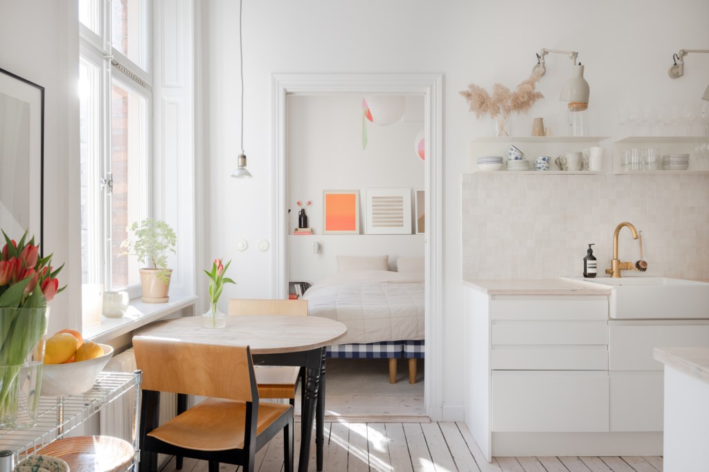 Tidlöst kök med härligt ljusinsläpp från stort fönster. Plats för matgrupp om mindre möblemang efter önskemål. Här finns förvaring bakom vita köksluckor och arbetsyta ovan ljus bänkskiva. Köket är utrustat med diskho, spishäll, fläkt, ugn, diskmaskin samt kyl och frys. Köket är perfekt placerat mellan vardagsrum och sovrum vilket skapar ett fantastiskt ljusflöde.