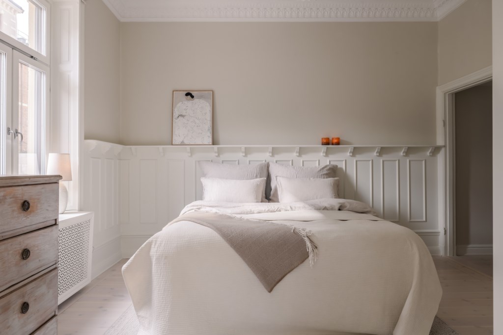 Generöst sovrum med noggrant utvalda detaljer. Sovrummet pryds av väggar i en ljus kulör, höga golvsocklar, stuckaturer målade i samma ljusa kulör som taket samt ljust trägolv. Vackert ljusinsläpp och inbyggt elementskydd. Plats för stor säng med tillhörande sängbord samt annat möblemang efter önskemål. Generöst med förvaring via platsbyggd garderob.