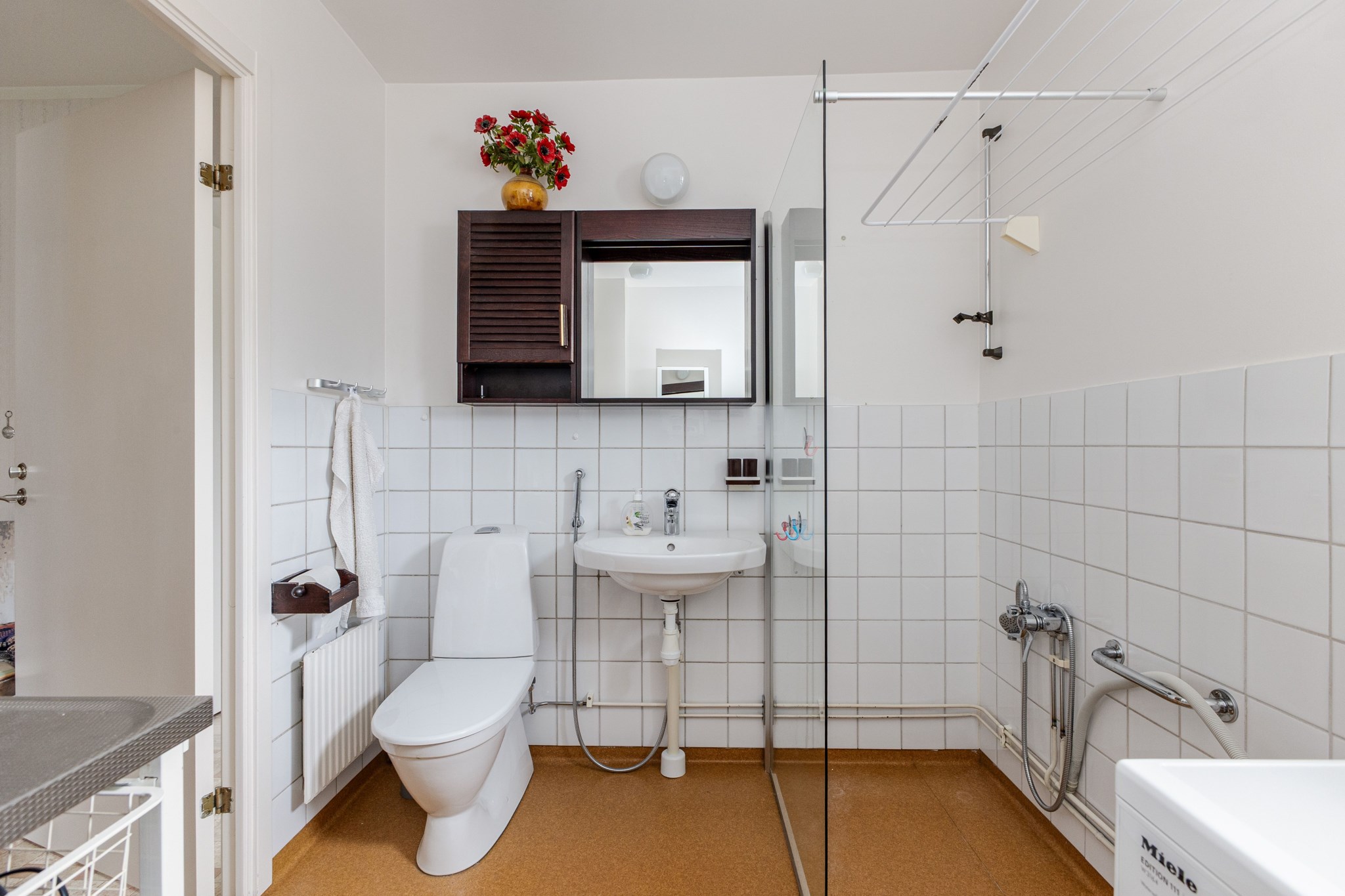 Stort badrum med plastmatta och delvis kaklade väggar. Wc och handdat (2018), tvättmaskin (Miele), dusch, duschvägg i glas (2018), badrumskåp, diskho i rostfritt.