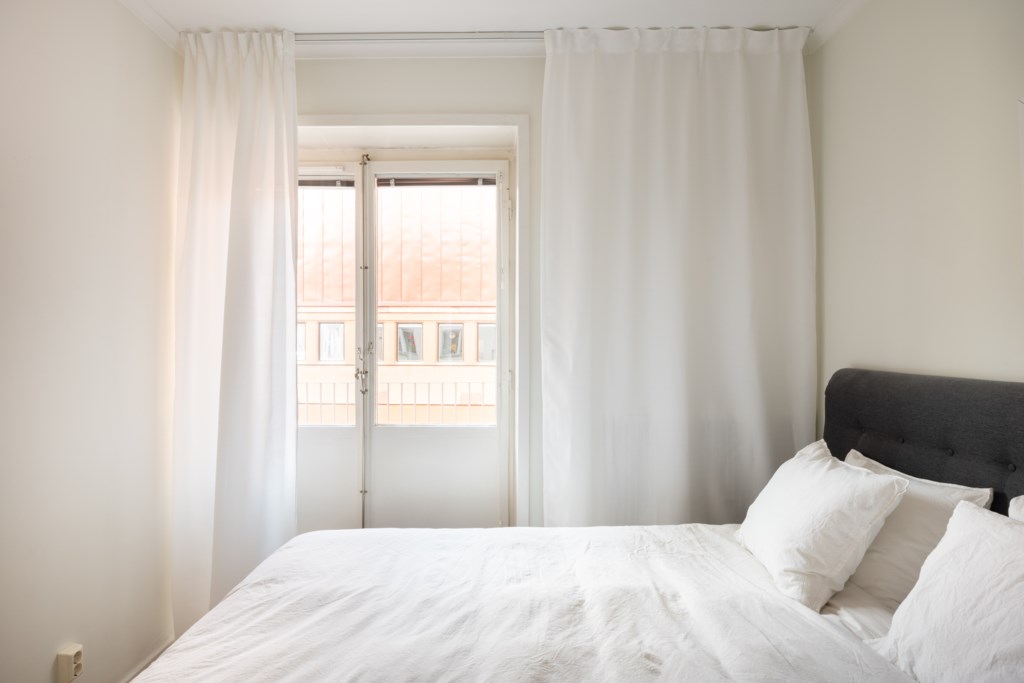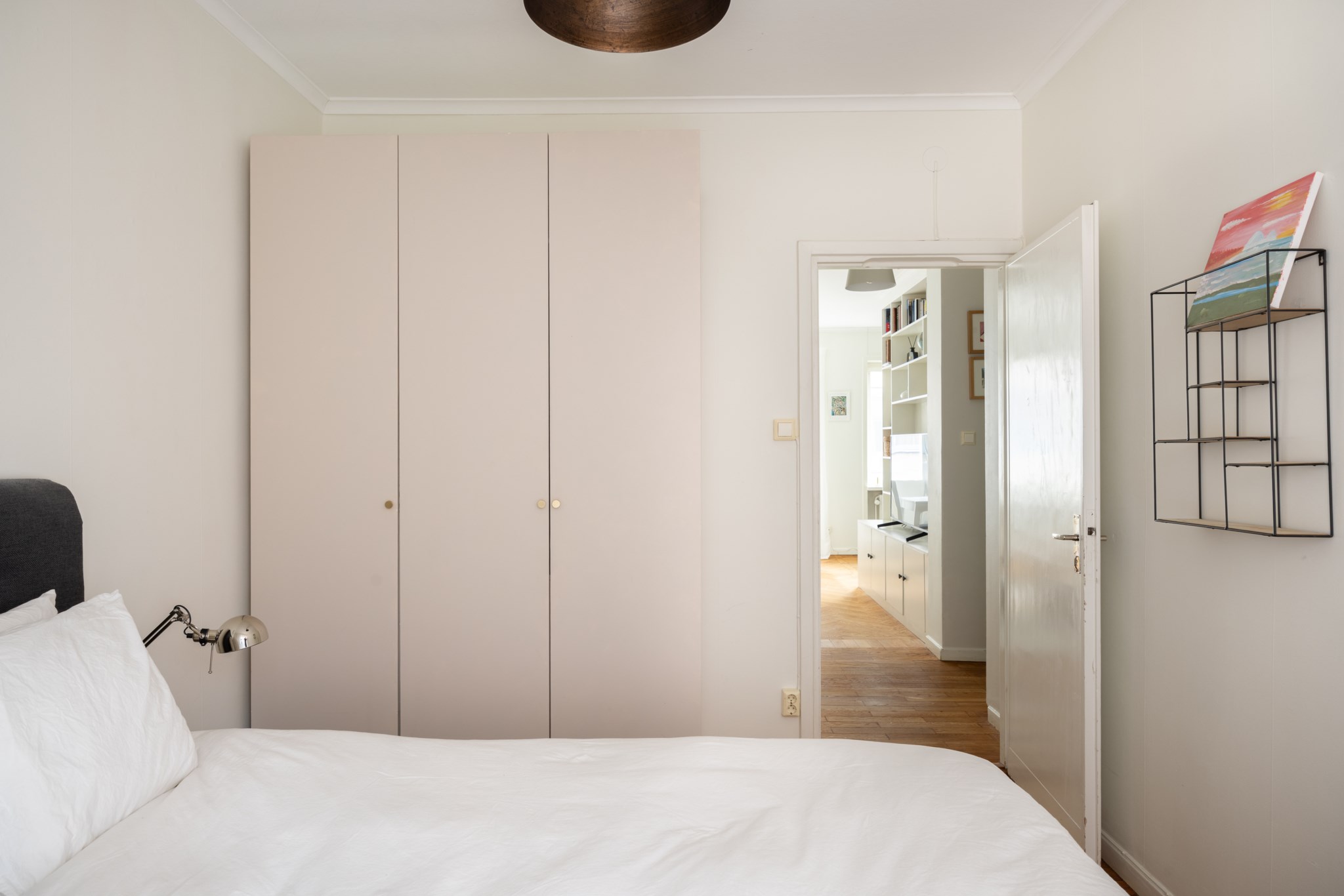 Rymligt sovrum med plats för dubbelsäng. I sovrummet möts du av ett härligt ljusinsläpp via ett fönster. Här finns även generöst med förvaringsmöjligheter via garderober. Tidlösa ytskikt bestående av ljusa väggar och ljust golv.