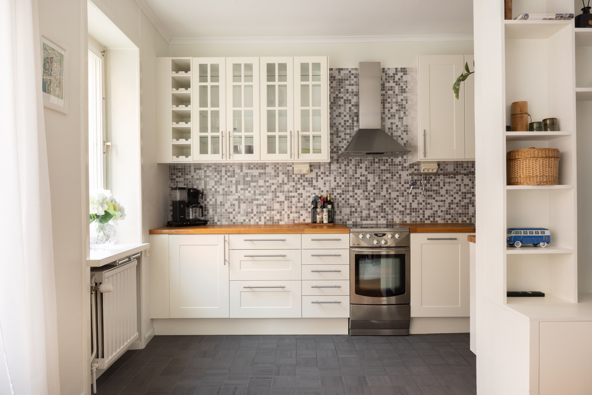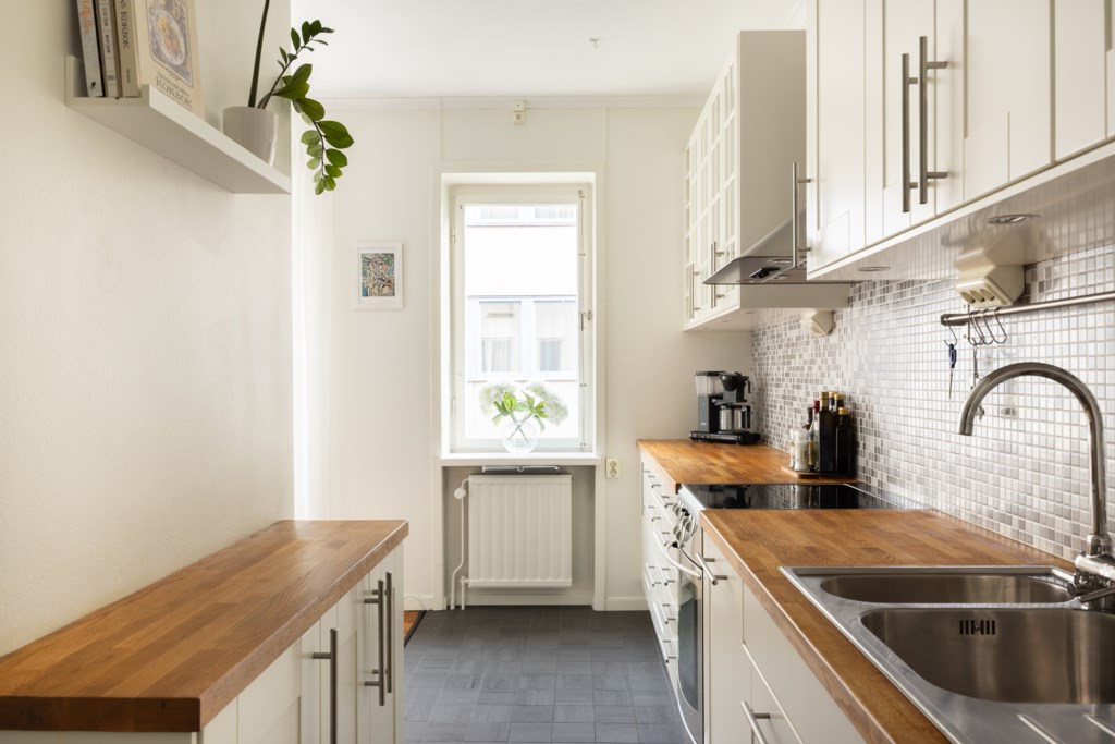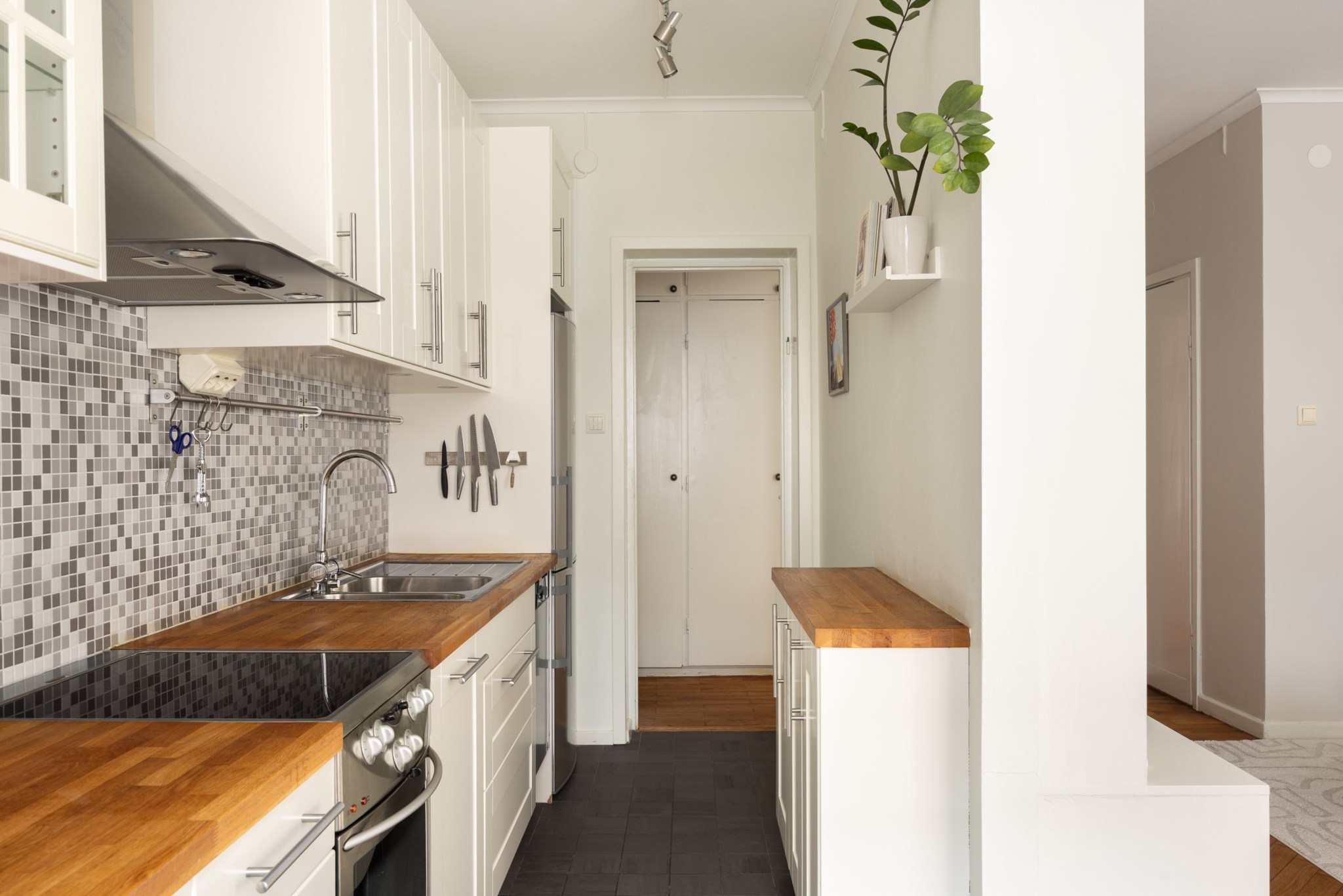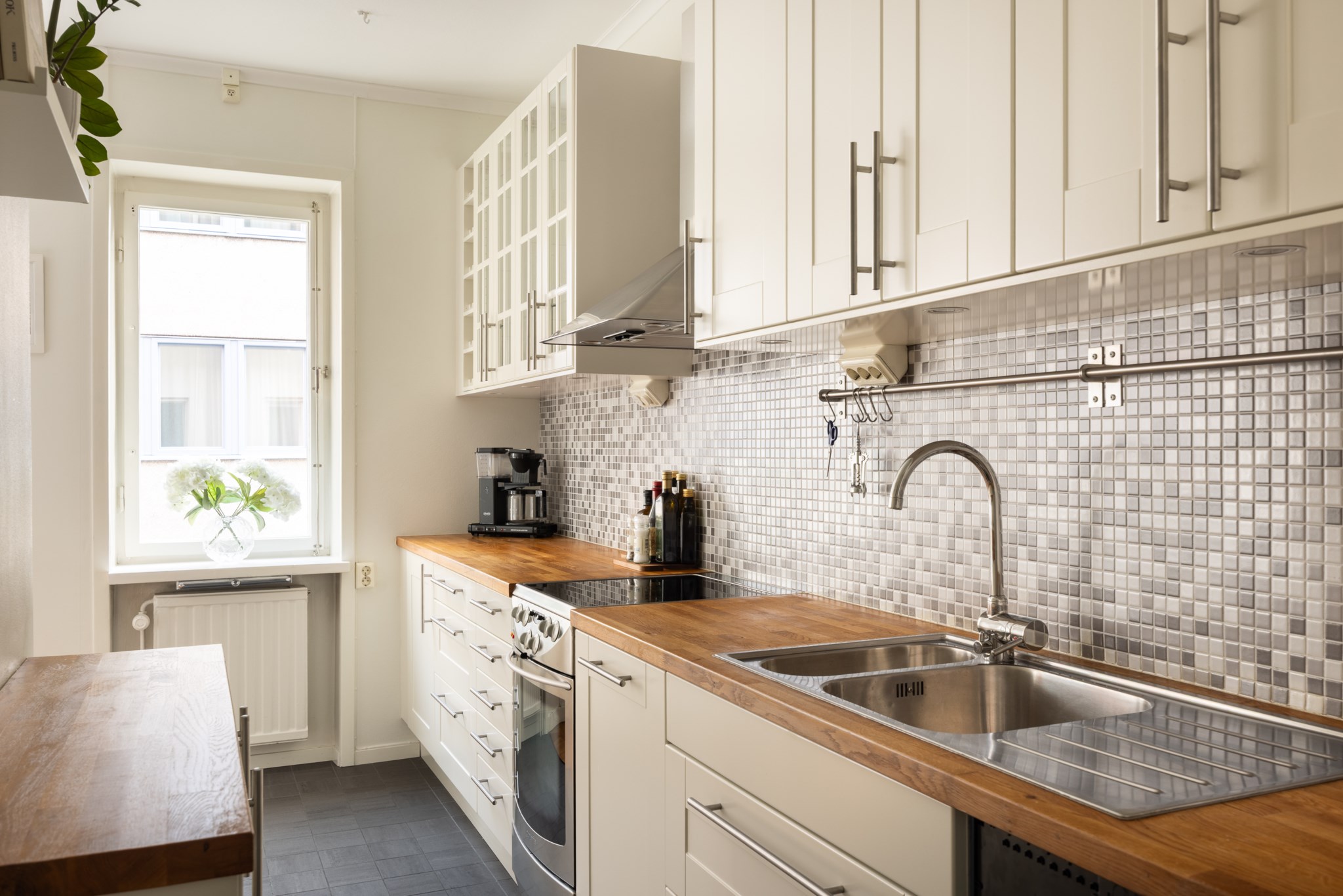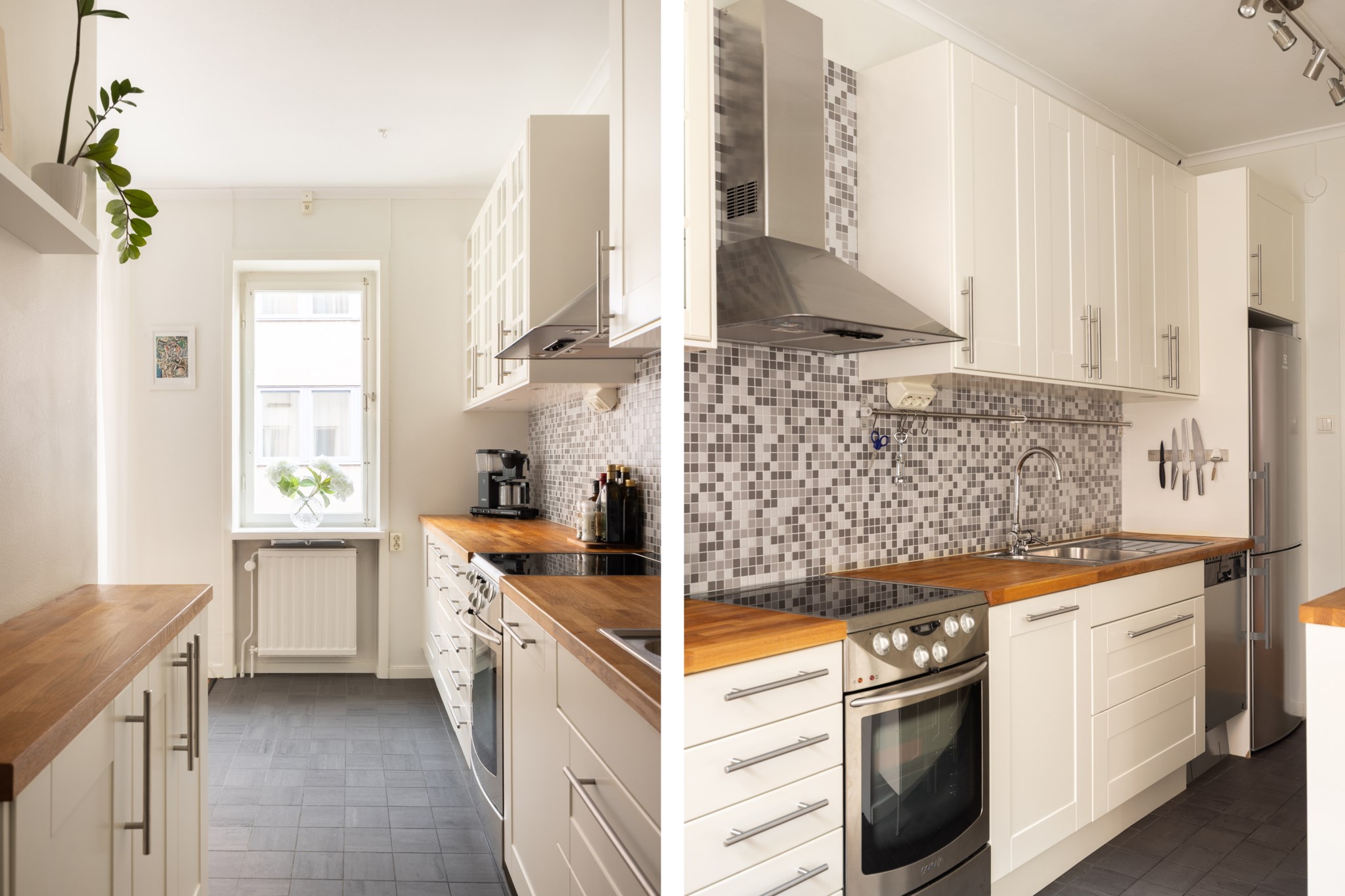 Smakfullt kök med stilrena materialval bestående av köksluckor i vitt samt bänkskiva med stänkskydd. Köket är utrustat med diskho, spis, köksfläkt, ugn samt kyl och frys. Ett härligt ljusinsläpp tar sig in via ett fönster. Tidlösa ytskikt bestående av ljusa väggar och mörkt klinker.