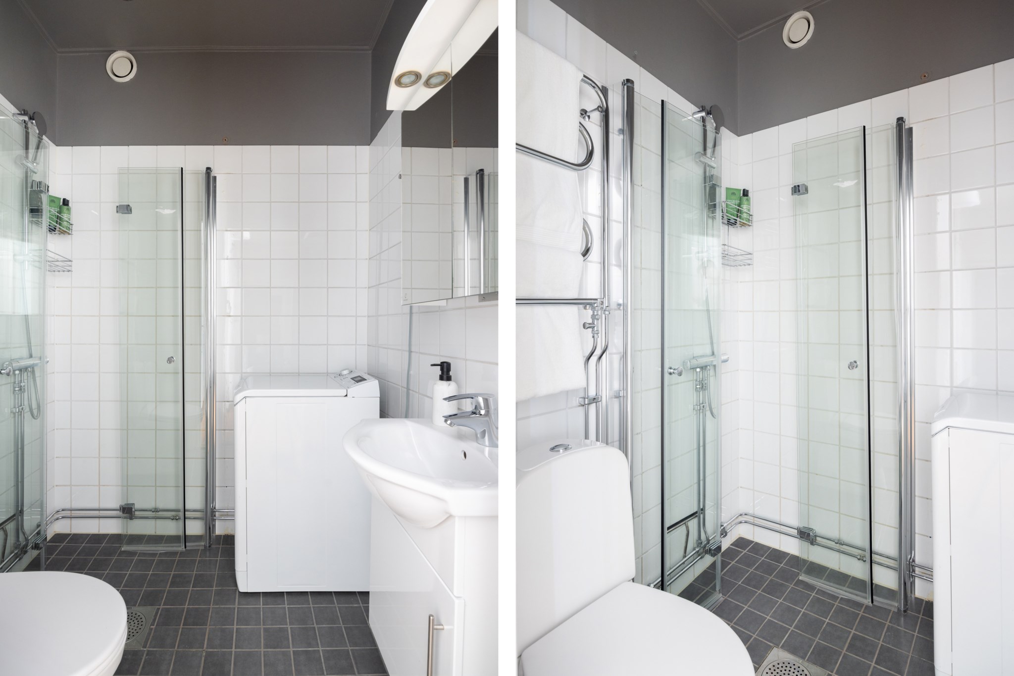 Det rymliga köket är både funktionellt och fint med god plats för både matlagning och umgänge. I det luftiga sovrummet finns gott om plats för säng och övrigt möblemang. Det helkaklade badrummet håller bra standard och har tvättmaskin.