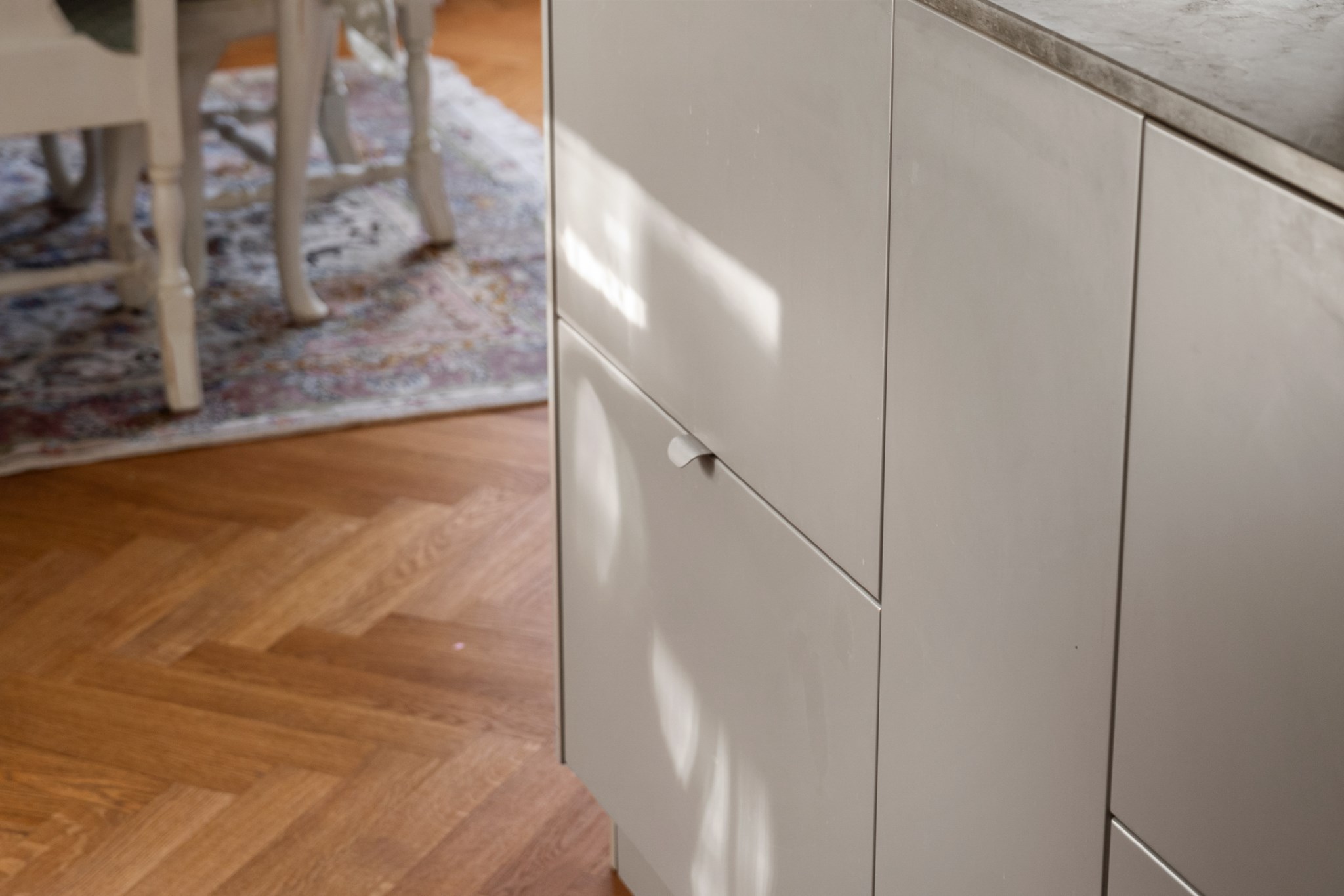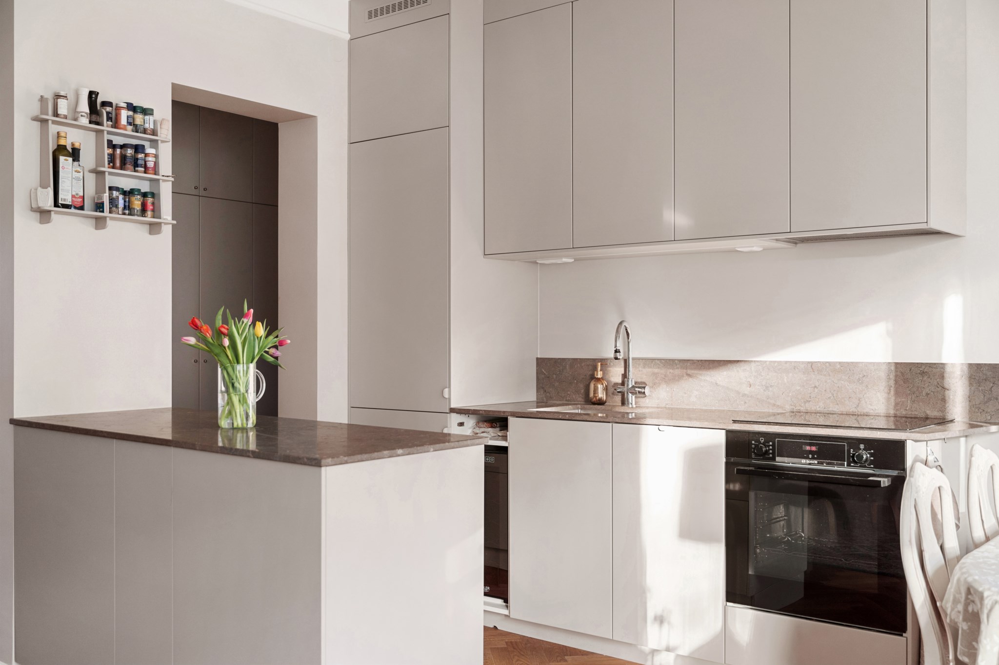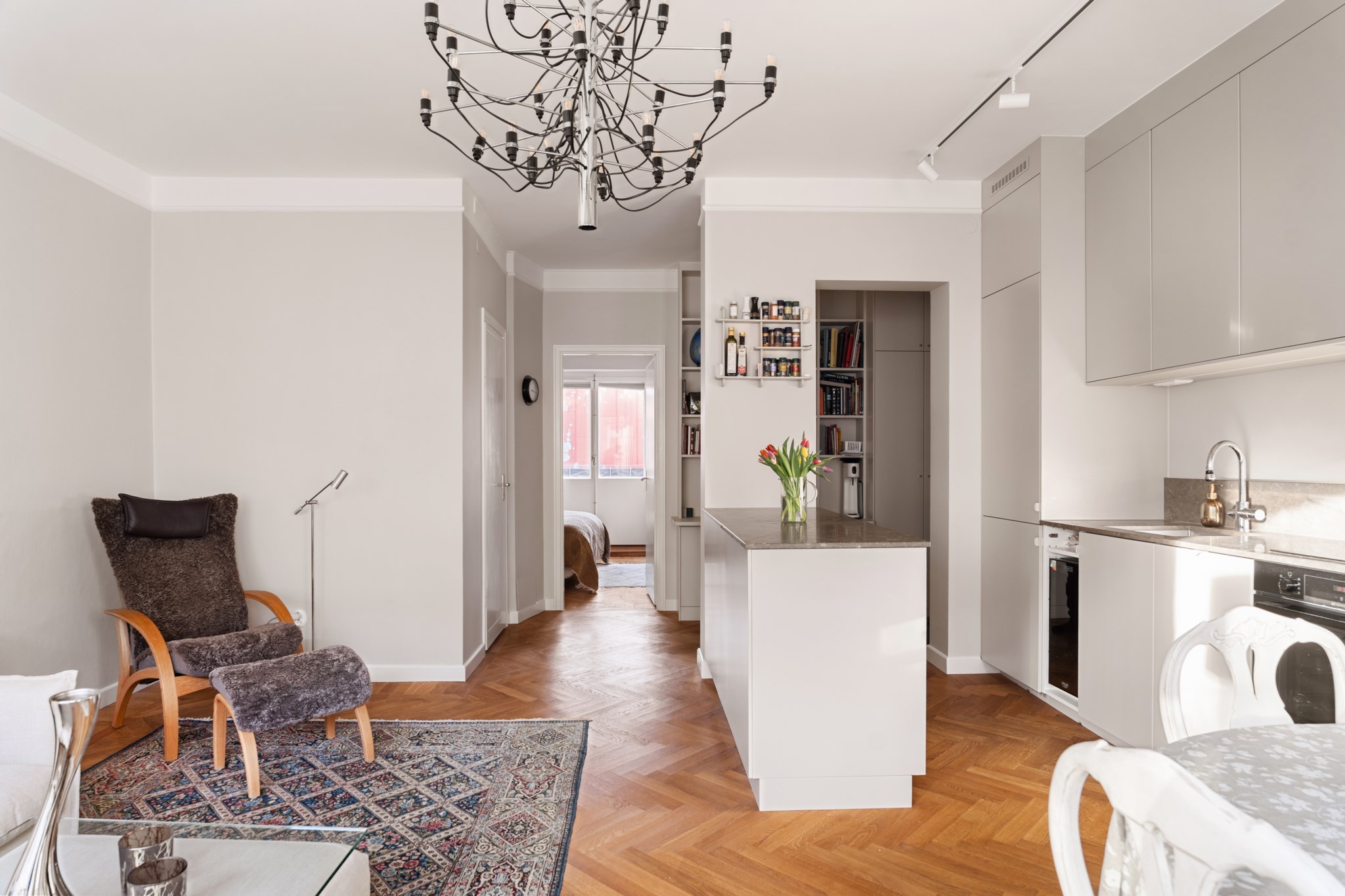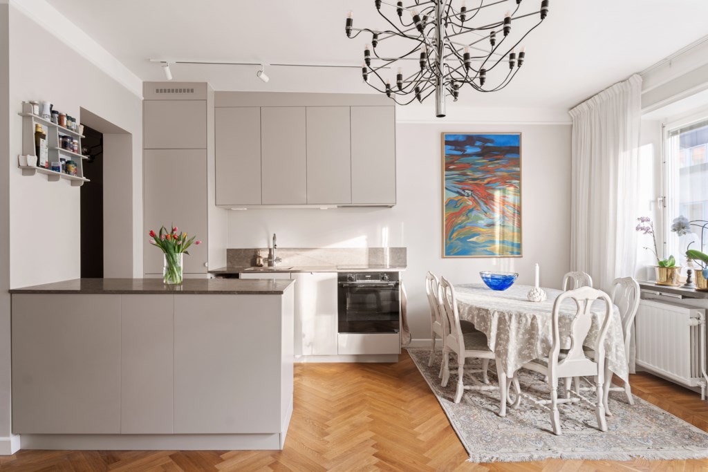 Det nyrenoverade köket är lika stilfullt som funktionellt, med exklusiva bänkskivor och generösa ytor för både matlagning och sociala tillställningar. Det platsbyggda hemmakontoret ger bostaden ett personligt och inbjudande uttryck, en självklar plats för arbete, läsning eller kreativitet. Sovrummet är luftigt och rofyllt, med platsbyggda garderober och plats för en fullstor 180-säng. Det helkaklade badrummet håller hög standard och är utrustat med elegant bänkskiva samt integrerad tvättmaskin.