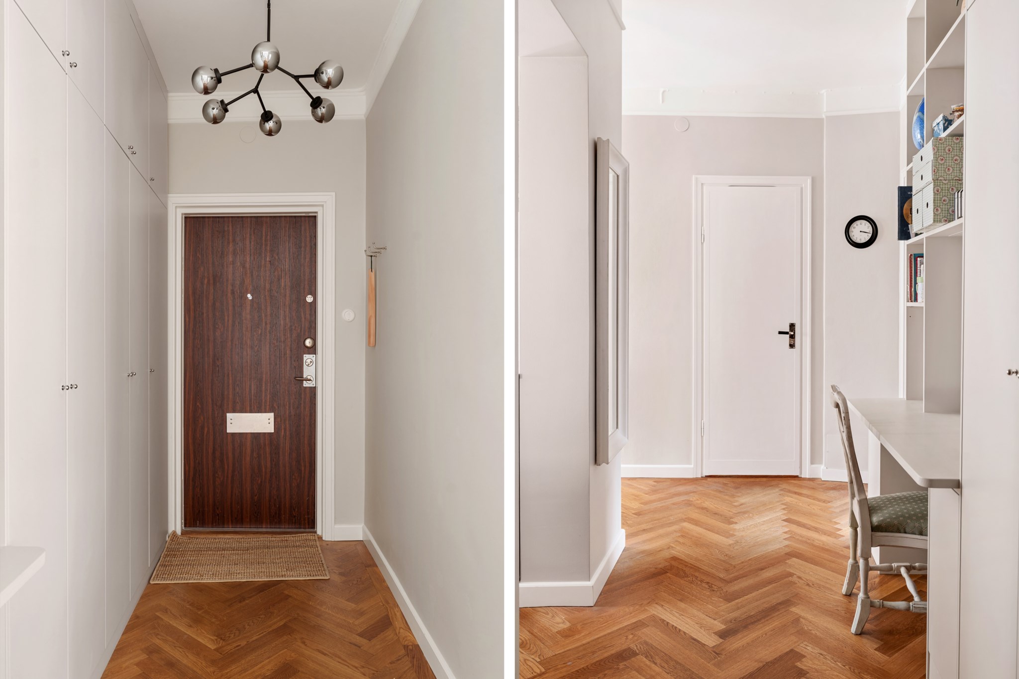 Välkomnande hall med ljusa väggar och stilren fiskbensparkett. Goda förvaringsmöjligheter erbjuds genom en platsbyggd garderob, och här finns även en elegant platsbyggd bokhylla med integrerat skrivbord.
