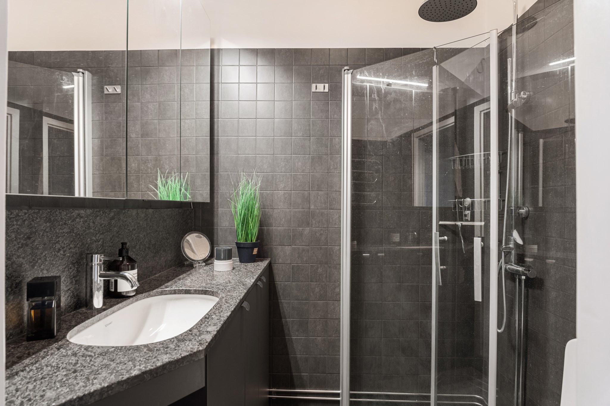 Smakfullt och modernt badrum med genomtänkt materialval i mörka toner. Väggar och golv är klädda i stilrent kakel som ger en exklusiv och enhetlig känsla. Badrummet är utrustat med en rymlig duschhörna med glasväggar och takdusch, WC, tvättmaskin samt handdukstork. Den generösa kommoden med stenbänkskiva och inbyggt handfat erbjuder gott om förvaring och kompletteras av stort spegelskåp med bra belysning. Ett välplanerat badrum med hög komfort och tidlös design.