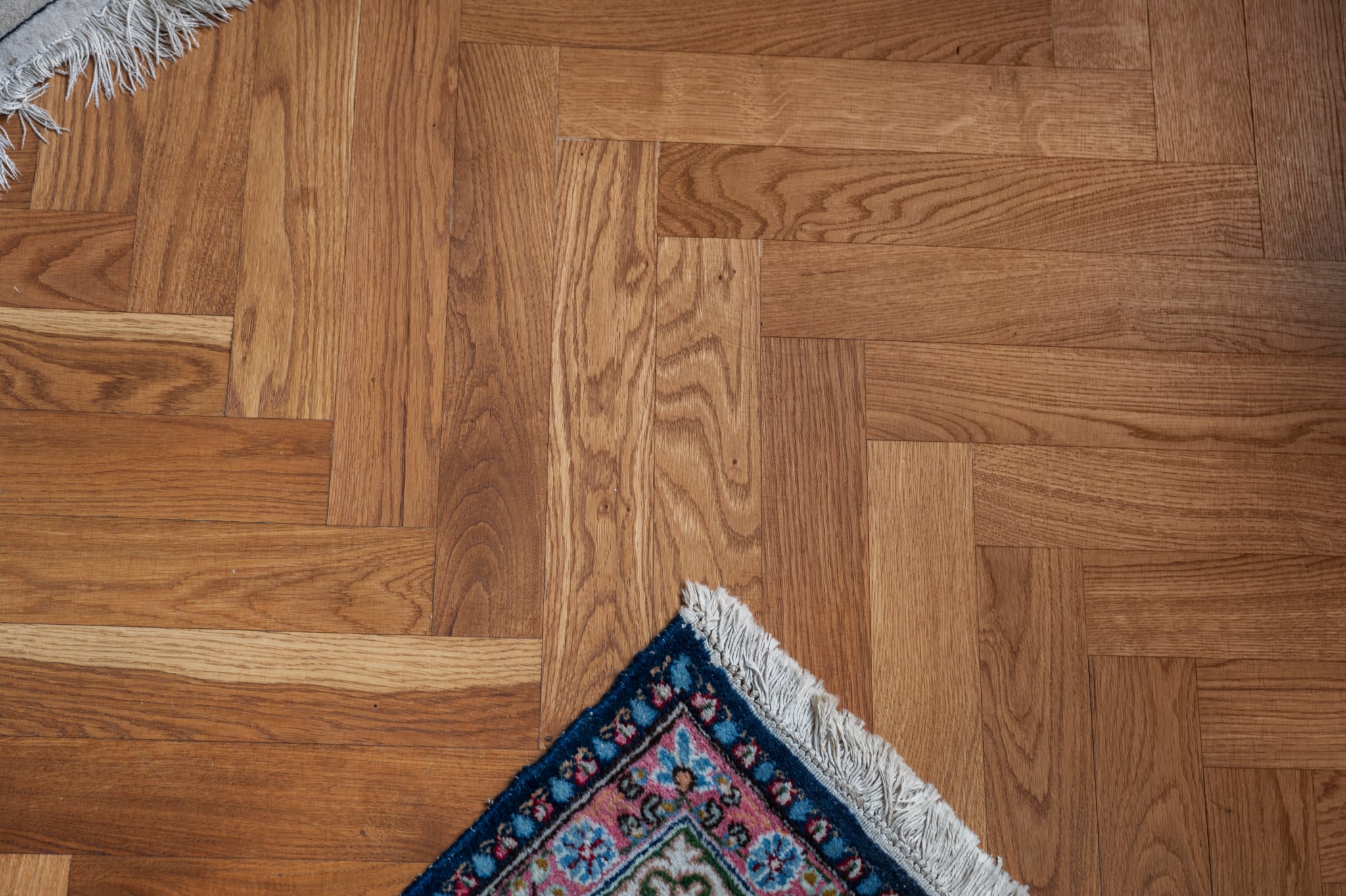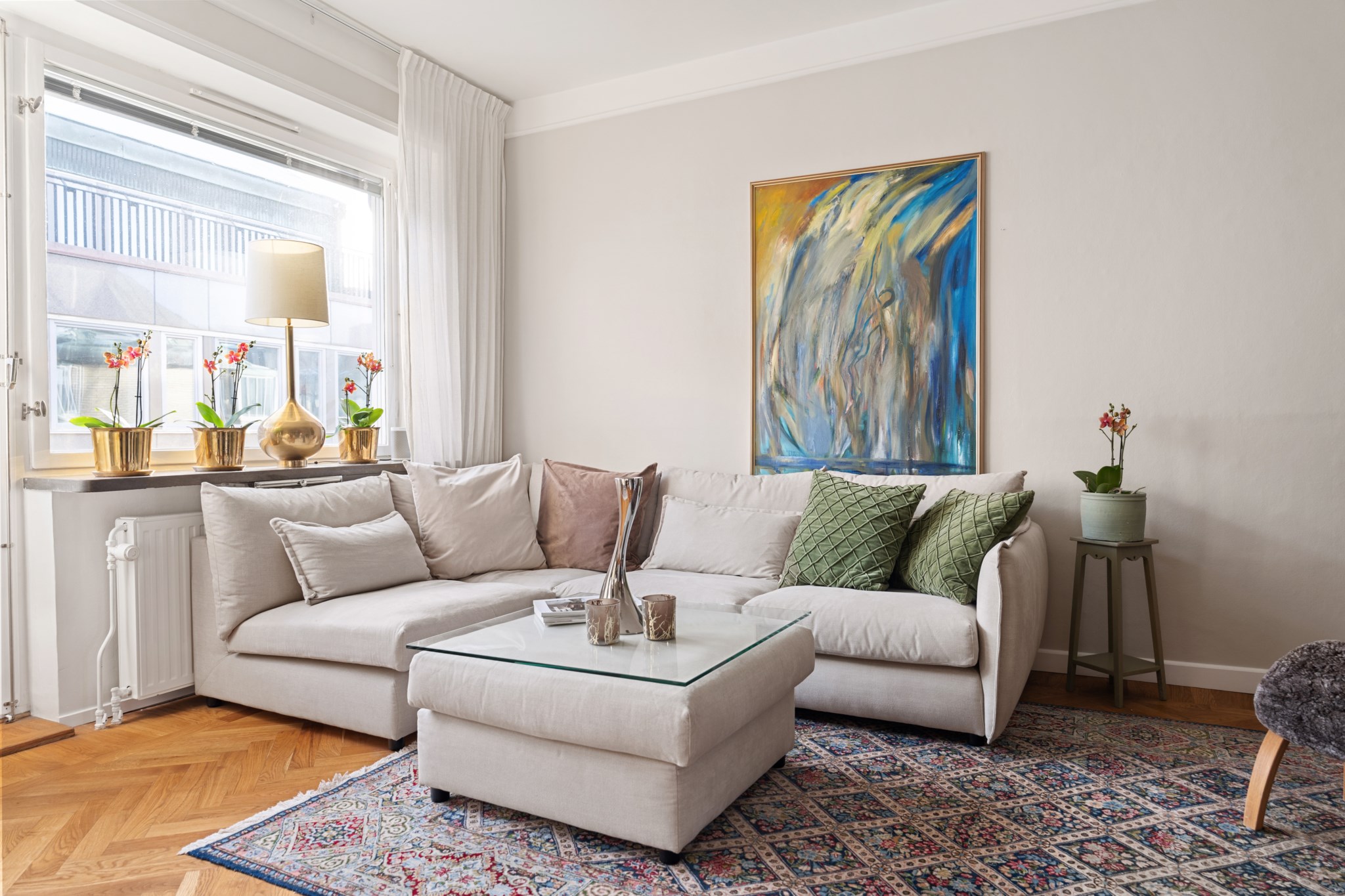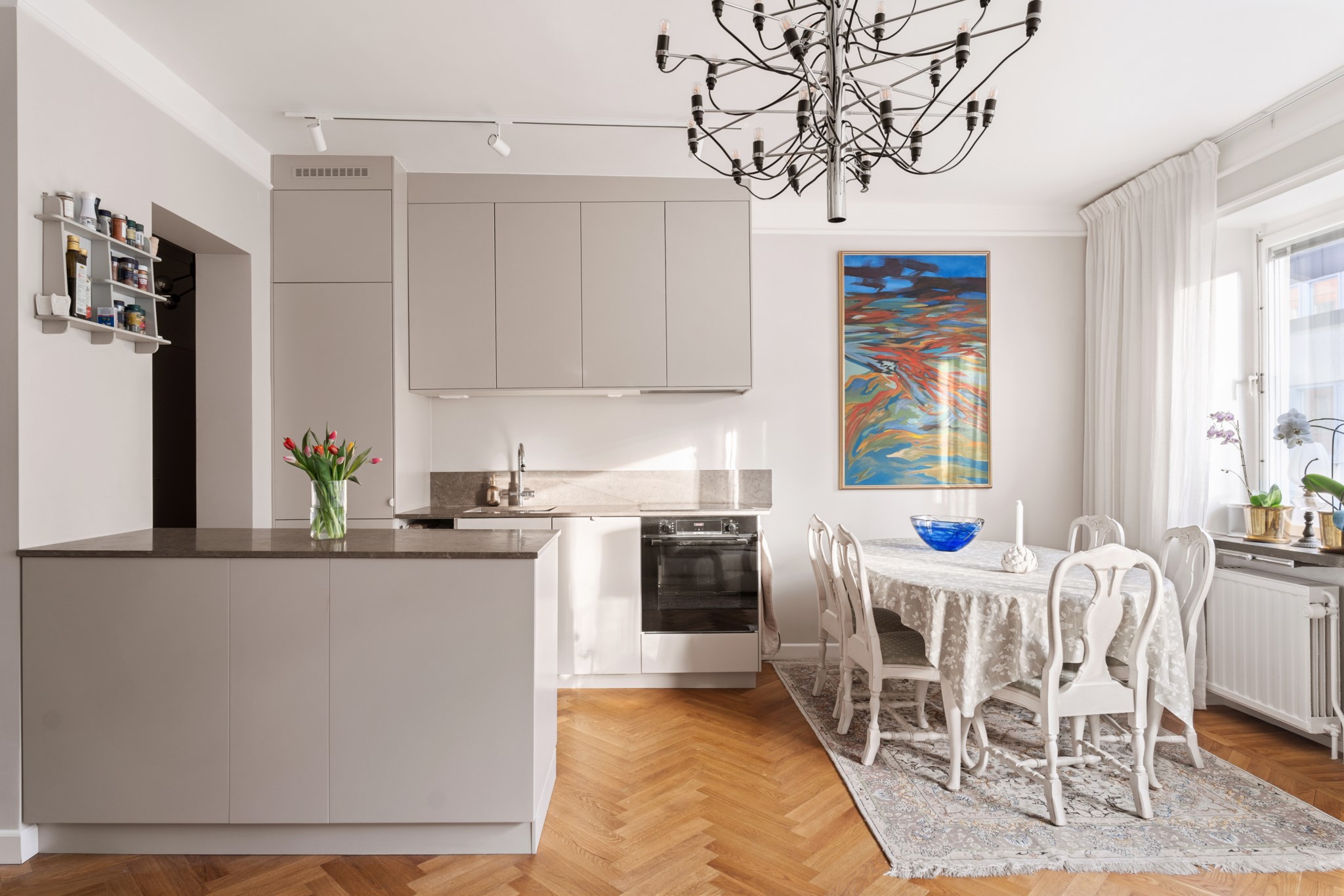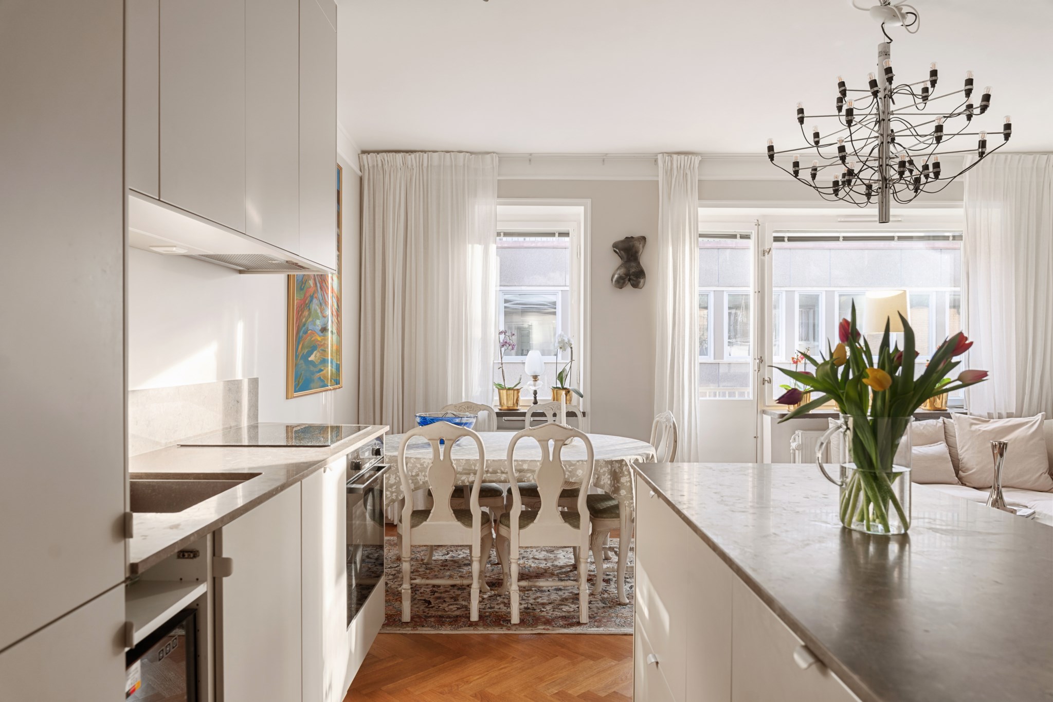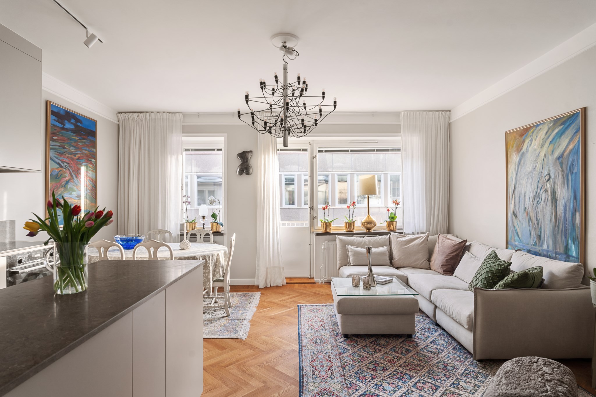 Ljust och luftigt vardagsrum i öppen planlösning mot köket, med gott om plats för soffa, soffbord och övrigt möblemang efter behov. Rummet präglas av ljusa väggar och vacker fiskbensparkett samt ett generöst ljusinsläpp från stora fönsterpartier som skapar en inbjudande atmosfär.