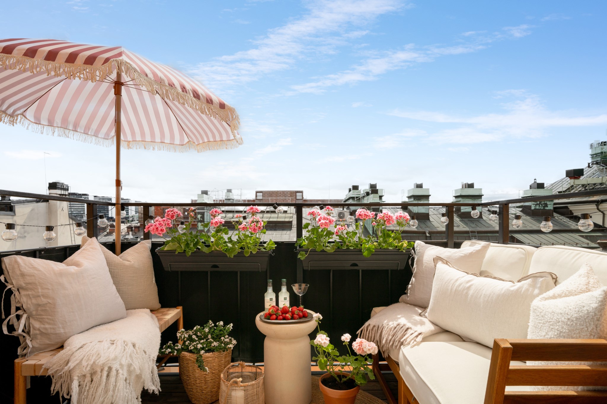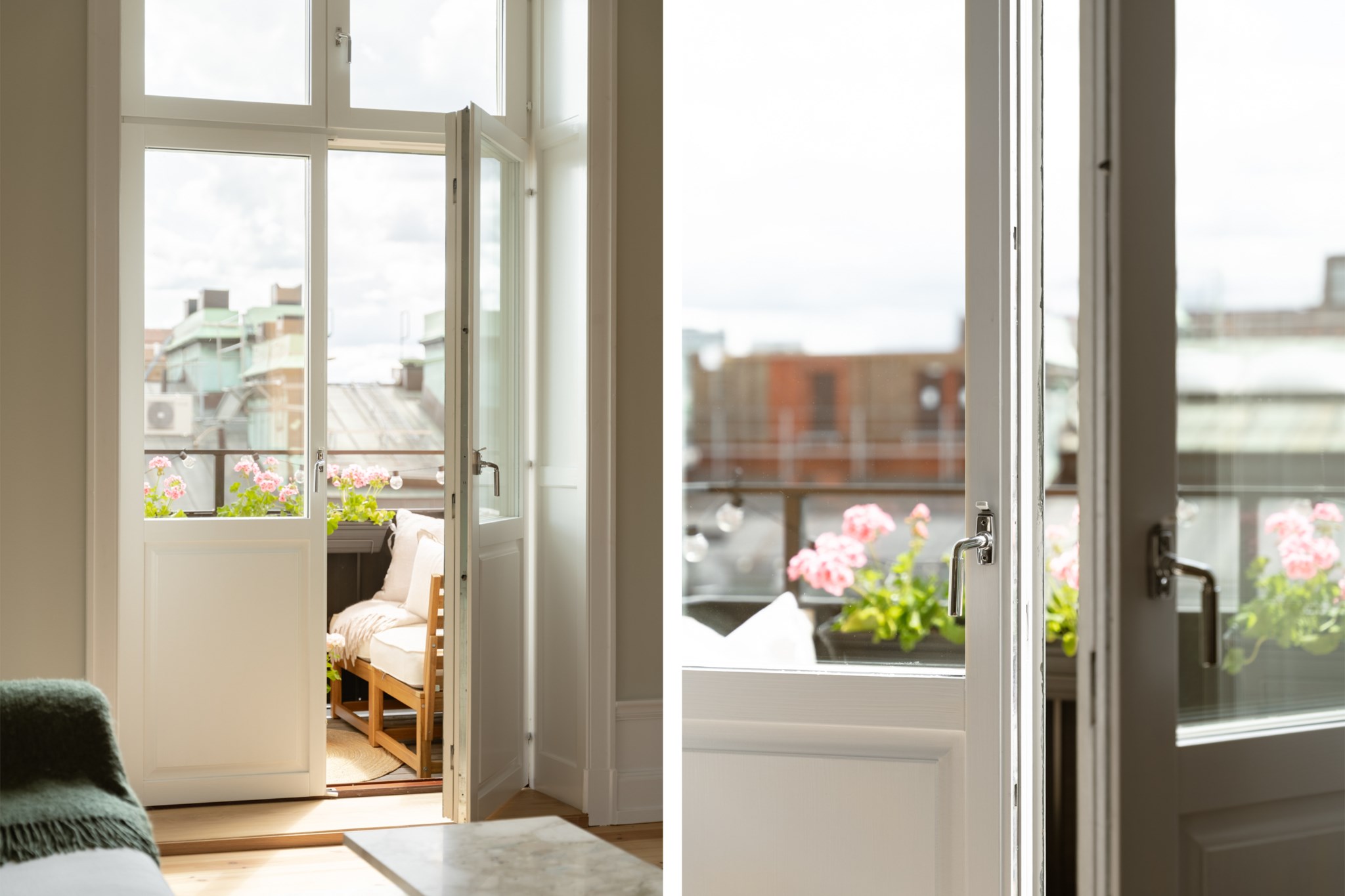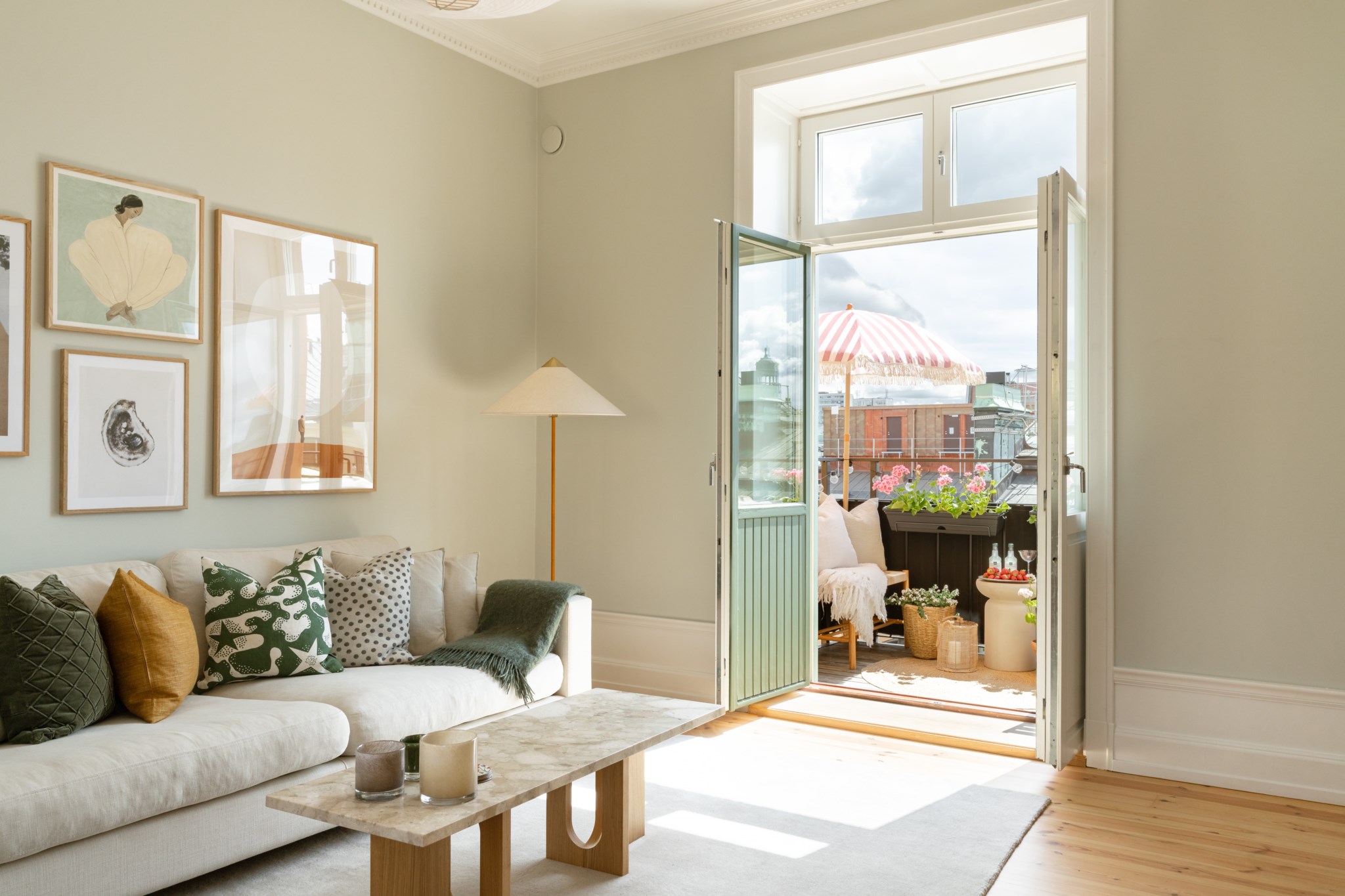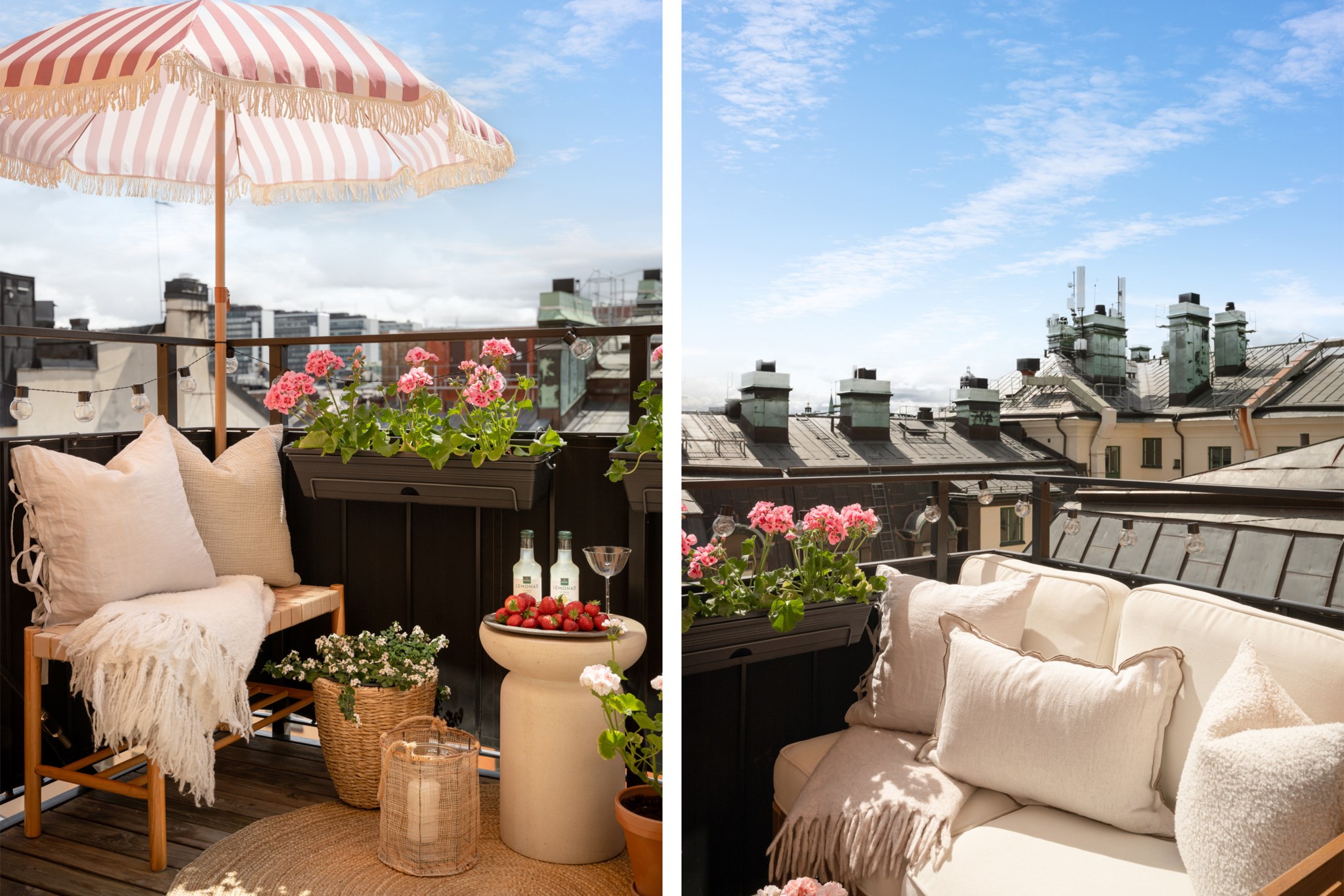 Till lägenheten hör en balkong med plats att möblera med soff- eller sittgrupp.