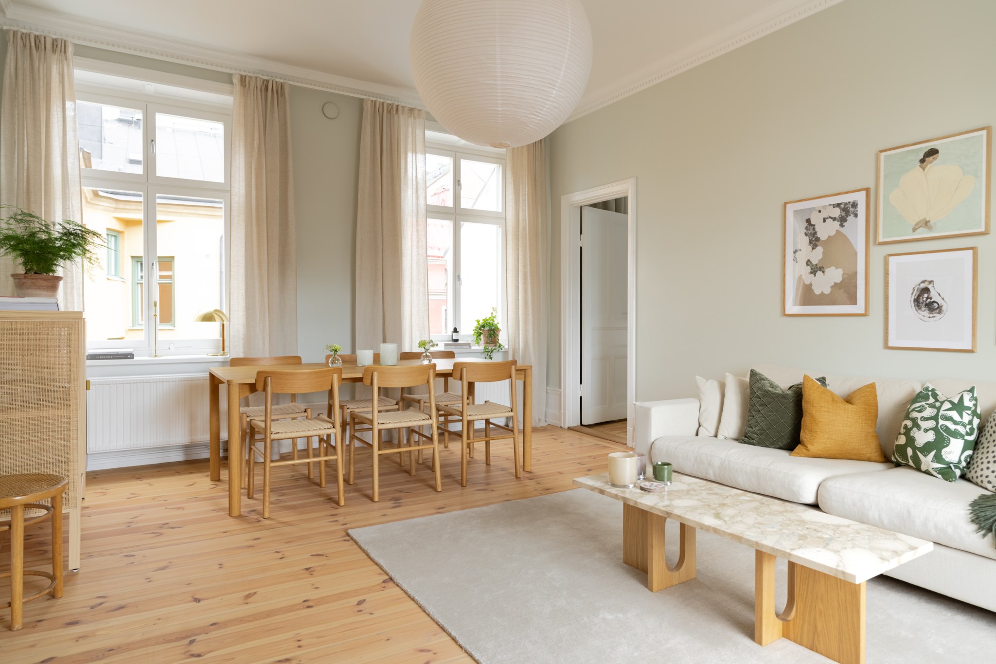 Bostaden är nyrenoverad med ett exklusivt kök från 2024, fullt utrustat med moderna vitvaror, generösa arbetsytor och sobra materialval. Här är det en fröjd att laga mat och umgås. De vackra originalgolven i trä är nyslipade och behandlade med varsam hand för att framhäva sin naturliga skönhet – ett gediget hantverk som förhöjer känslan av elegans i hela hemmet. Den imponerande takhöjden, djupa fönsternischerna och de stora fönsterpartierna i fil fyller rummen med ljus och rymd, medan dekorativa stuckaturer och spegeldörrar för tankarna till svunna tiders prakt.