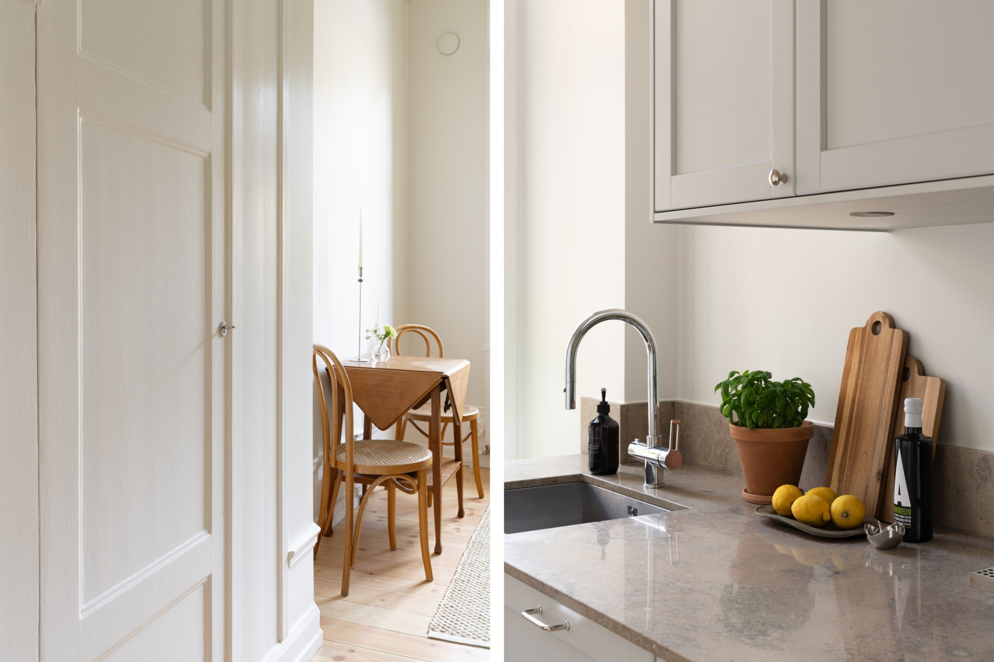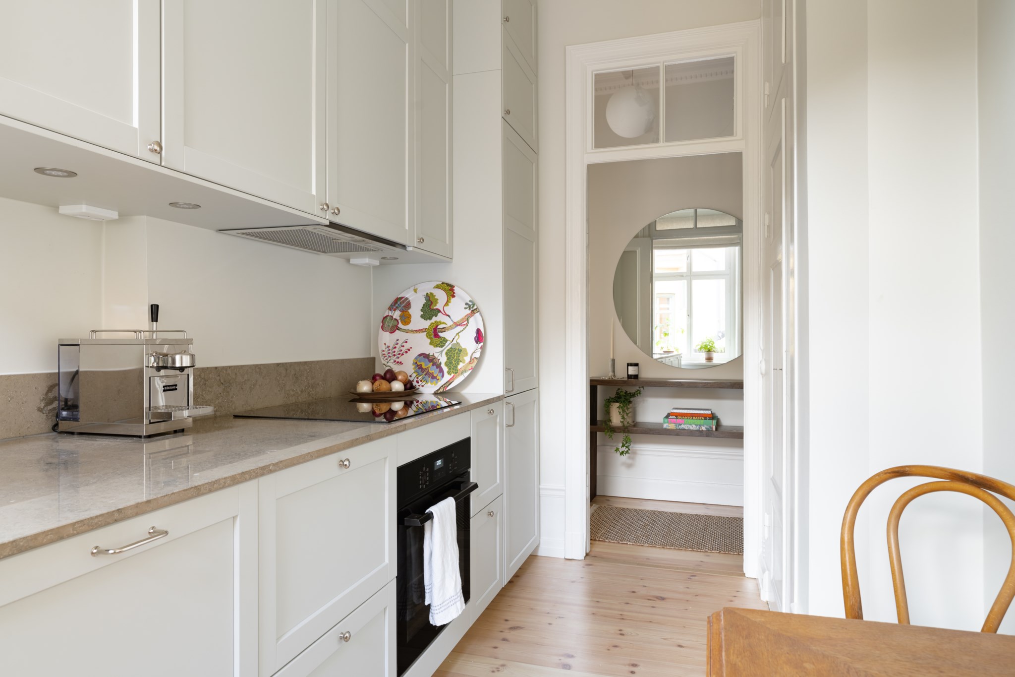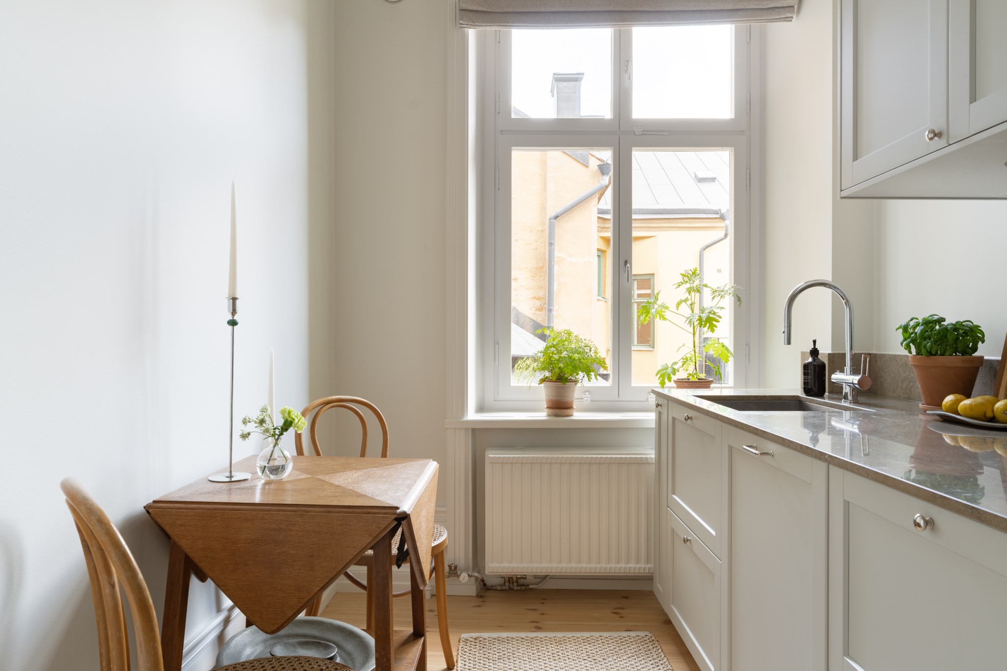 Tidlöst kök med moderna materialval bestående av köksluckor i beige nyans och arbetsyta ovan väl utvald bänkskiva i kalksten, Jura grey. Ytskikten består av ljusa väggar och ljust trägolv. Köket är utrustat med diskho, spis, fläkt, ugn, diskmaskin samt kyl och frys. Här inryms mindre matbord intill stort fönster som bidrar till ett härligt ljusinsläpp. Även ett originalskafferi.