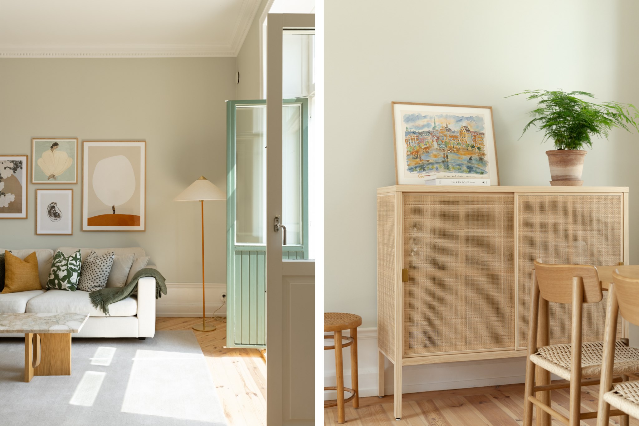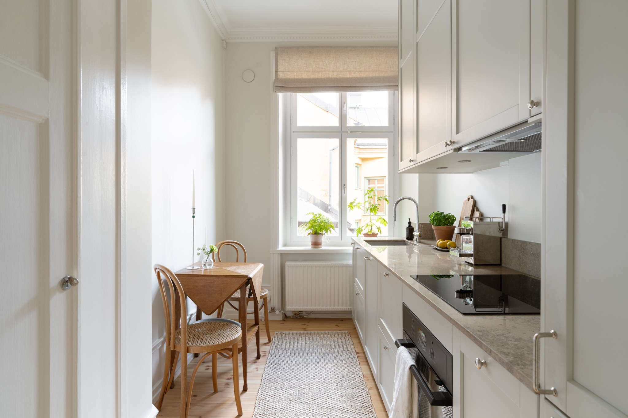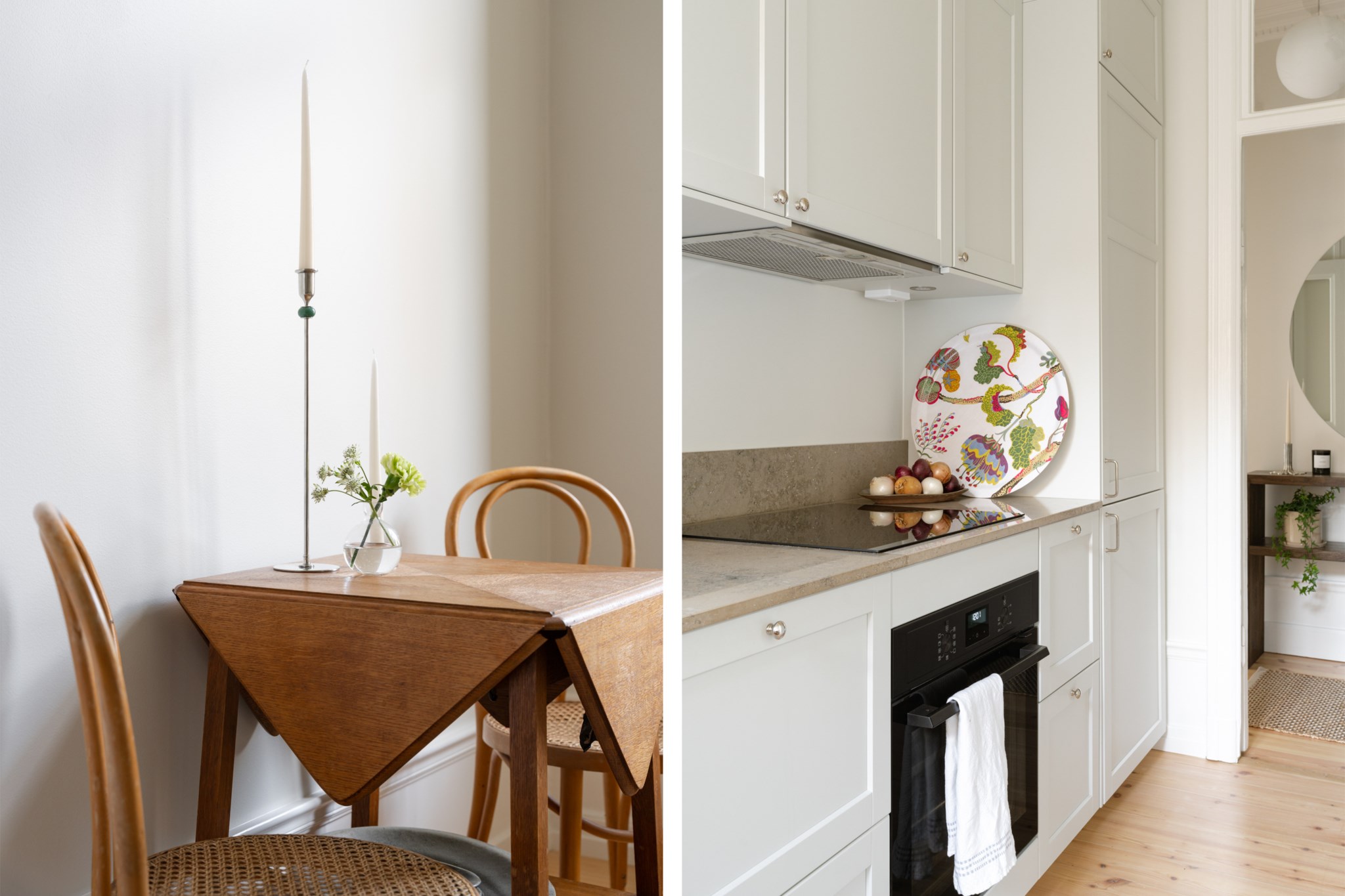 Tidlöst kök med moderna materialval bestående av köksluckor i beige nyans och arbetsyta ovan väl utvald bänkskiva i kalksten, Jura grey. Ytskikten består av ljusa väggar och ljust trägolv. Köket är utrustat med diskho, spis, fläkt, ugn, diskmaskin samt kyl och frys. Här inryms mindre matbord intill stort fönster som bidrar till ett härligt ljusinsläpp. Även ett originalskafferi.