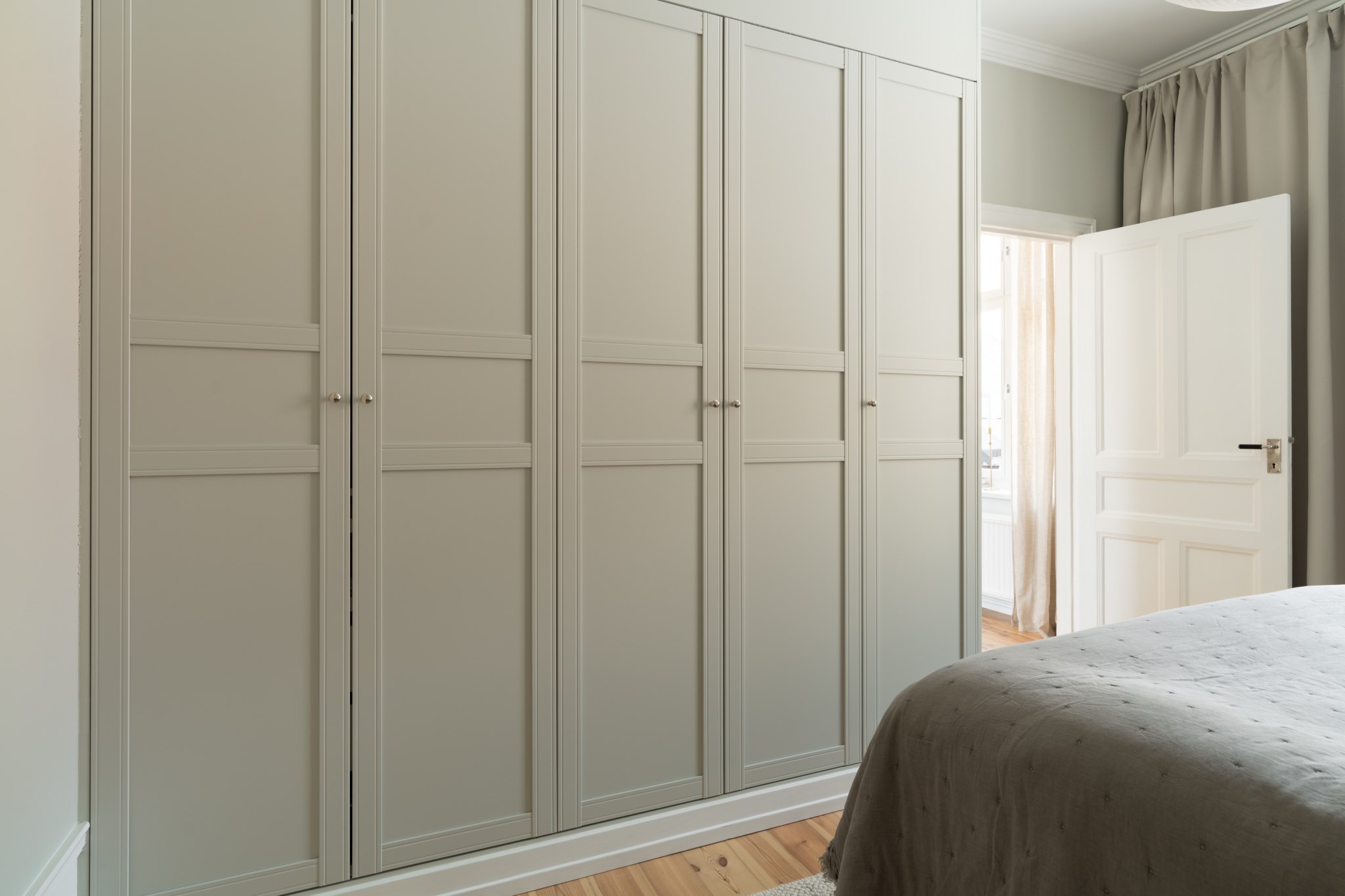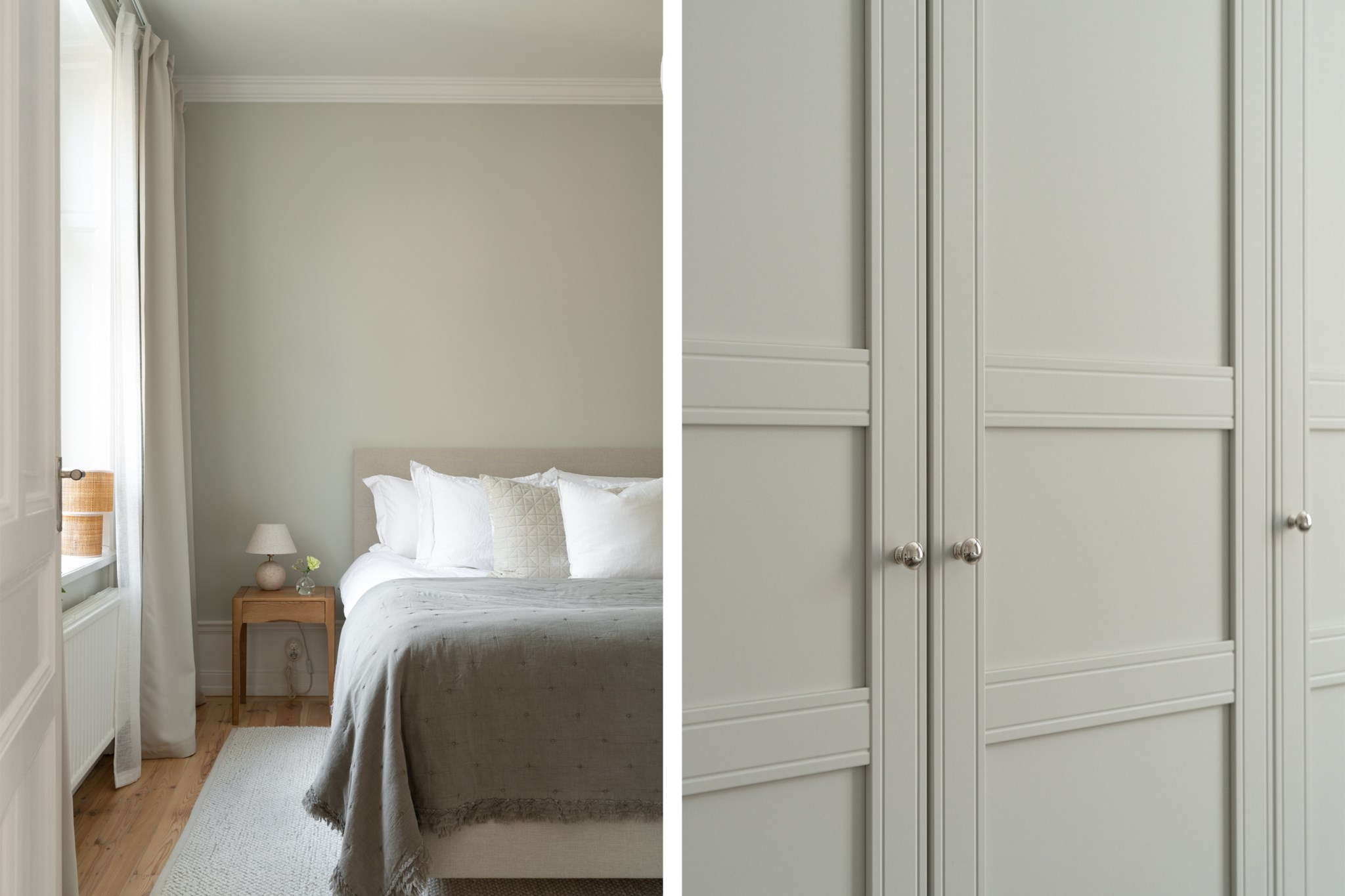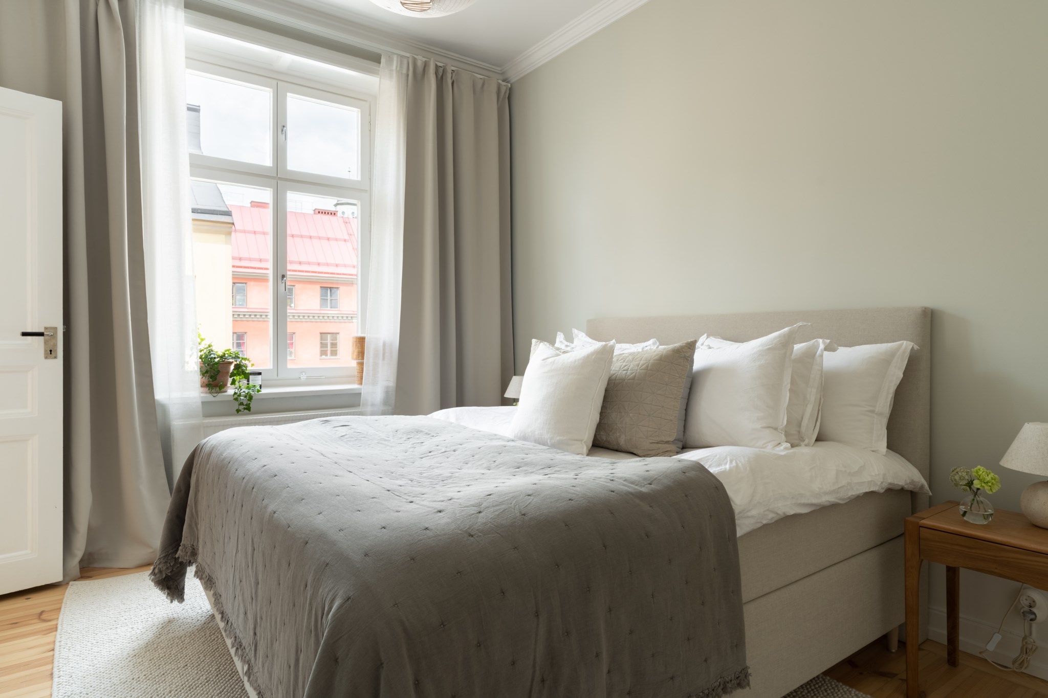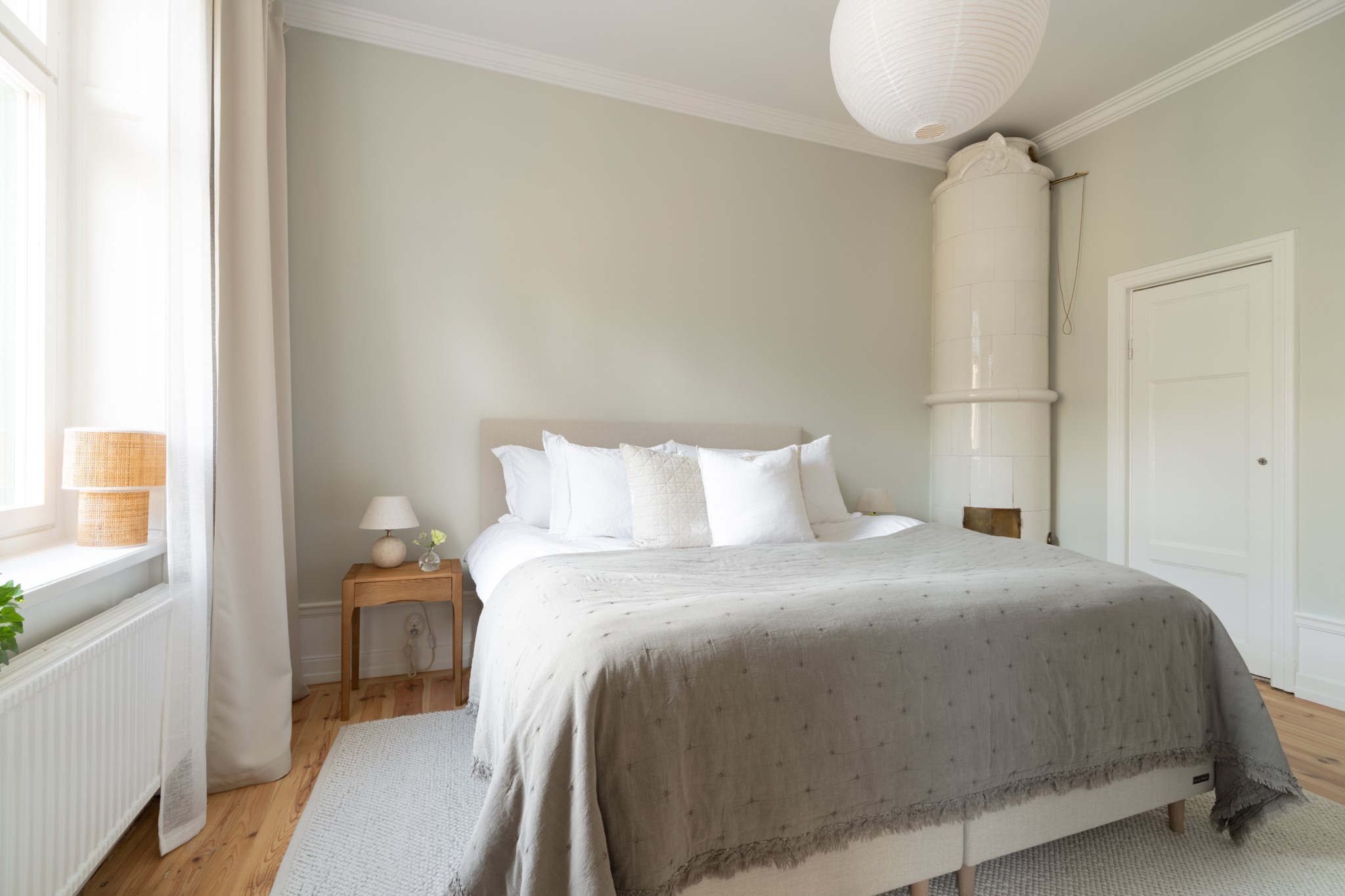 Stort sovrum med plats för dubbelsäng, sängbord och annat möblemang efter smak och behov. Ytskikten består av ljusa väggar och ljust trägolv. Fint ljusinsläpp från stort fönster skapar en härlig rymd i rummet tillsammans med den vackra kakelugnen. Sovrummet erbjuder även gott med förvaring via platsbyggd garderob.