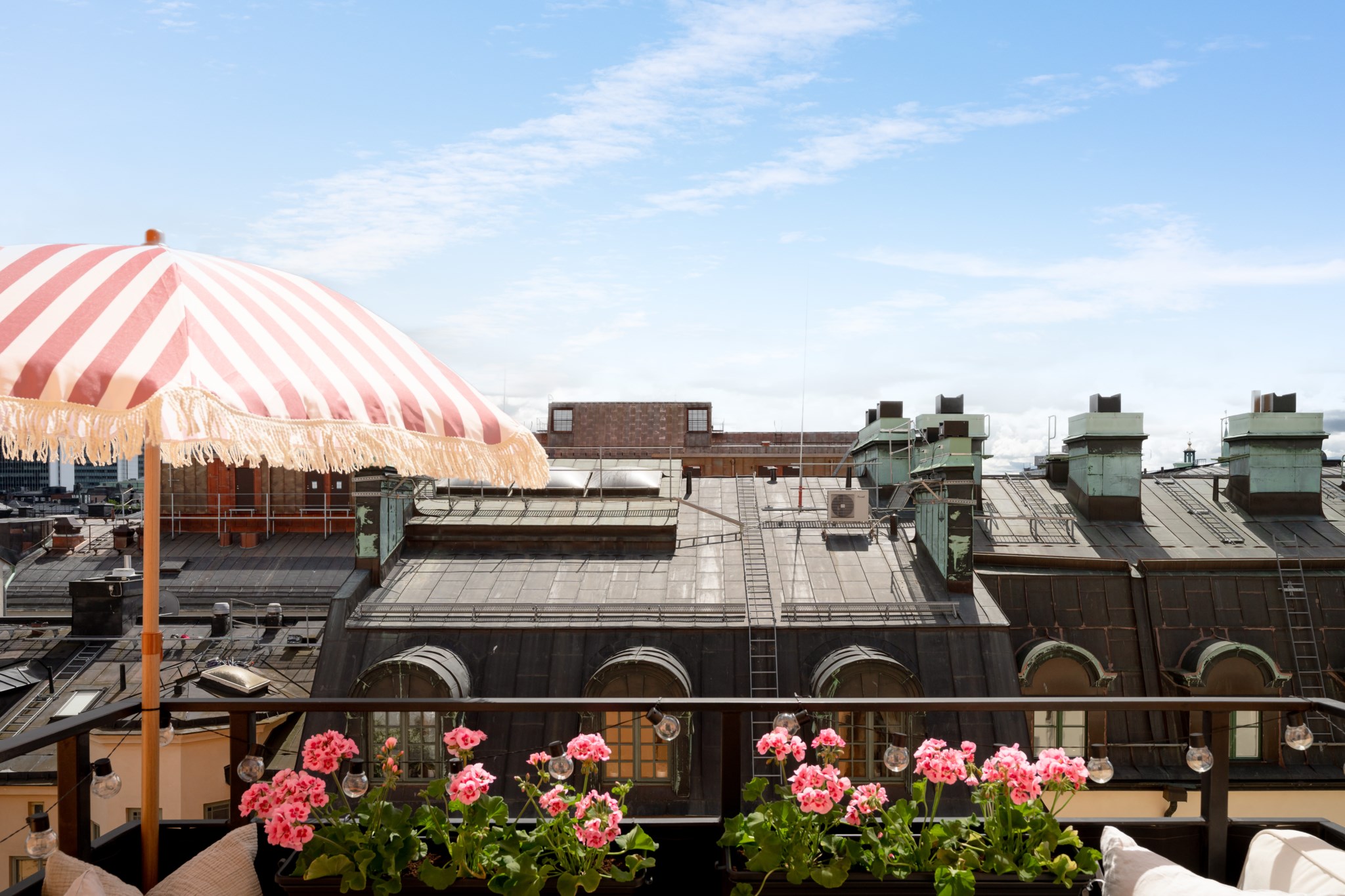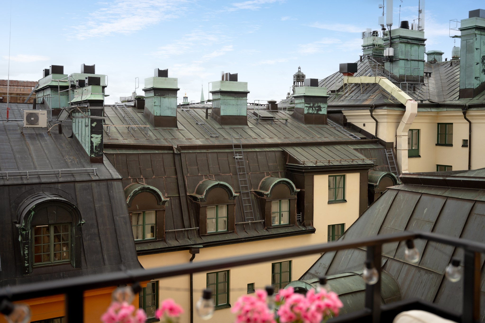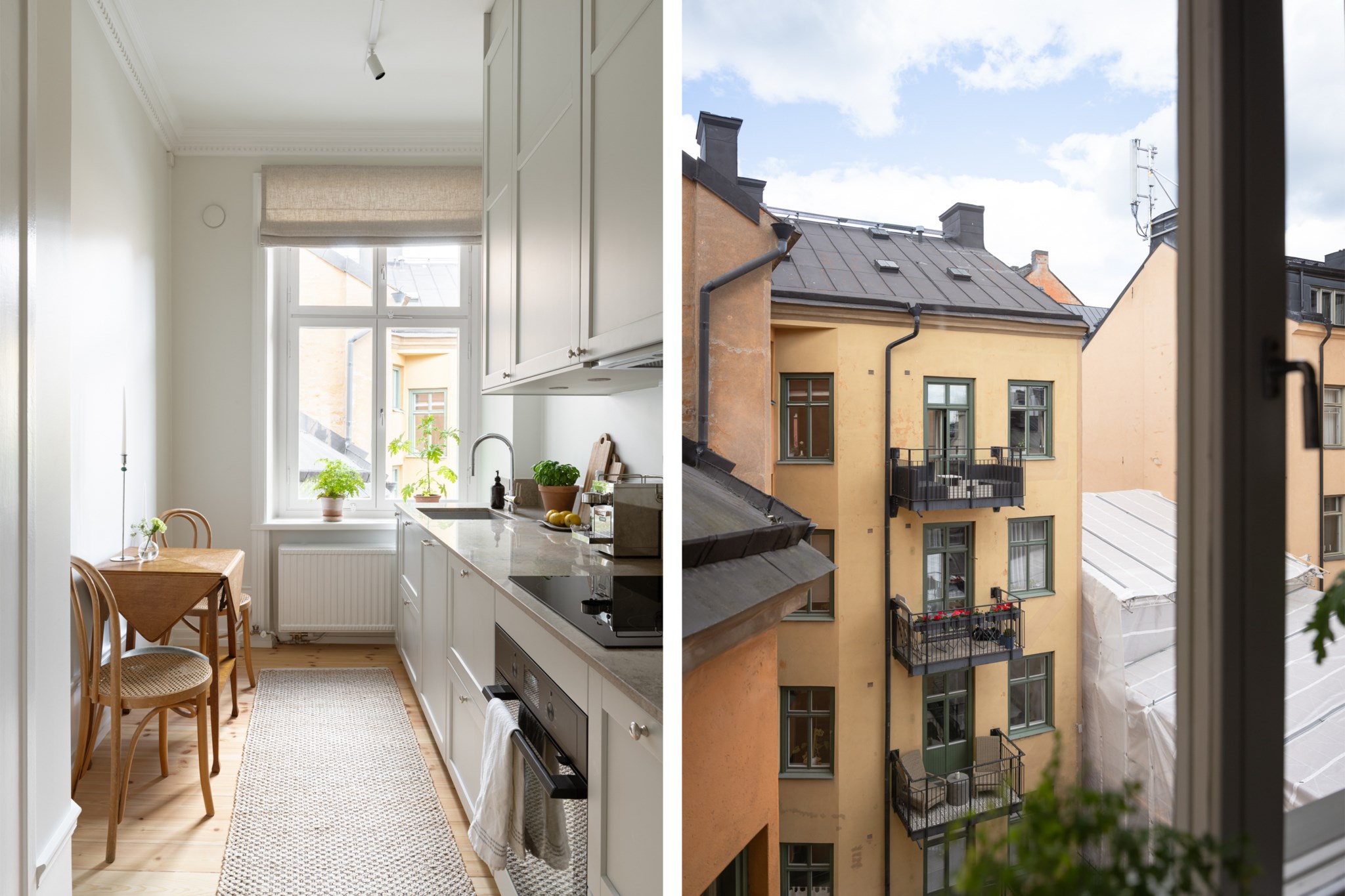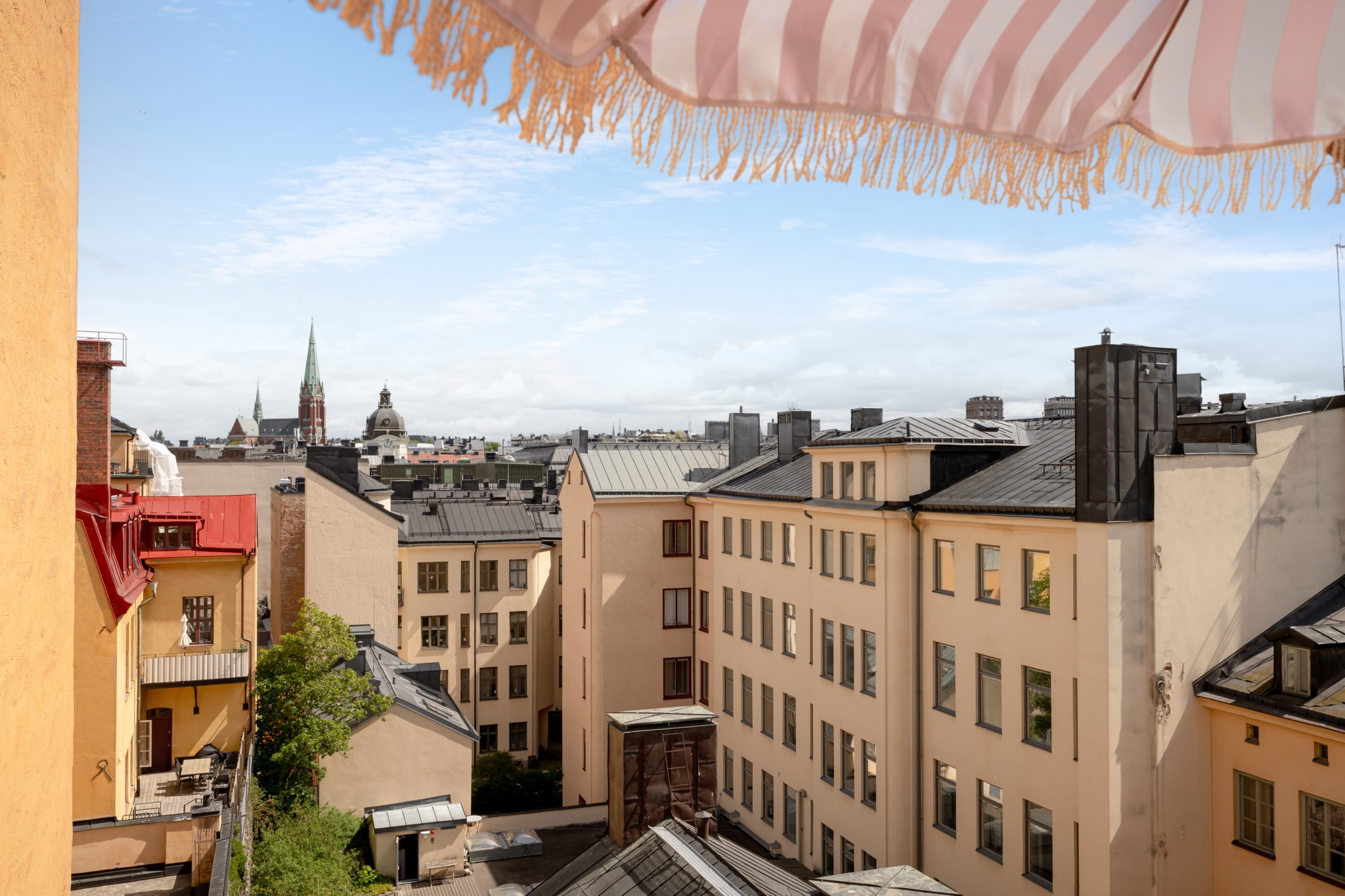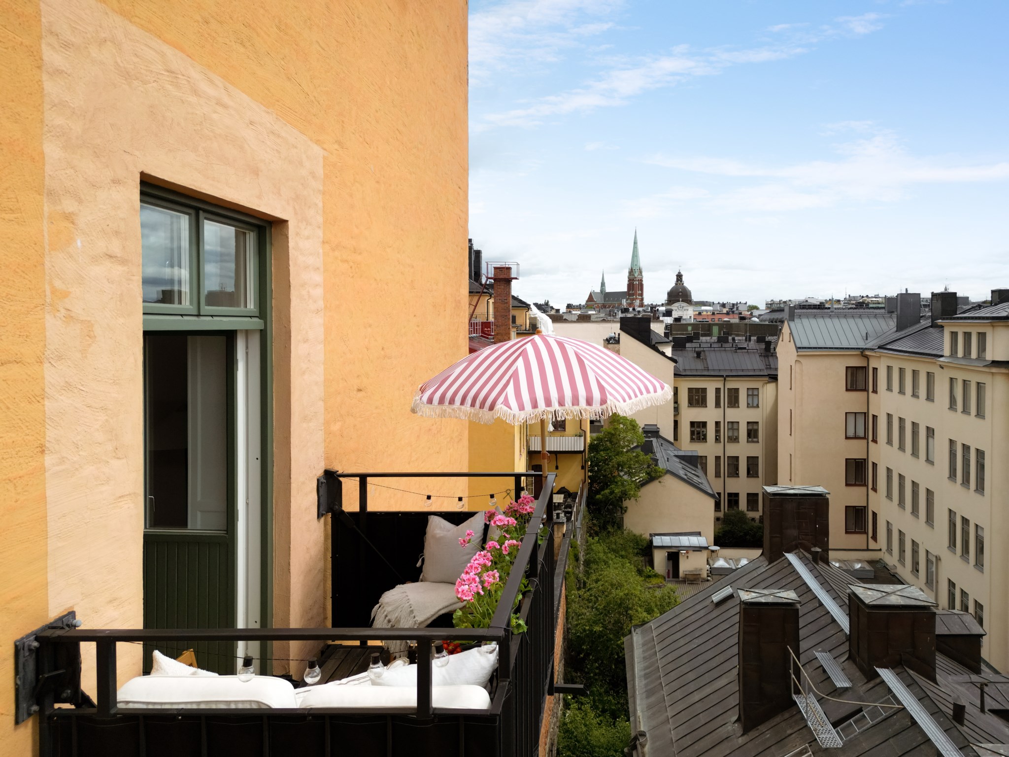 Sekeldröm med balkong i söderläge och utsikt över takåsarna, kakelugn och renoverat kök & badrum