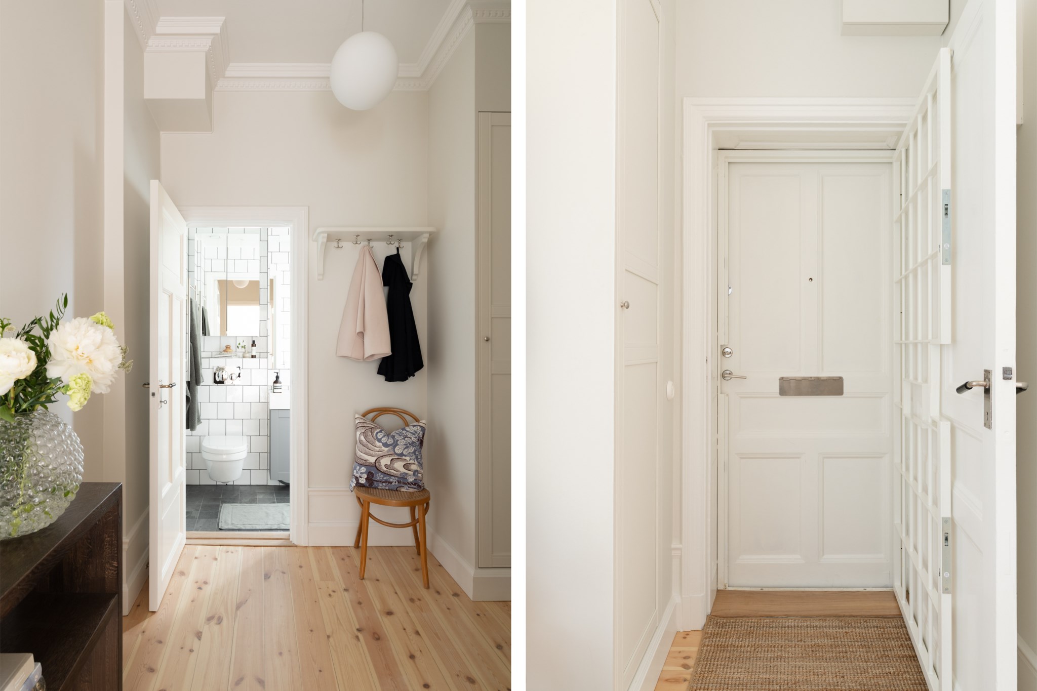 Välkomnande hall med generös takhöjd. Plats för avhängning i form av hatthylla, skoställ och annat avlastningsmöblemang efter önskemål. Ytskikten består av ljusa väggar och ljust trägolv. Generöst med förvaring via platsbyggd garderob.
